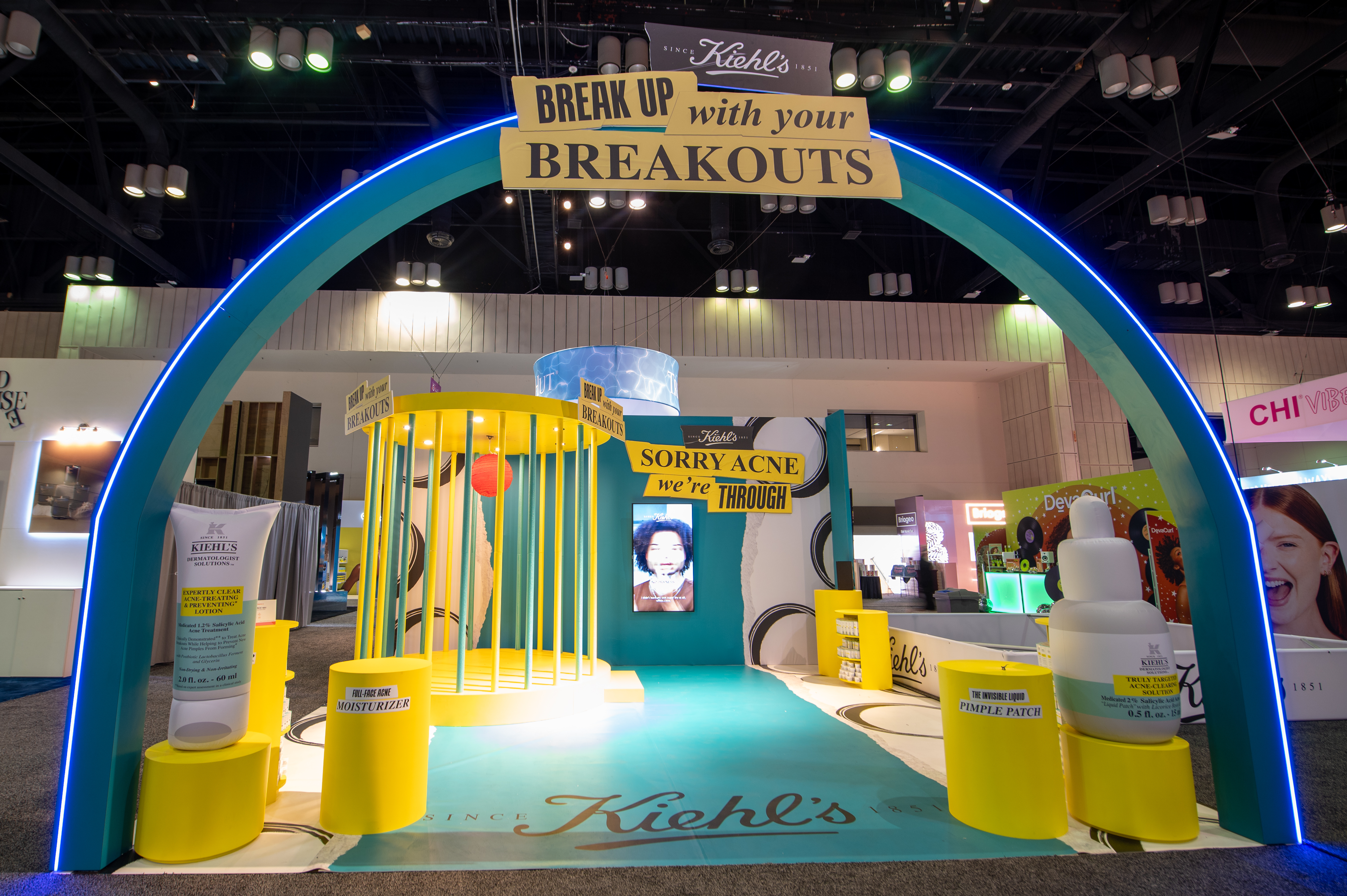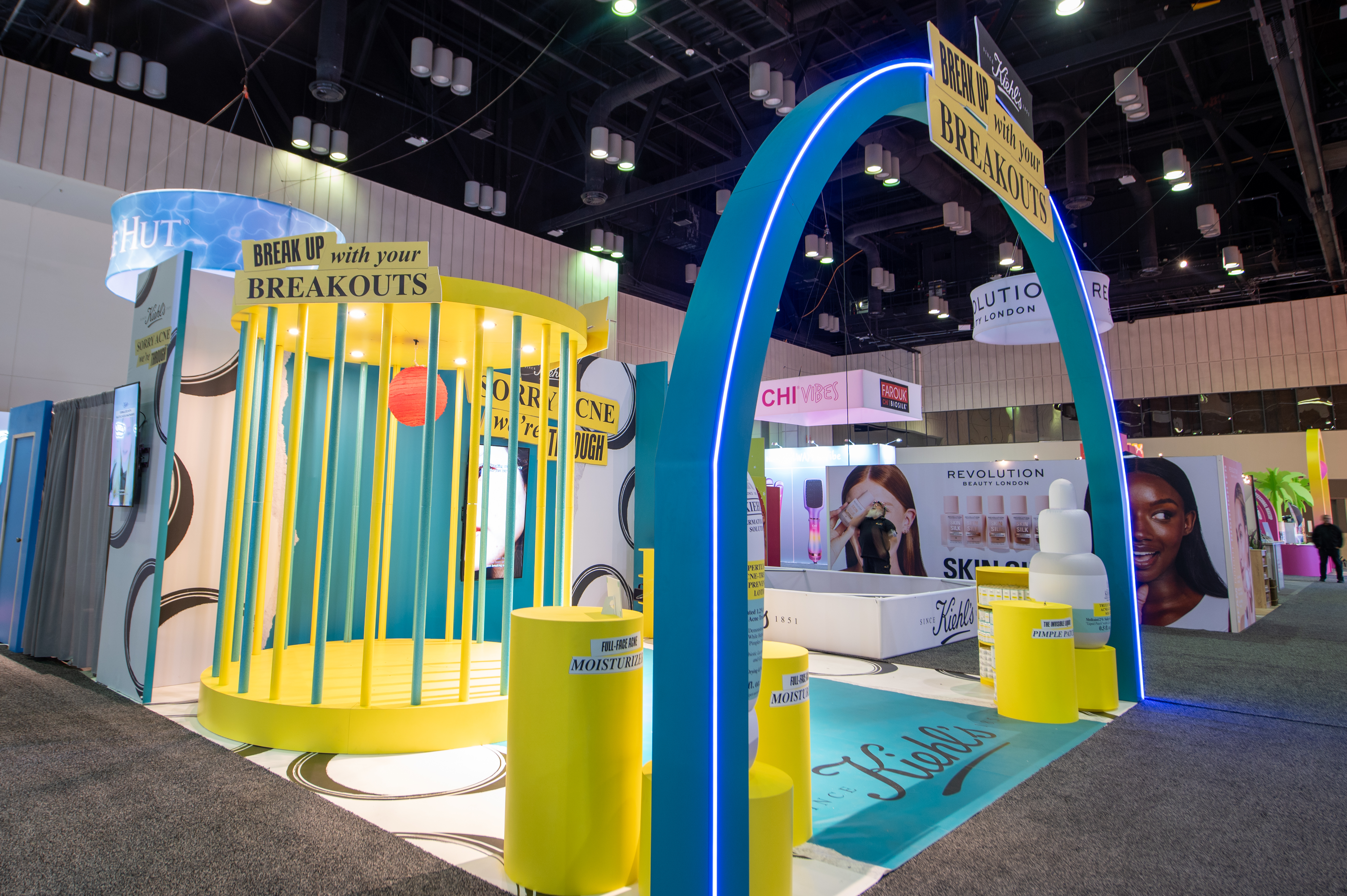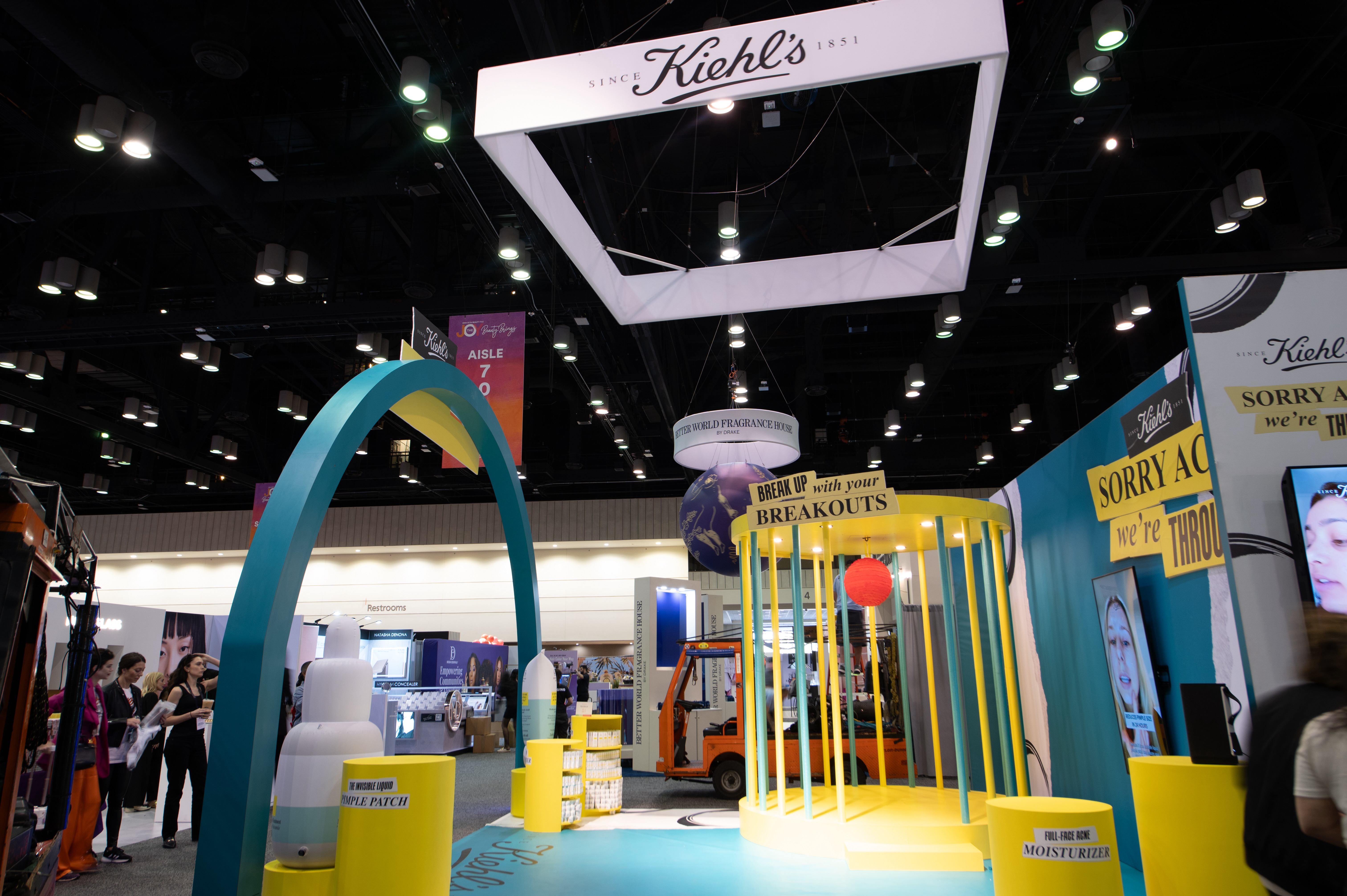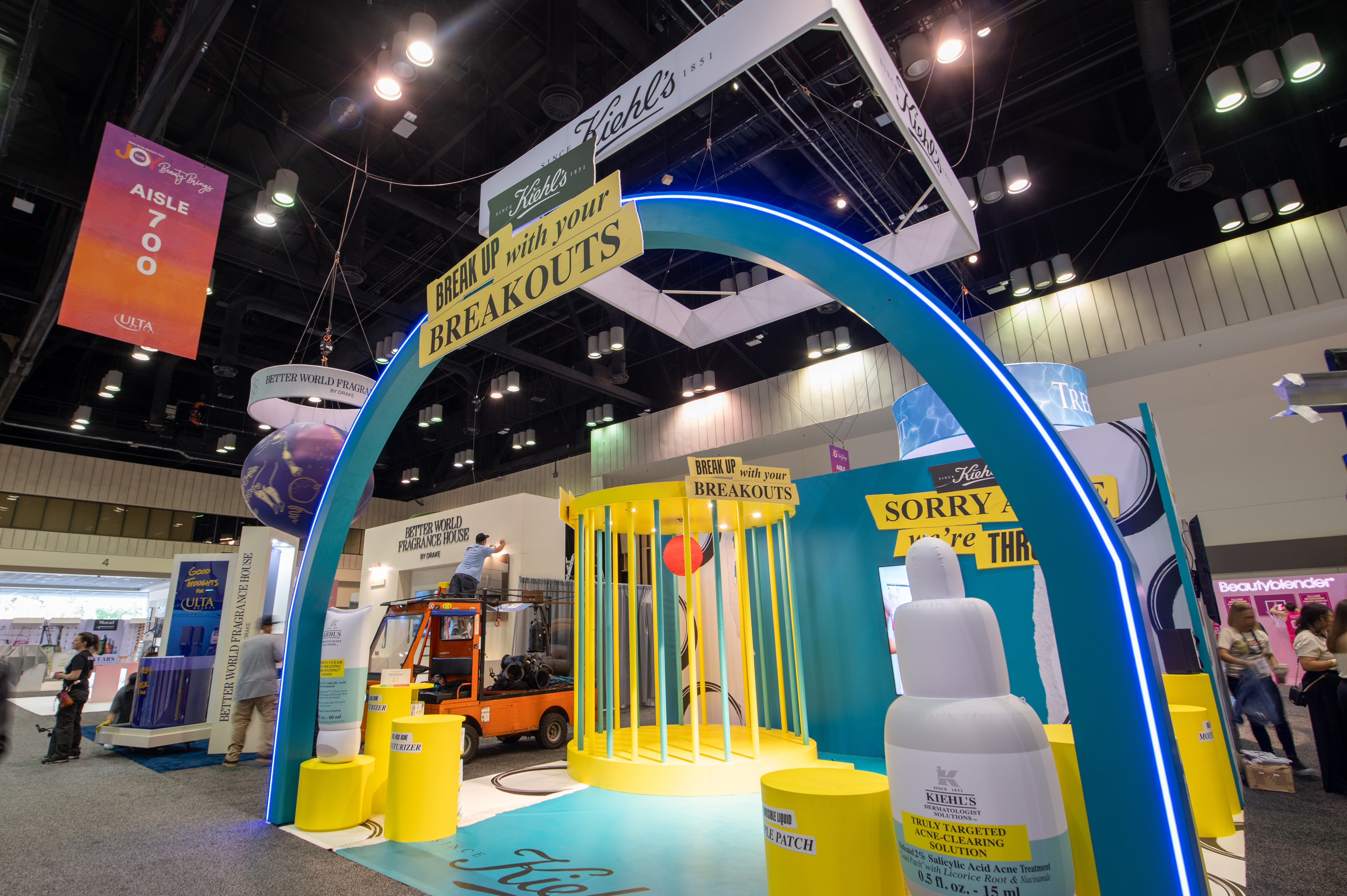 Duggal provided a booth setup for Kiehl's - L'Oréal USA at Kiehl's Ulta FLC 2024 Booth #721. The design featured a back wall with vinyl-wrapped SEG frame edges, a vibrant rainbow arch with integrated lighting, and branded header and back wall text. A unique cage structure with pool noodle bars added a playful element, while pedestals and lights enhanced the display. Duggal also managed logistics and installation, delivering a dynamic and engaging booth.
