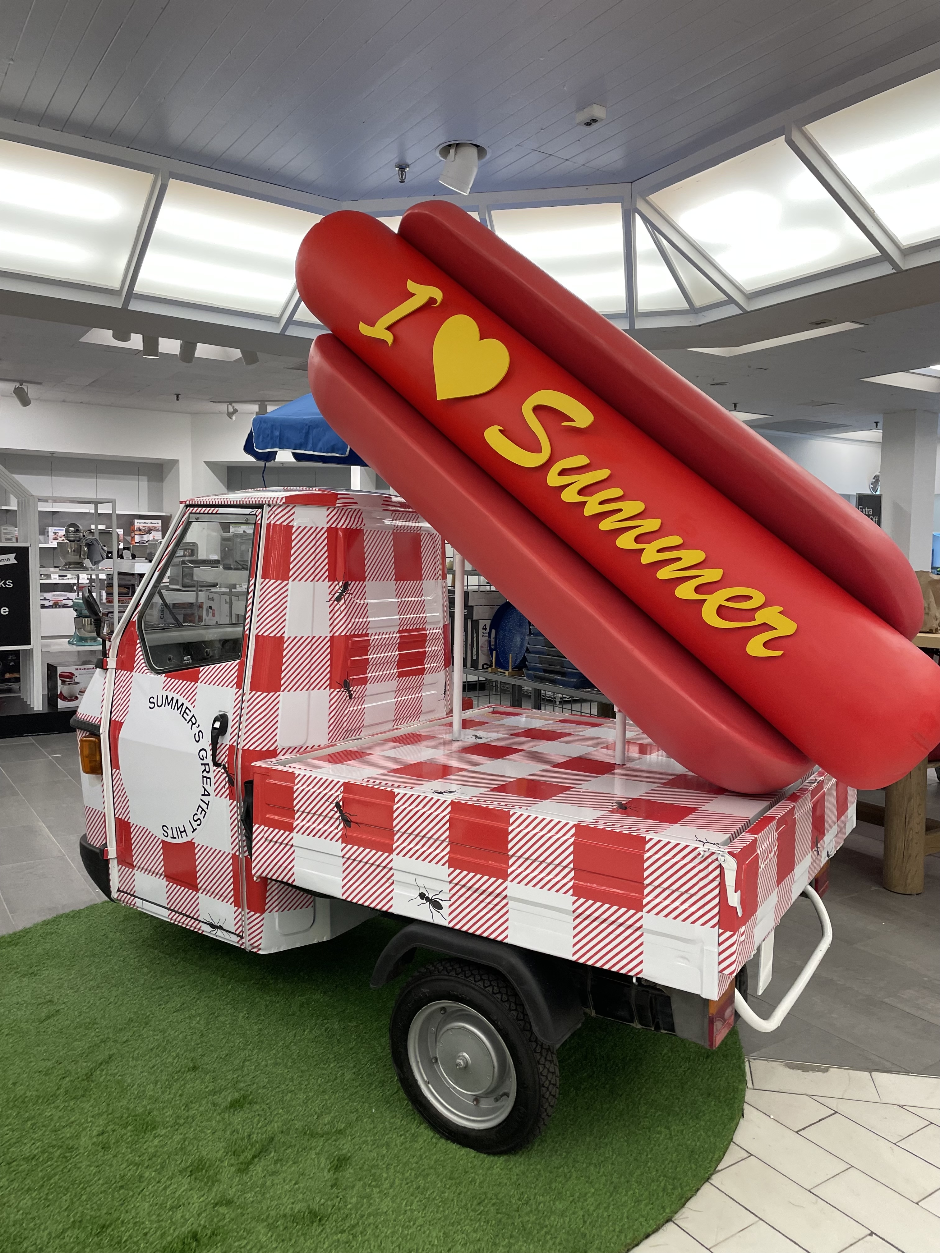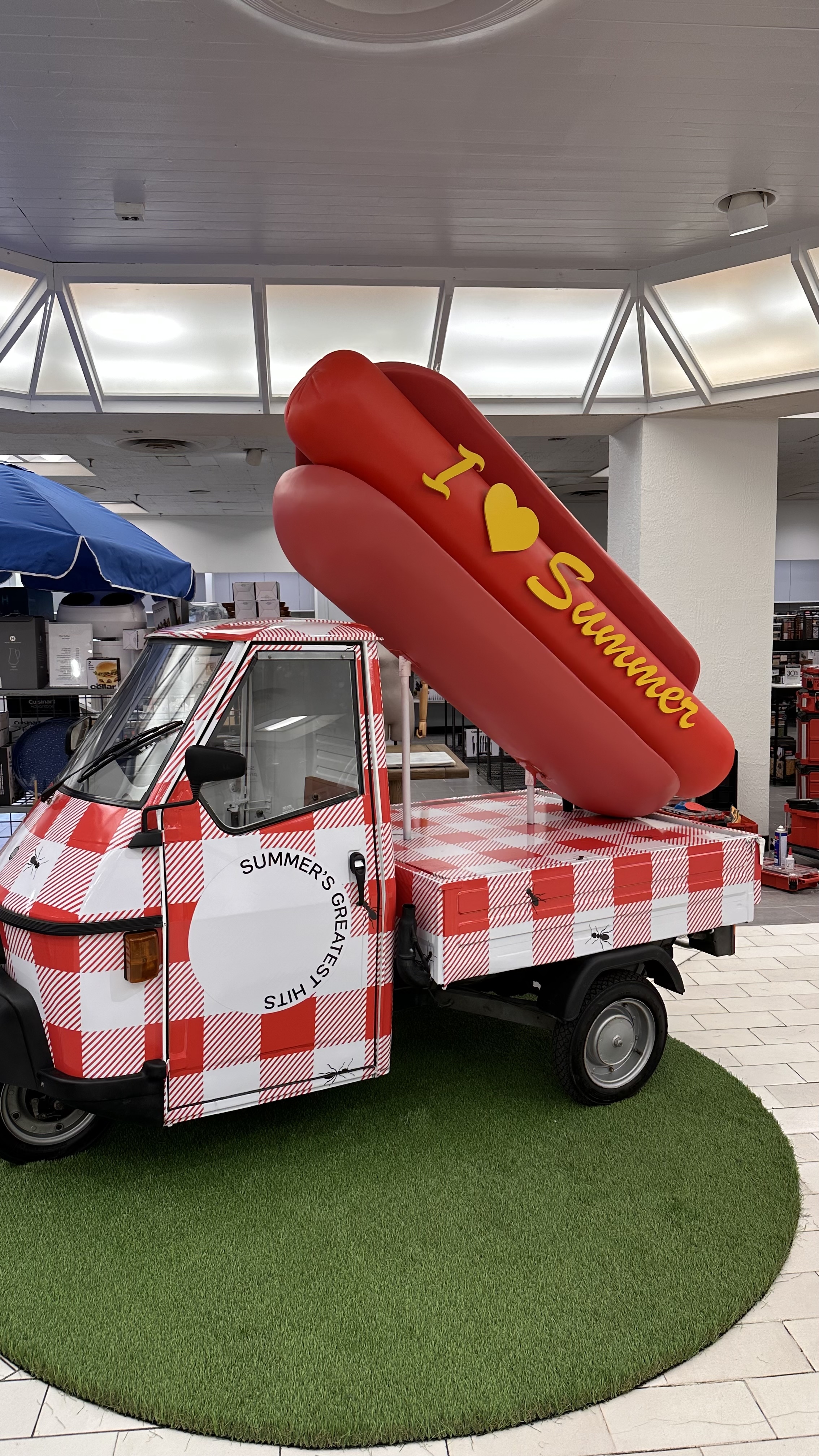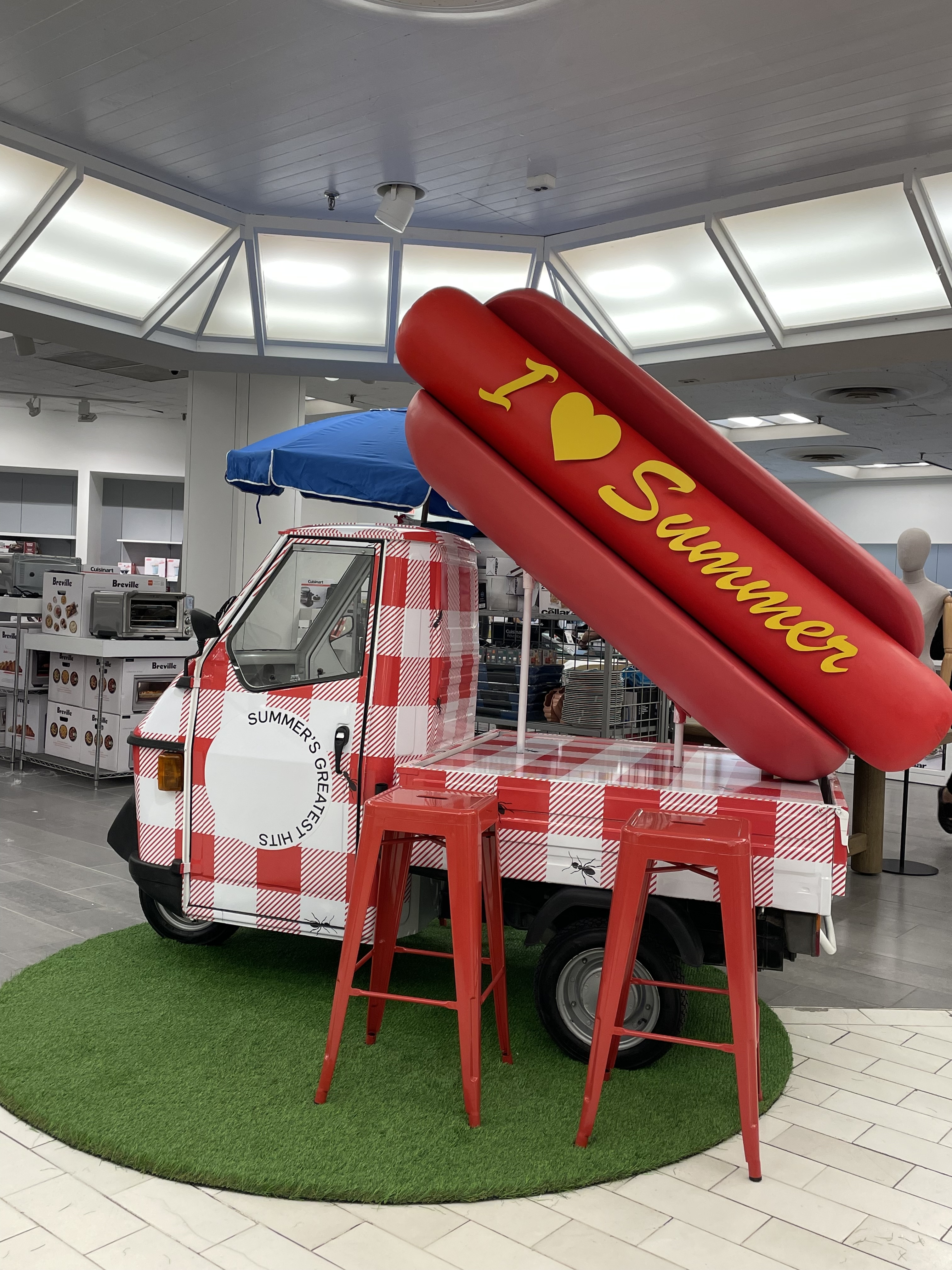 Duggal designed and fabricated vibrant large-scale props for Macy’s Garden State Plaza, bringing the essence of summer fun to life! The display featured playful, eye-catching elements like oversized ice cream cones, hot dogs, beach scenes, and surfing imagery, creating a lively atmosphere that captured the spirit of the season.