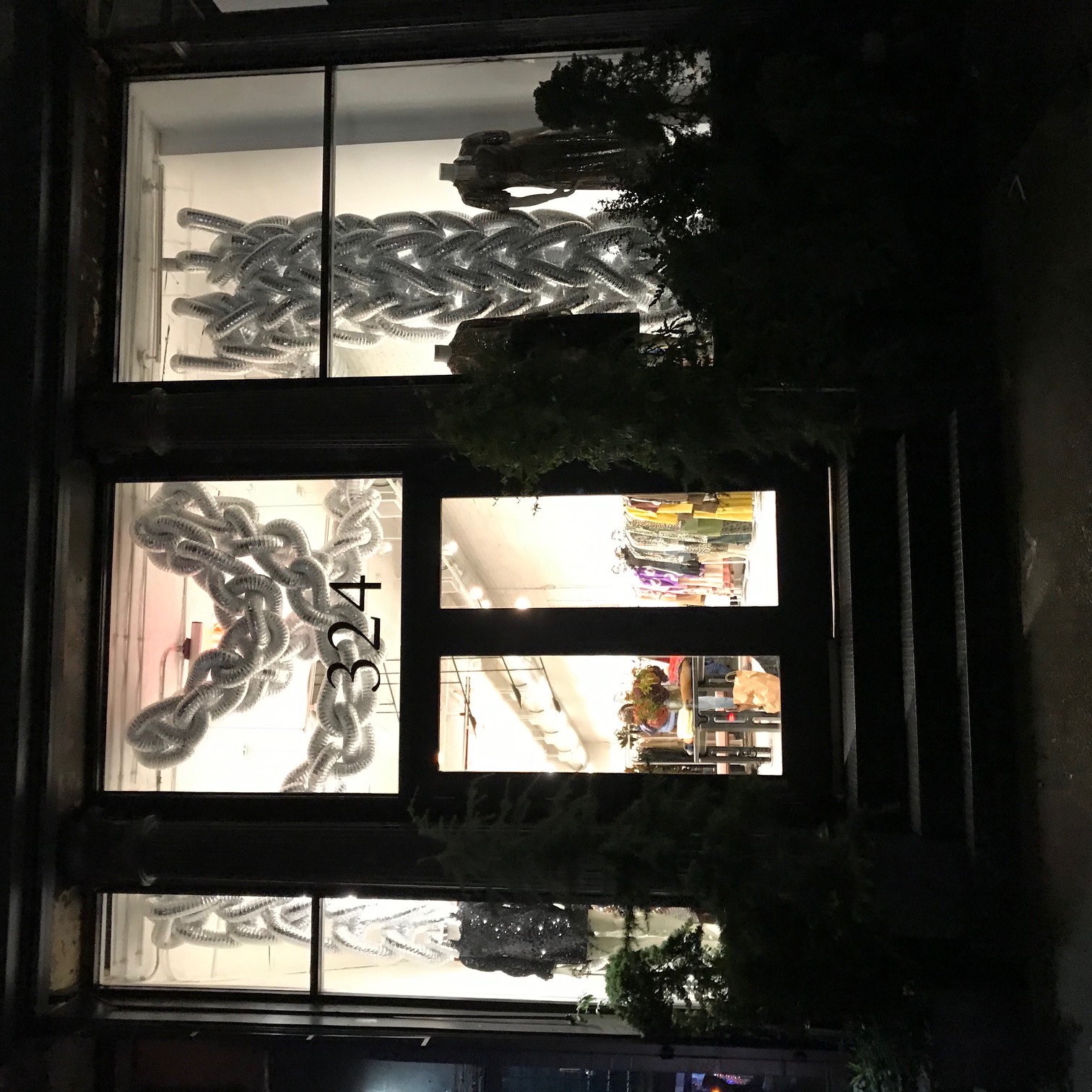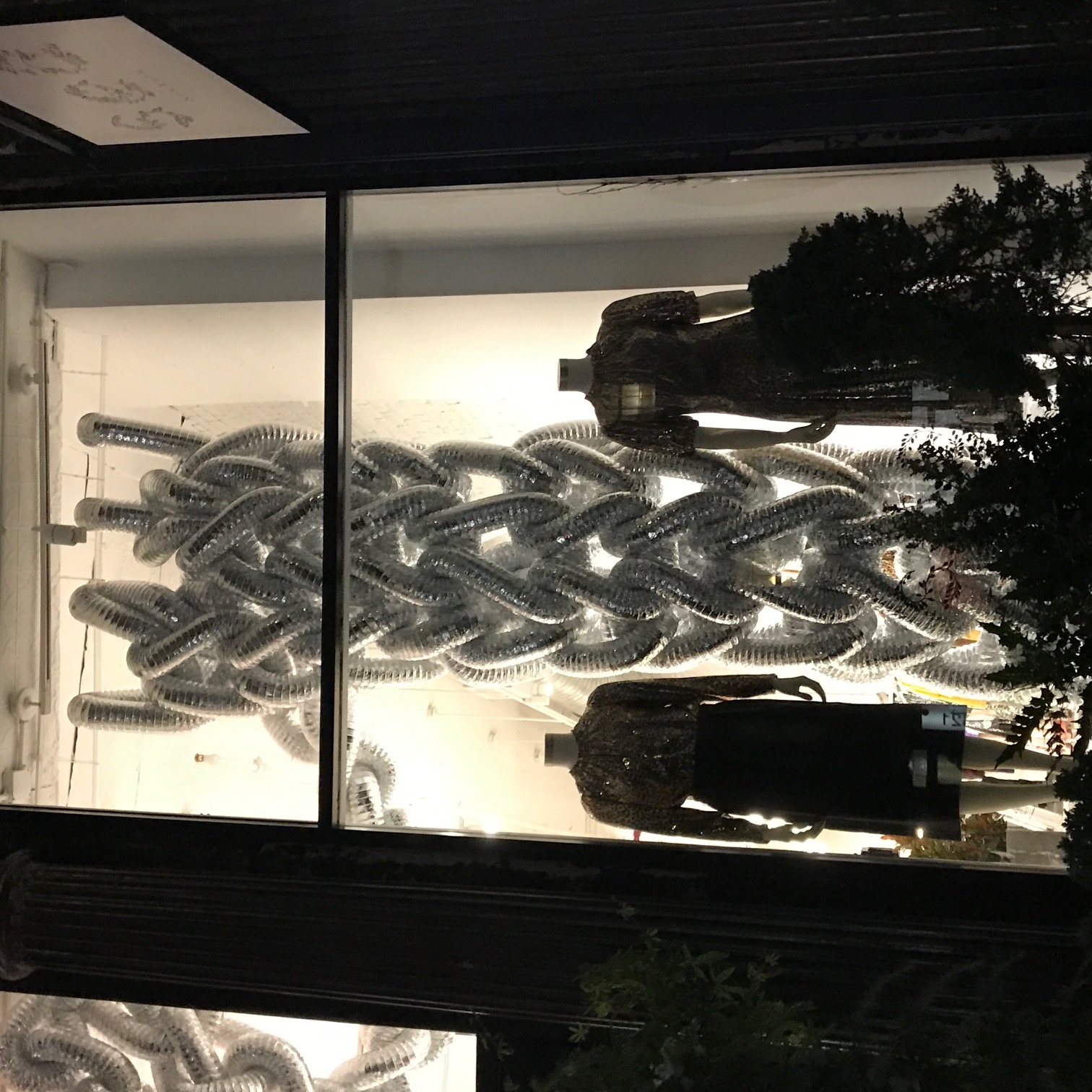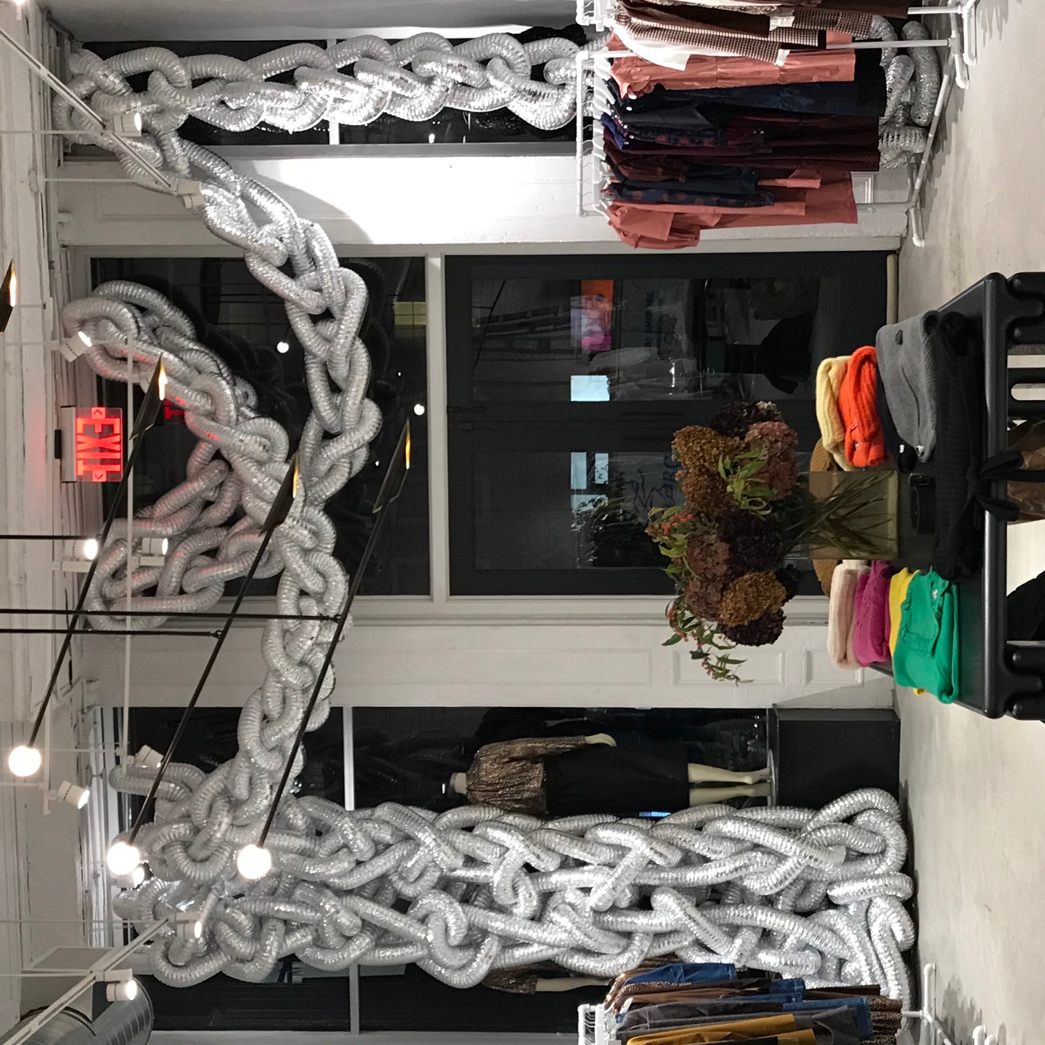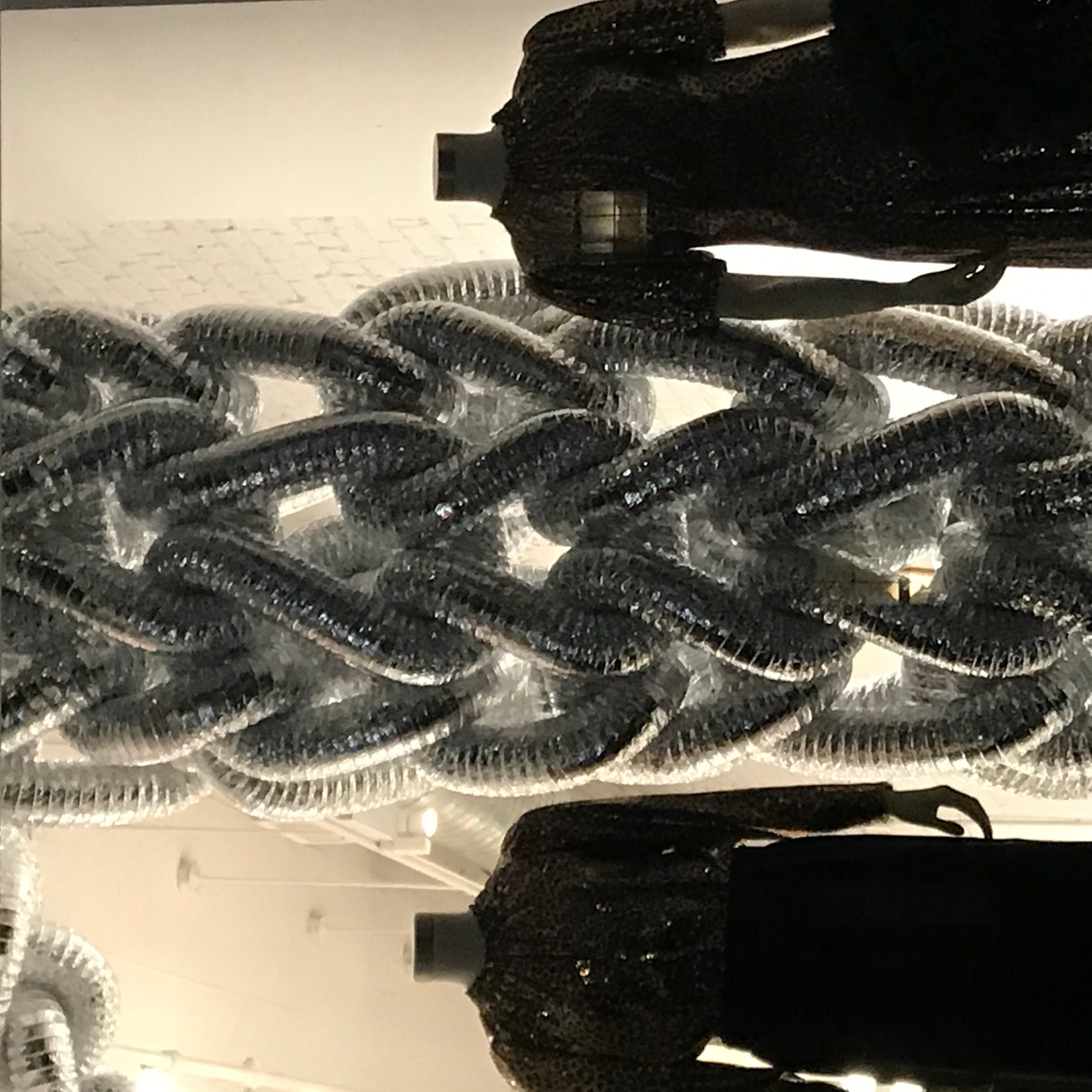 Knitted 4” flexible duct garland. Executed and installed By Aaron Sciandra and Lindsay Stadig. Designed by Lindsay.