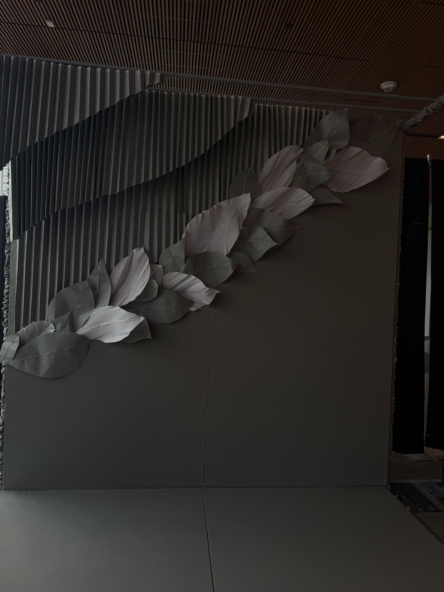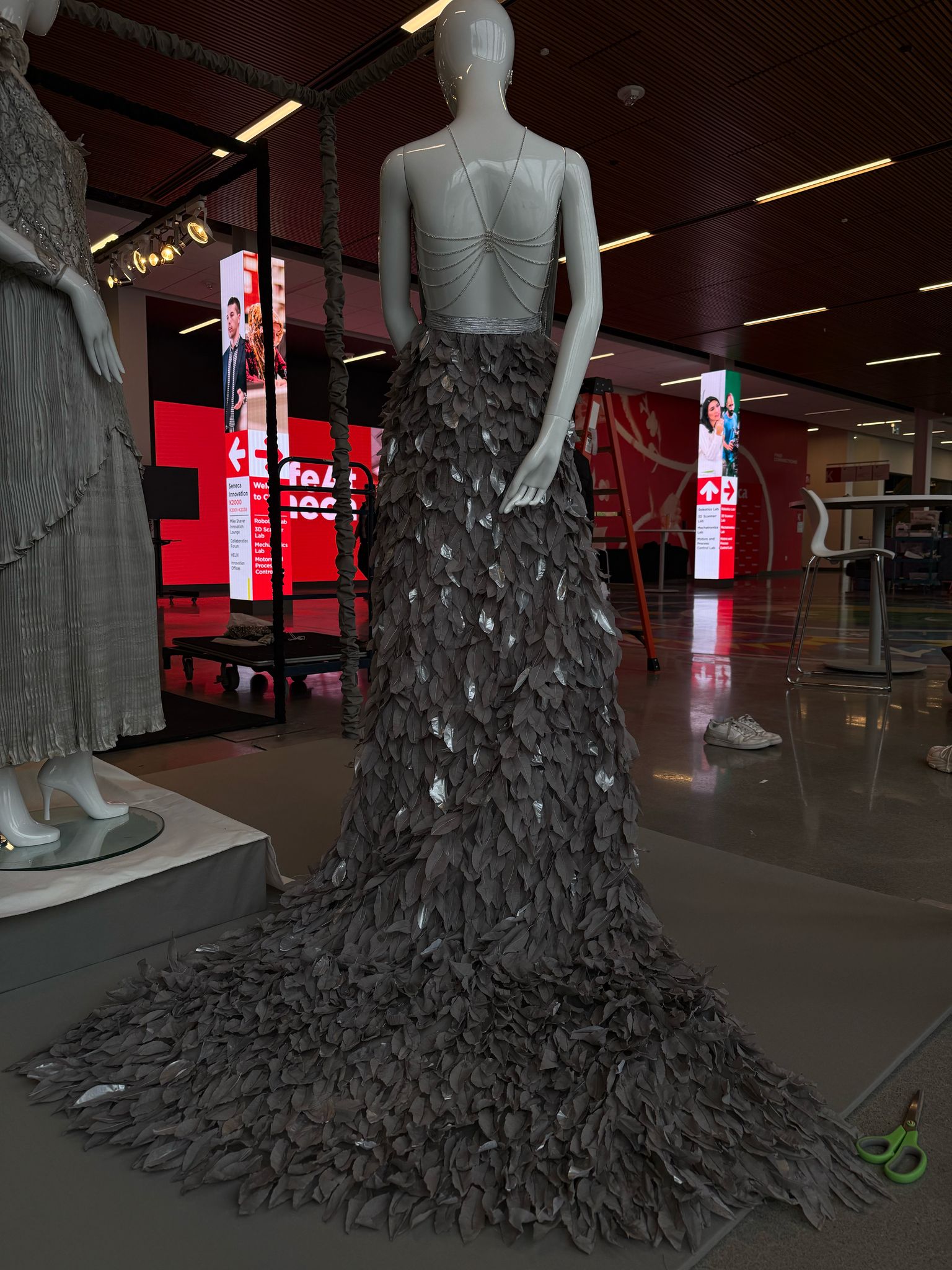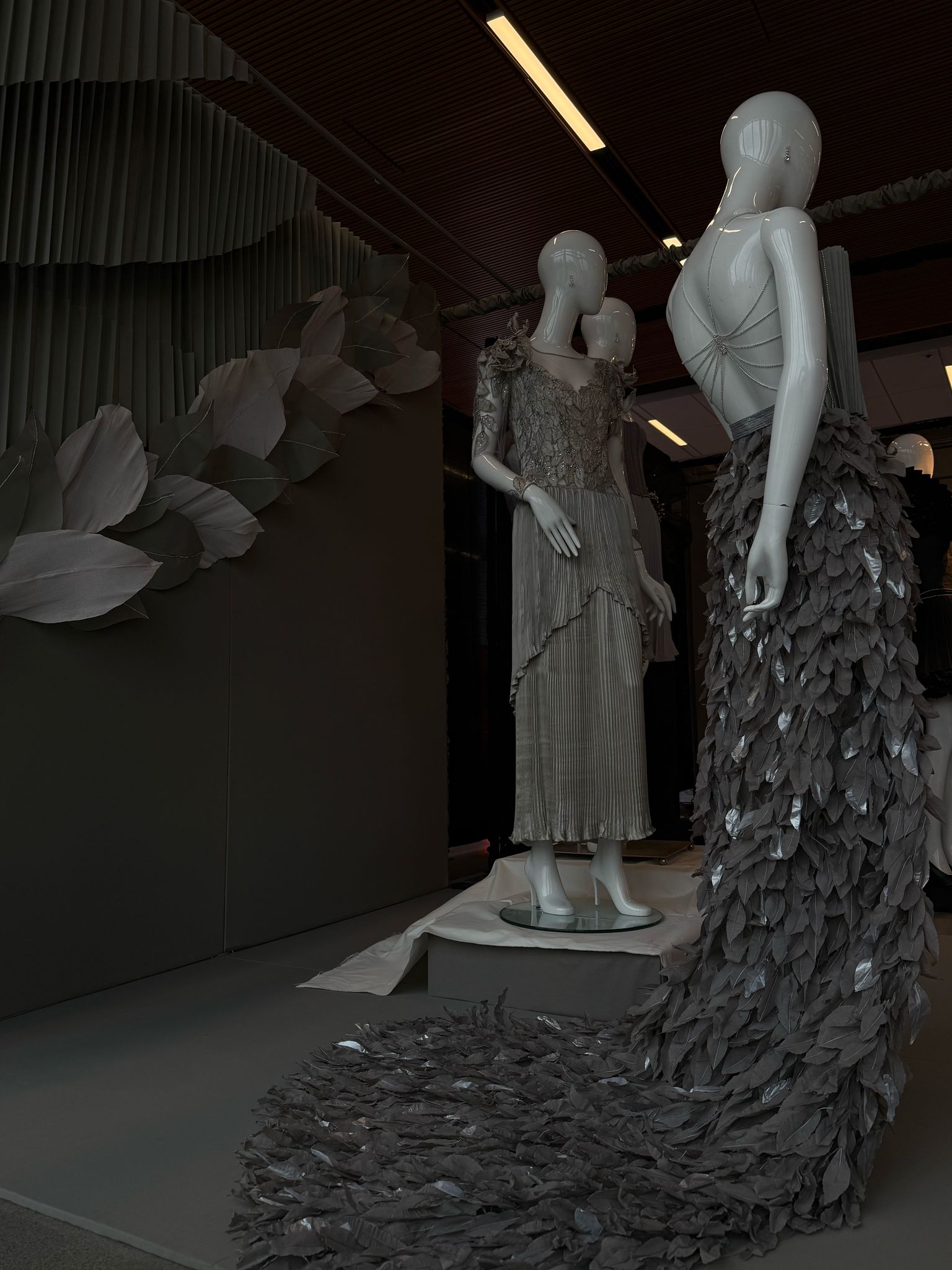 Color Drenching Installation: Light Grey Reverie Light Grey Reverie is an immersive installation that explores the quiet strength and elegance of light grey through a fashion narrative spanning time and technique. At the heart of the display stands a stunning 1980s gown, featured on the central mannequin. With its graceful pleats, delicate leaf motifs, and sparkling rhinestone embellishments, the gown anchors the installation and inspires every surrounding element. The mannequins are arranged to evoke the glamorous moment of descending a staircase for a red-carpet premiere or gala photo op. This dynamic, diagonal formation not only enhances the sense of movement and drama, but also mirrors the flow of the custom-designed backdrop, creating a seamless visual rhythm throughout the booth. To the left, the second mannequin wears a modern interpretation of the vintage gown. Clean lines and contemporary tailoring are softened by pleated accents and botanical-inspired forms, while rhinestones are reimagined as elegant, minimalist jewelry—offering a subtle sparkle that bridges past and present. To the right, the third mannequin introduces a sculptural, handcrafted presence. Made entirely from paper, it features a long, flowing skirt composed of individually hand-cut and pasted leaves. Its jewelry, handmade from rhinestones, adds a refined shimmer and honors the intricate embellishment of the original gown through a fresh, tactile lens. Drenched entirely in shades of light grey, the installation achieves a cohesive and immersive atmosphere. The repetition of the gown’s core design elements—pleats, leaves, and rhinestones—across all mannequins and the backdrop reinforces a unified visual story. Through its thoughtful composition and storytelling, Light Grey Reverie captures a moment of timeless glamour reimagined for today - Winner of Redefining Design 2025(Seneca Polytechnic)