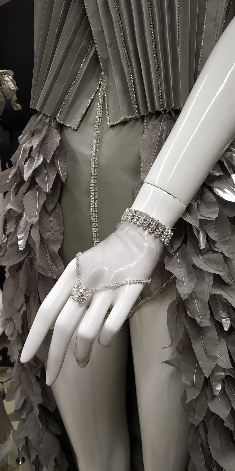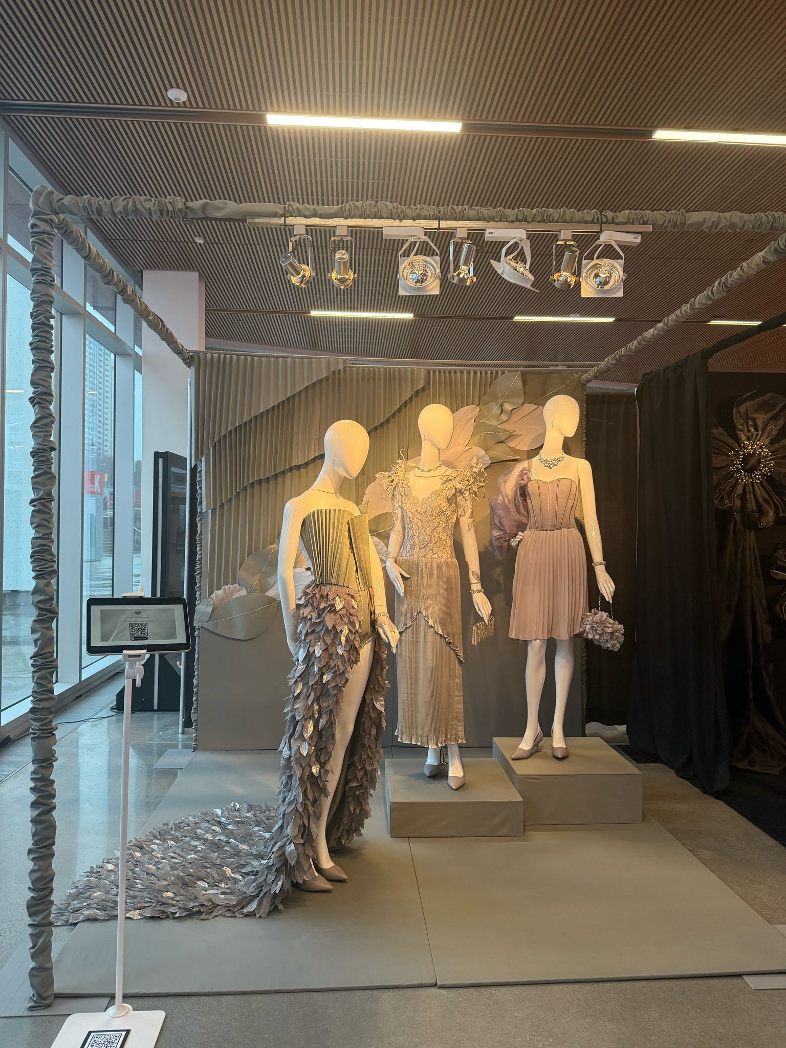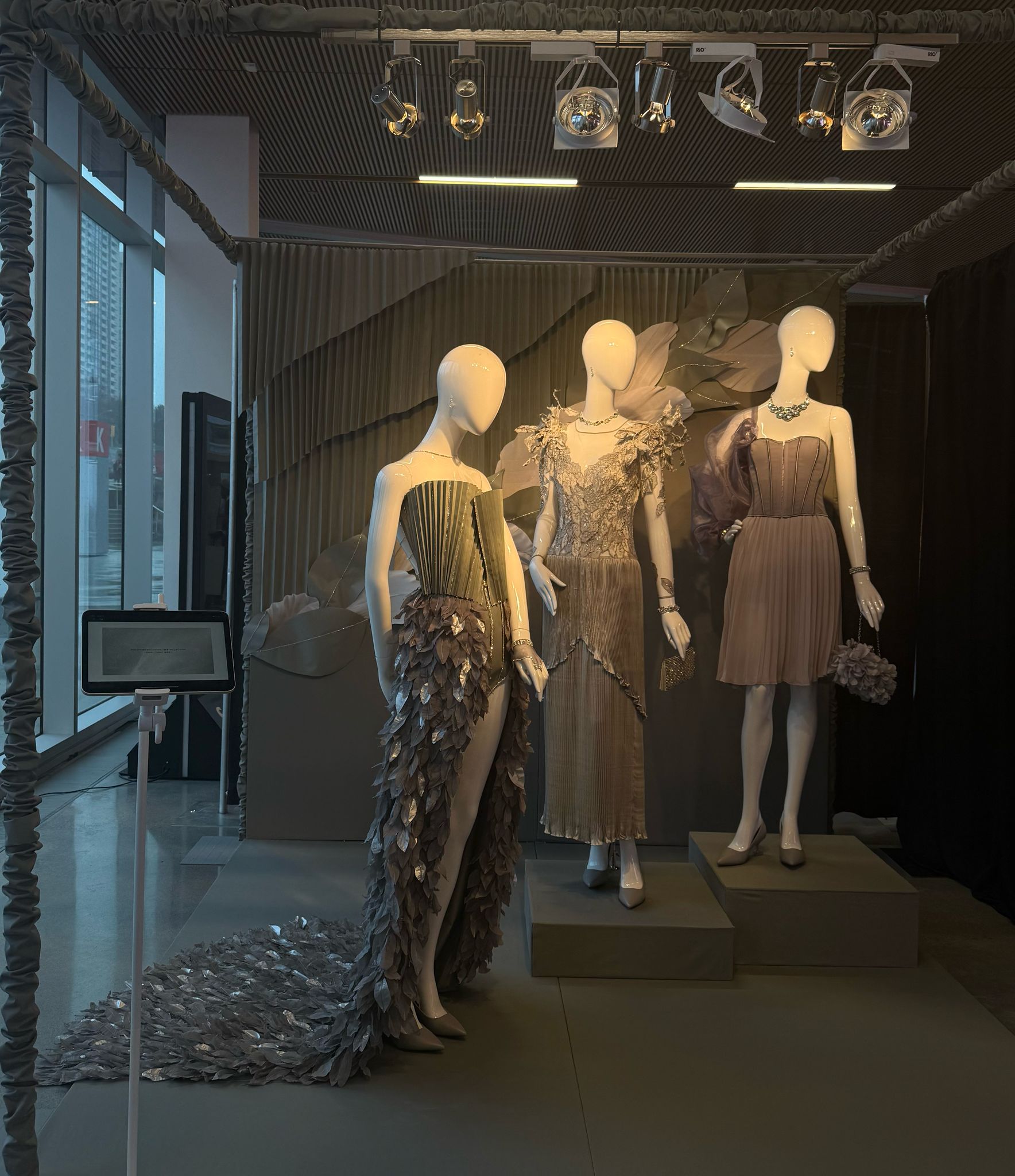 Color Drenching Installation: Light Grey Reverie Light Grey Reverie is an immersive installation that explores the quiet strength and elegance of light grey through a fashion narrative spanning time and technique. At the heart of the display stands a stunning 1980s gown, featured on the central mannequin. With its graceful pleats, delicate leaf motifs, and sparkling rhinestone embellishments, the gown anchors the installation and inspires every surrounding element. The mannequins are arranged to evoke the glamorous moment of descending a staircase for a red-carpet premiere or gala photo op. This dynamic, diagonal formation not only enhances the sense of movement and drama, but also mirrors the flow of the custom-designed backdrop, creating a seamless visual rhythm throughout the booth. To the left, the second mannequin wears a modern interpretation of the vintage gown. Clean lines and contemporary tailoring are softened by pleated accents and botanical-inspired forms, while rhinestones are reimagined as elegant, minimalist jewelry—offering a subtle sparkle that bridges past and present. To the right, the third mannequin introduces a sculptural, handcrafted presence. Made entirely from paper, it features a long, flowing skirt composed of individually hand-cut and pasted leaves. Its jewelry, handmade from rhinestones, adds a refined shimmer and honors the intricate embellishment of the original gown through a fresh, tactile lens. Drenched entirely in shades of light grey, the installation achieves a cohesive and immersive atmosphere. The repetition of the gown’s core design elements—pleats, leaves, and rhinestones—across all mannequins and the backdrop reinforces a unified visual story. Through its thoughtful composition and storytelling, Light Grey Reverie captures a moment of timeless glamour reimagined for today - Winner of Redefining Design 2025(Seneca Polytechnic)