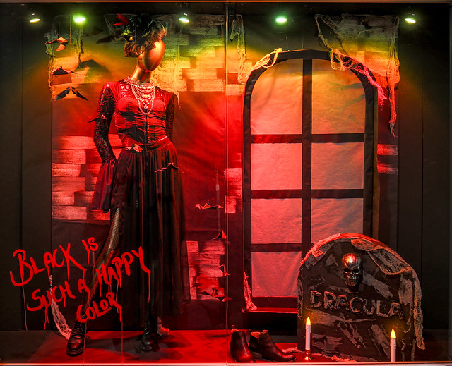This display blends vintage horror with contemporary fashion, creating a striking visual narrative that captures the timeless allure of the macabre.