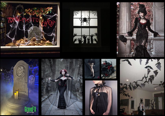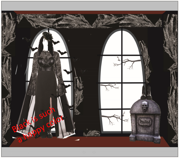Step into a gothic world where Bram Stoker’s Dracula meets high fashion in this hauntingly stylish window display. A mannequin dressed in a black and crimson lace top, cinched with a black corset and paired with a thigh-high split skirt and boots, stands at the heart of the scene. Statement silver jewelry adds a touch of eerie elegance to the look, while the figure is surrounded by a flurry of bats, bringing dynamic movement to the stillness of the display.