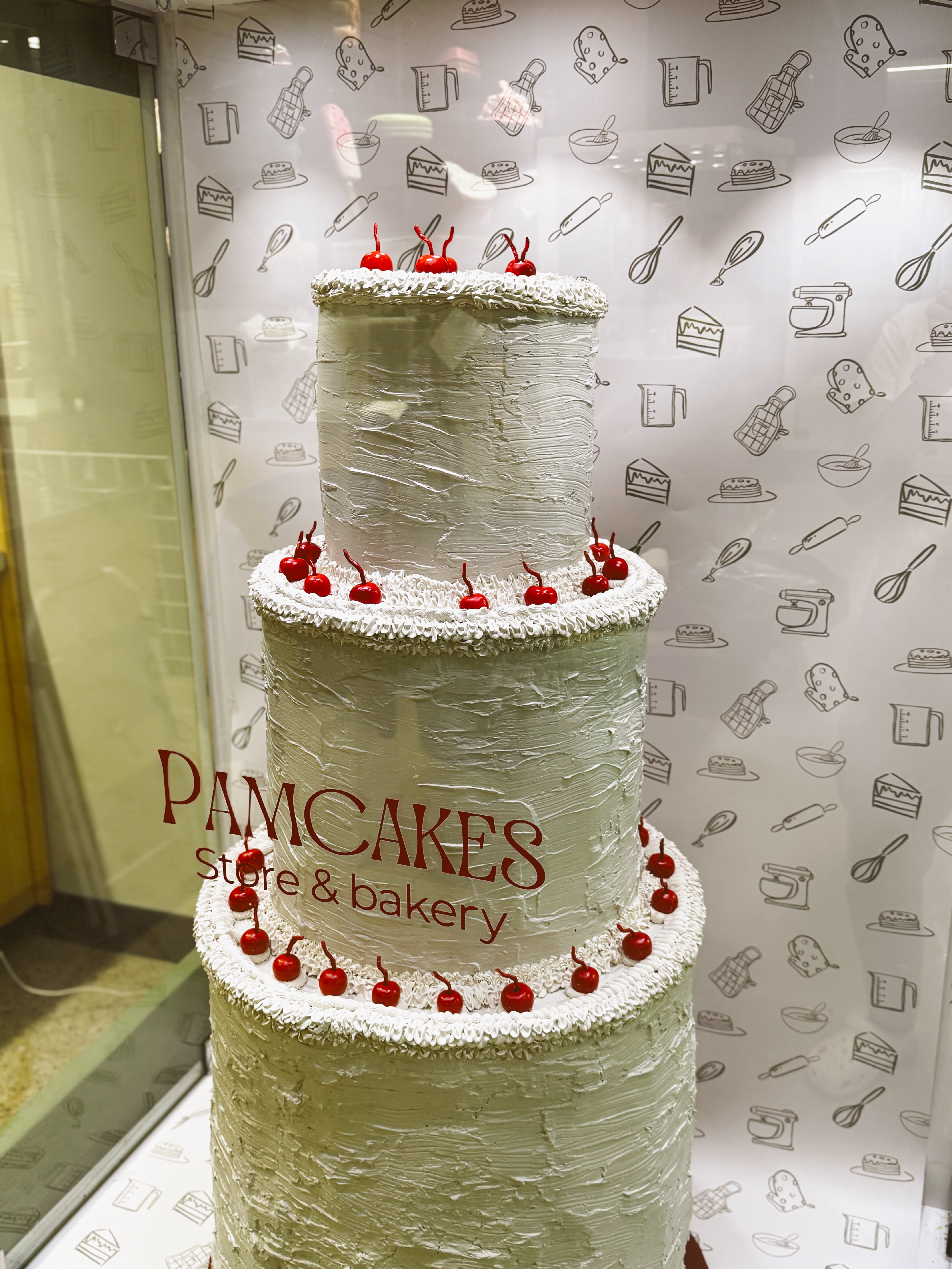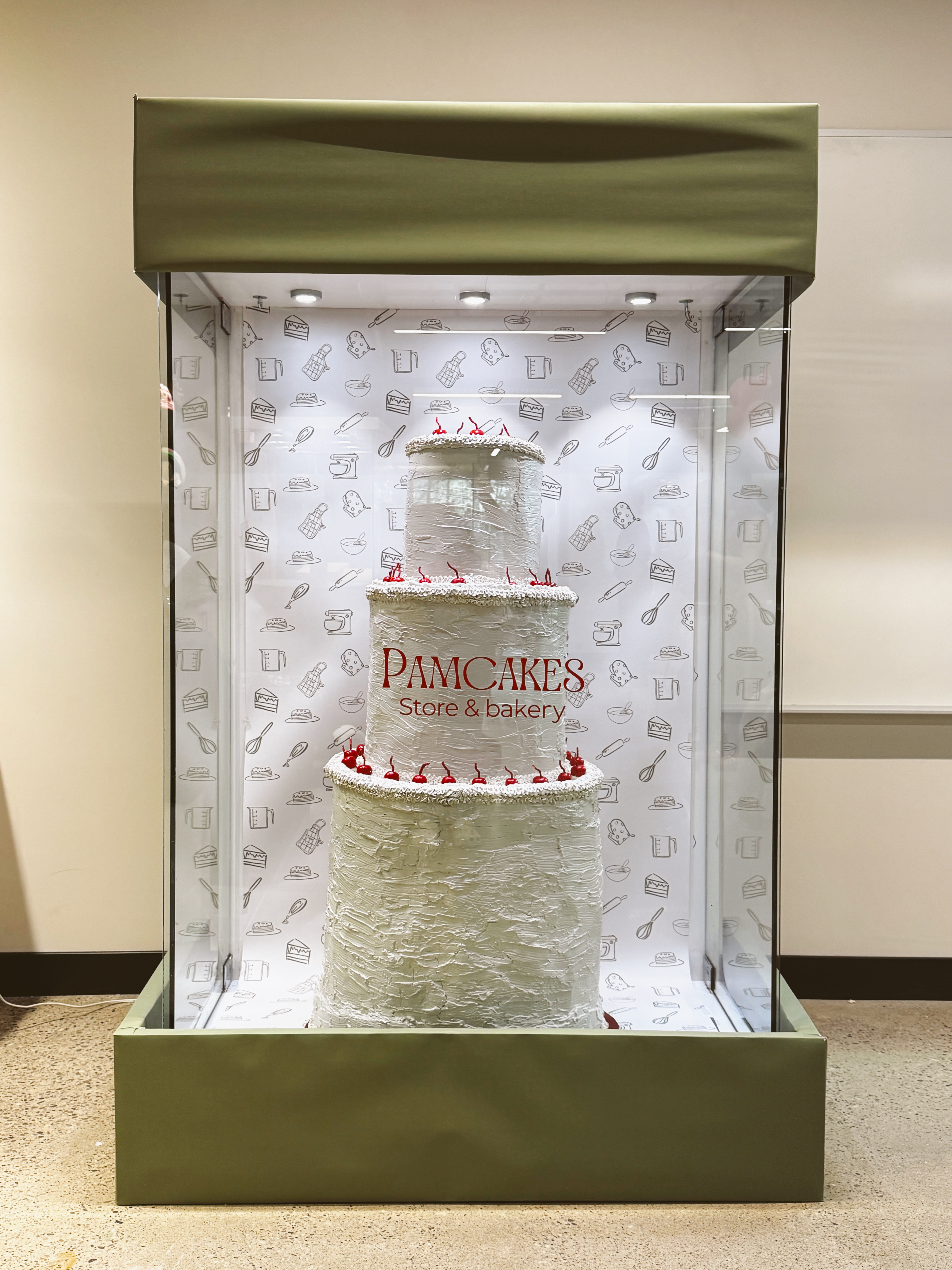 As part of my Capstone project, I designed a window display for Pamcakes—a fictional store and bakery created entirely from scratch. The concept? A giant cake box brought to life. The display was imagined as a whimsical oversized packaging for a cake, inviting everyone to step into the sweetness of Pamcakes. The prop was handcrafted using foam board, foam spray, foam blocks, foam clay, Fast’n Final, and drywall compound. To complete the scene, I illustrated a cozy kitchen-themed background, highlighting the baking tools and utensils also sold in the store. The cake box structure was built with foam board, tying it all together in a charming, larger-than-life display designed to make people smile.