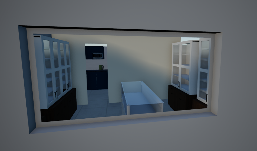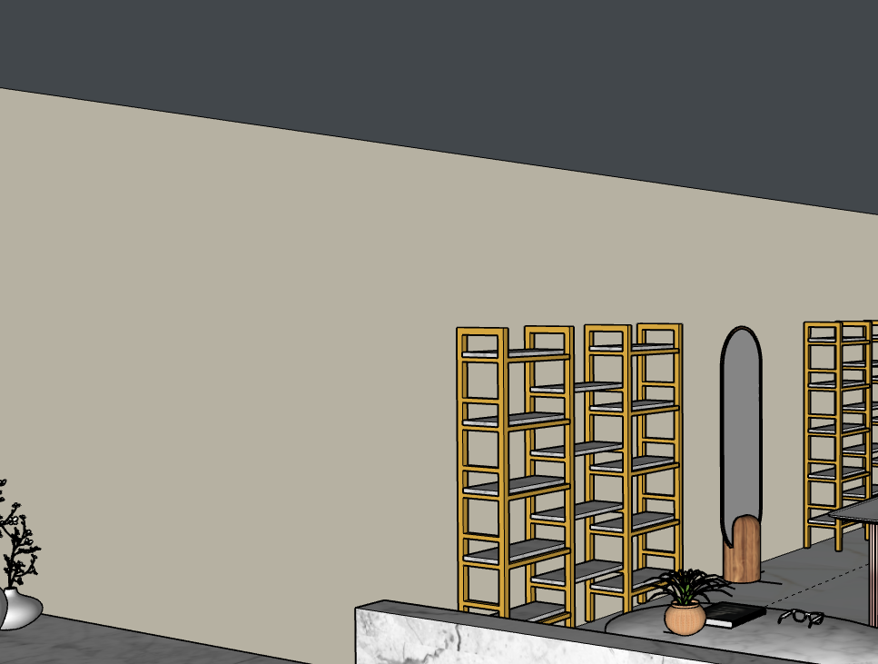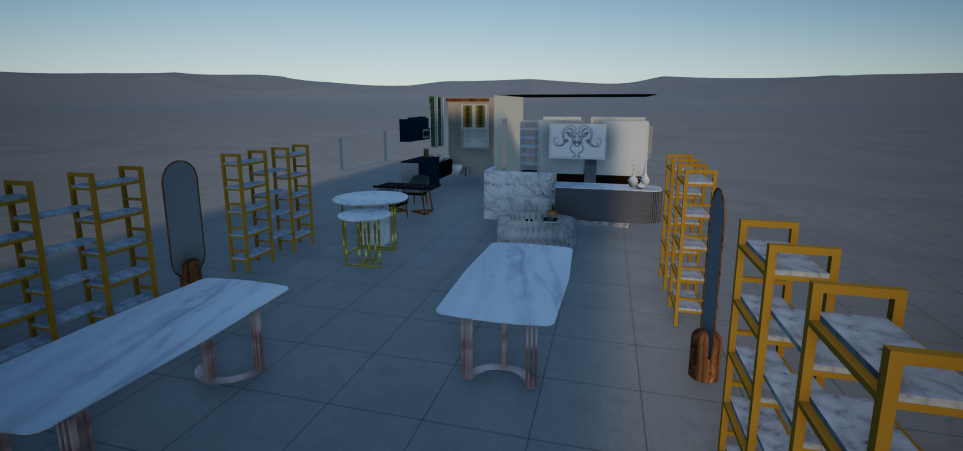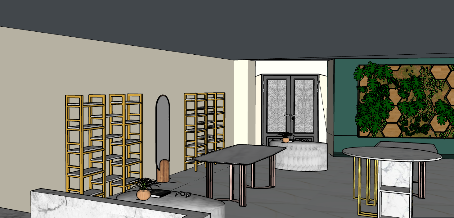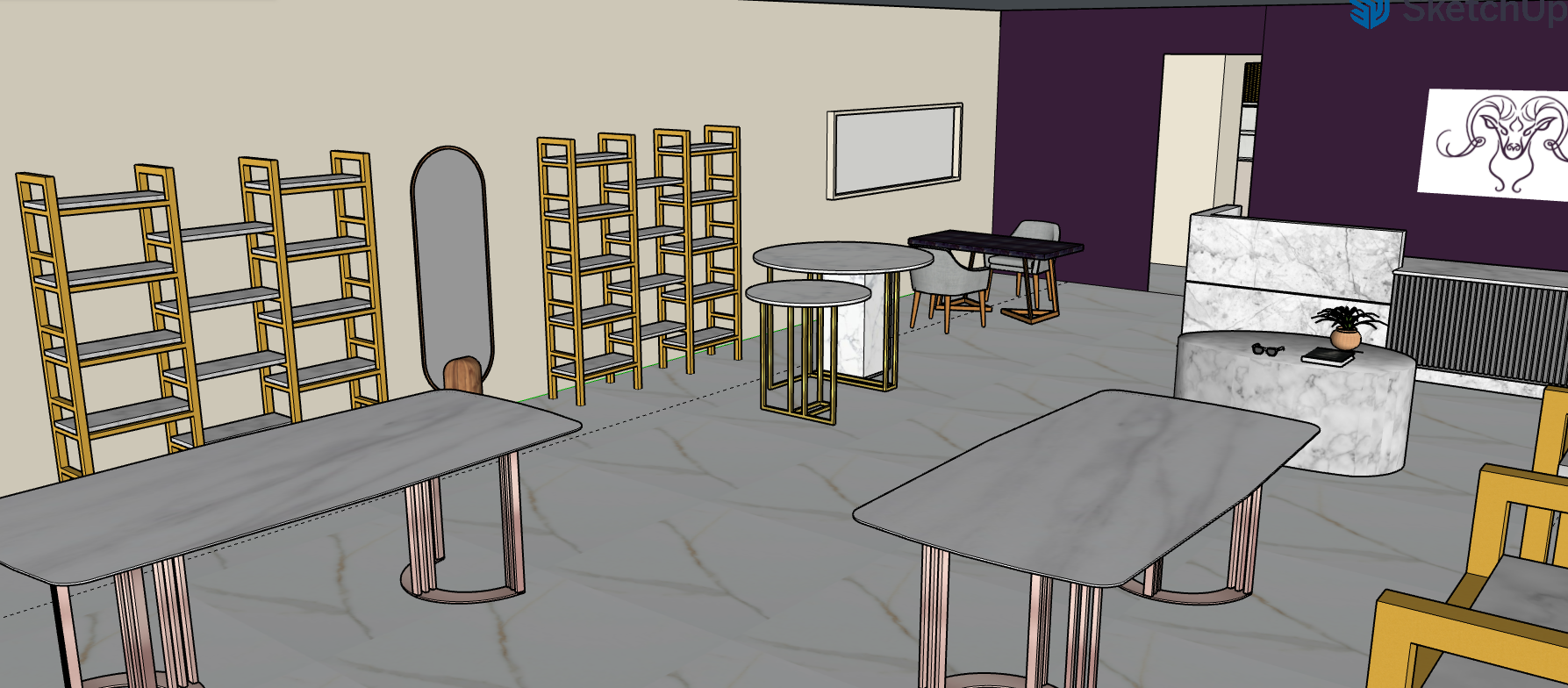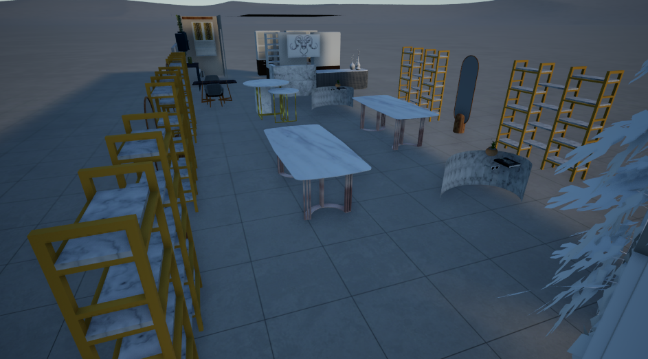 To showcase our collection, I selected elegant gold and glass shelves, complemented by stylish nesting tables, creating a refined display for our products.