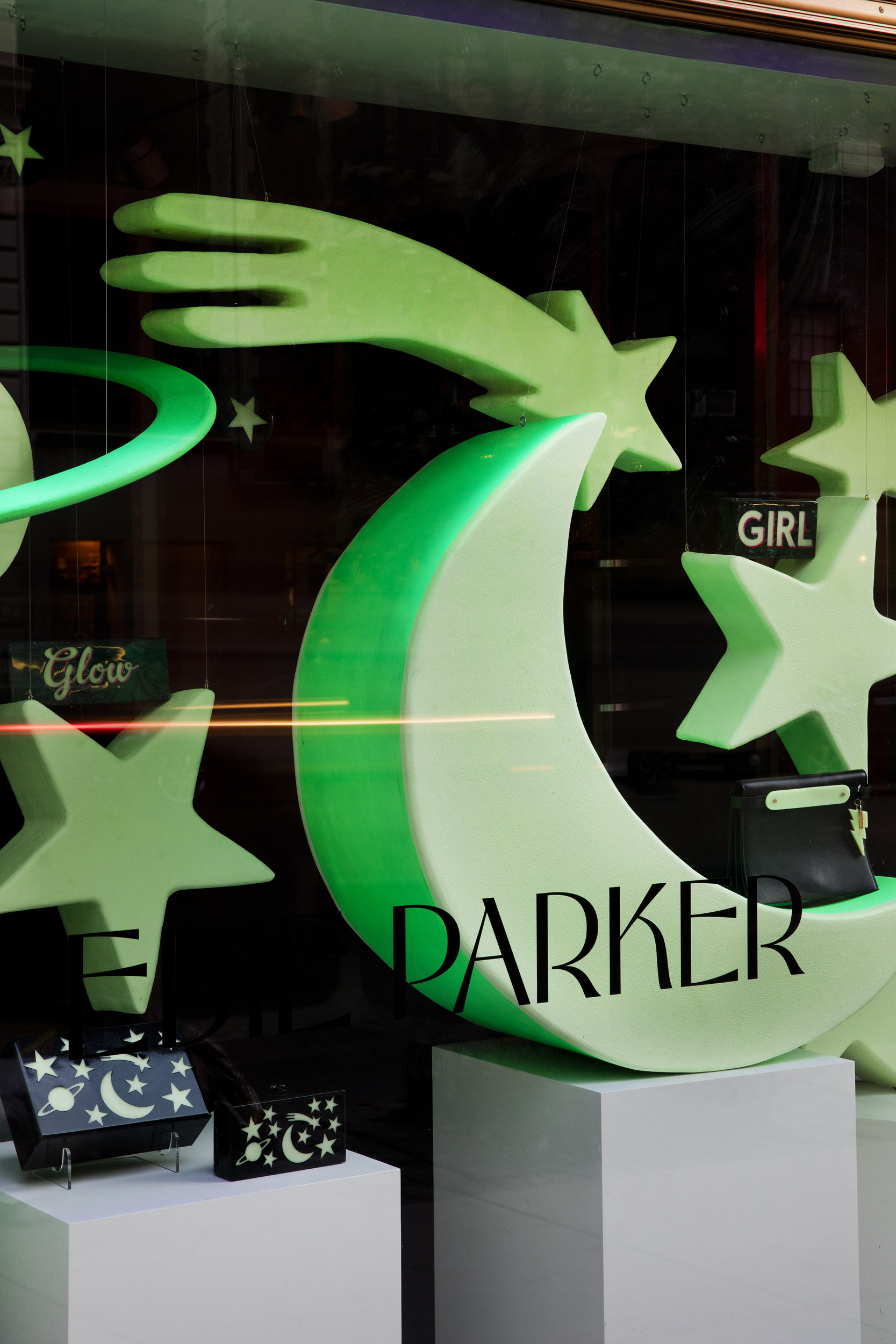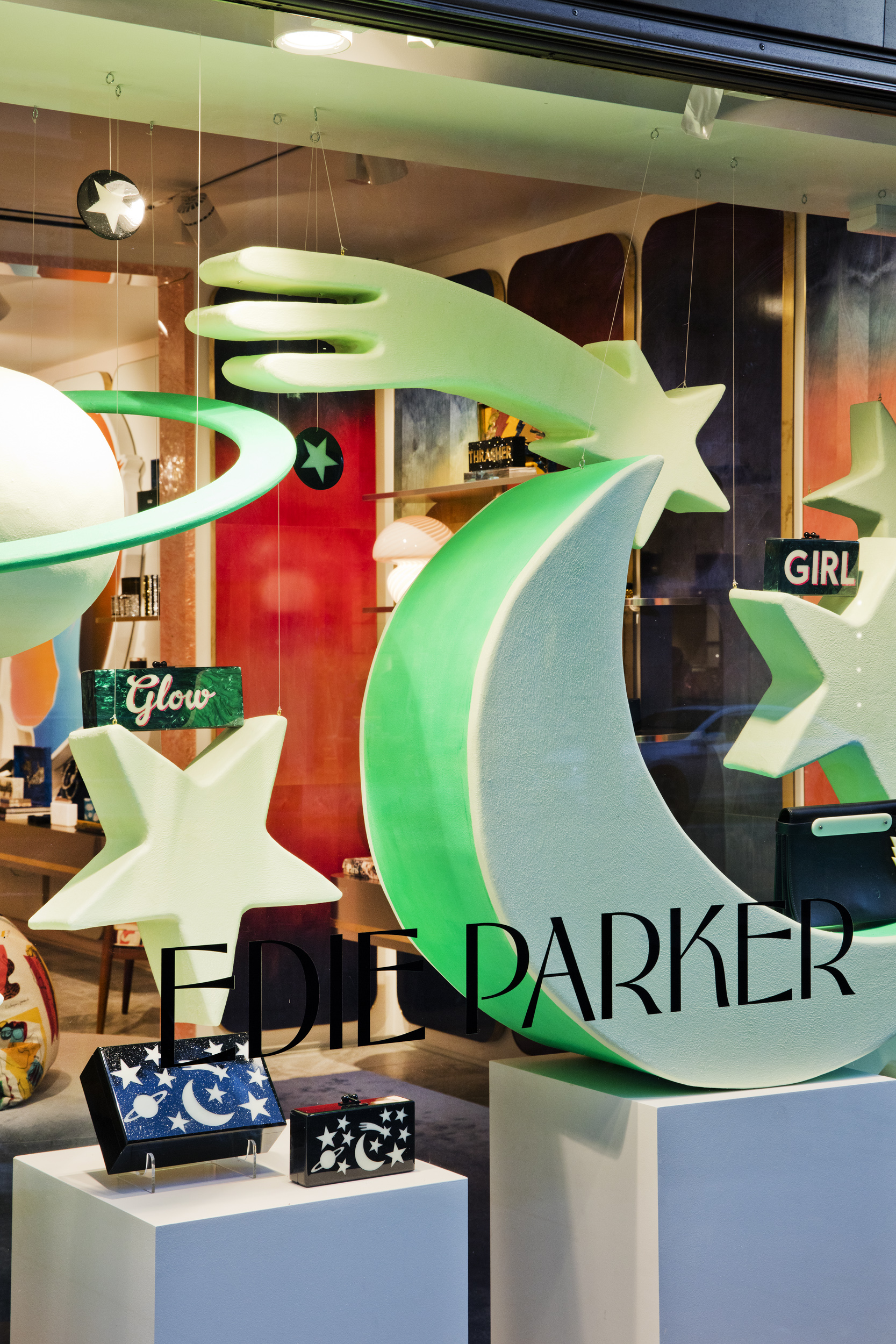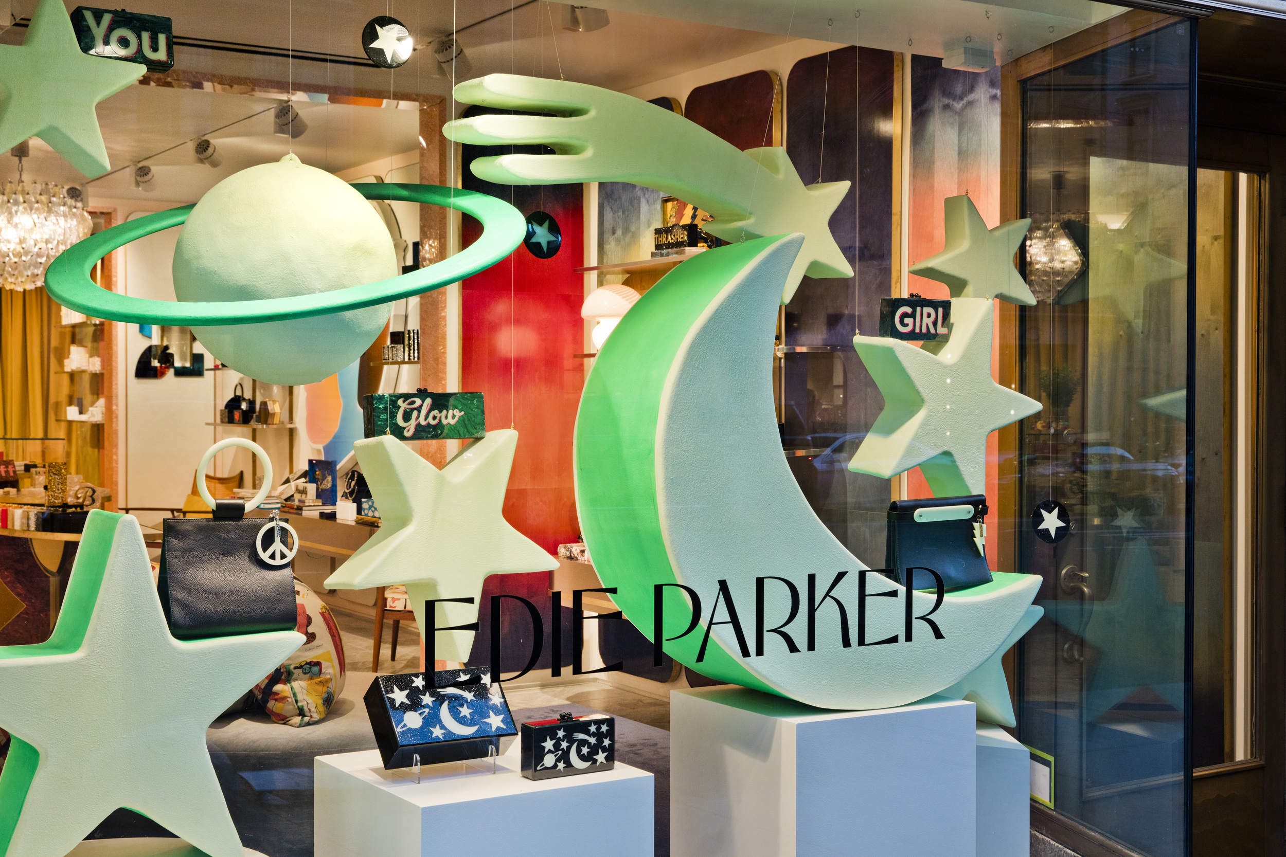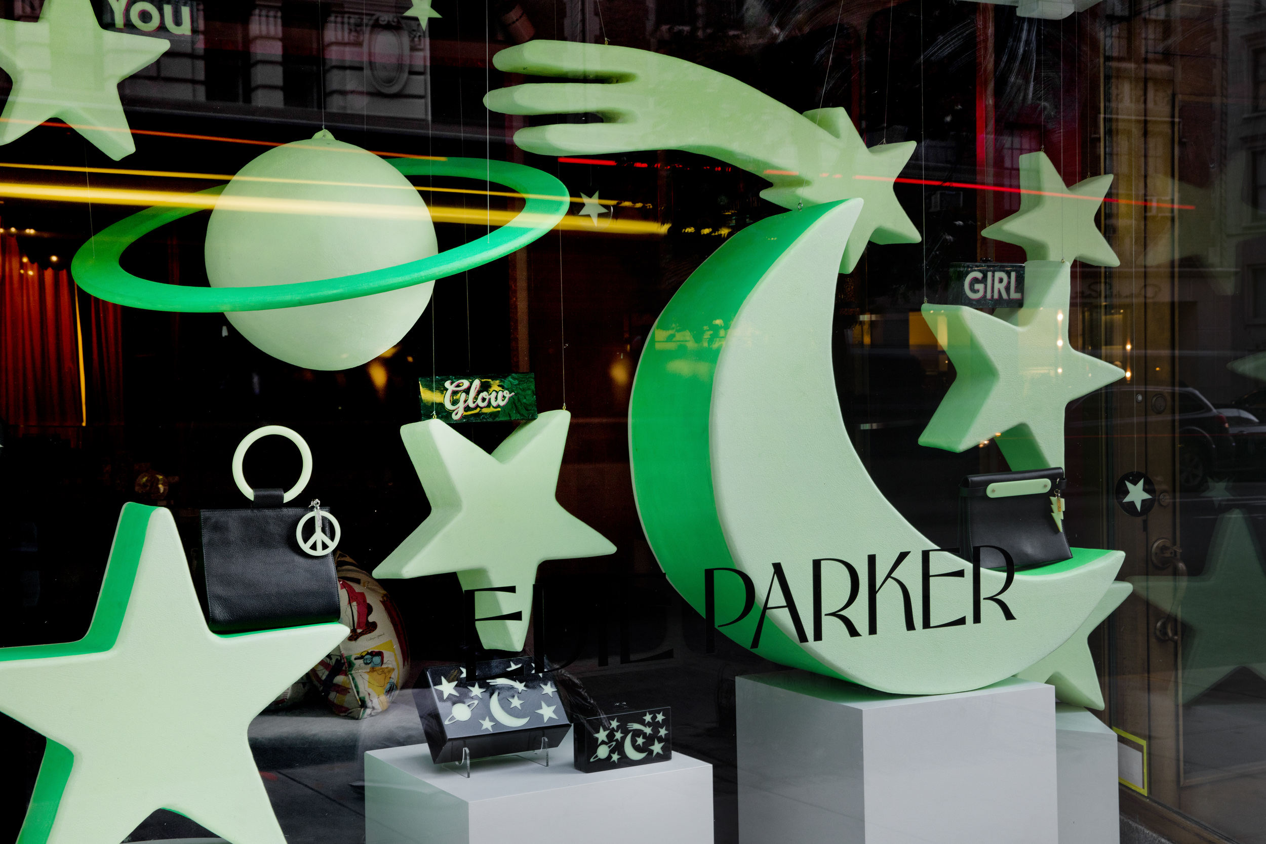 Using the shapes in the glow-in-the-dark acrylic collection from Edie Parker we created oversized glow-in-the-dark sculptures to mirror the celestial motif from the signature clutch in the collection. Black lights were used in the display so that the...Using the shapes in the glow-in-the-dark acrylic collection from Edie Parker we created oversized glow-in-the-dark sculptures to mirror the celestial motif from the signature clutch in the collection. Black lights were used in the display so that the window had a glow in the dark effect during day and night.See More