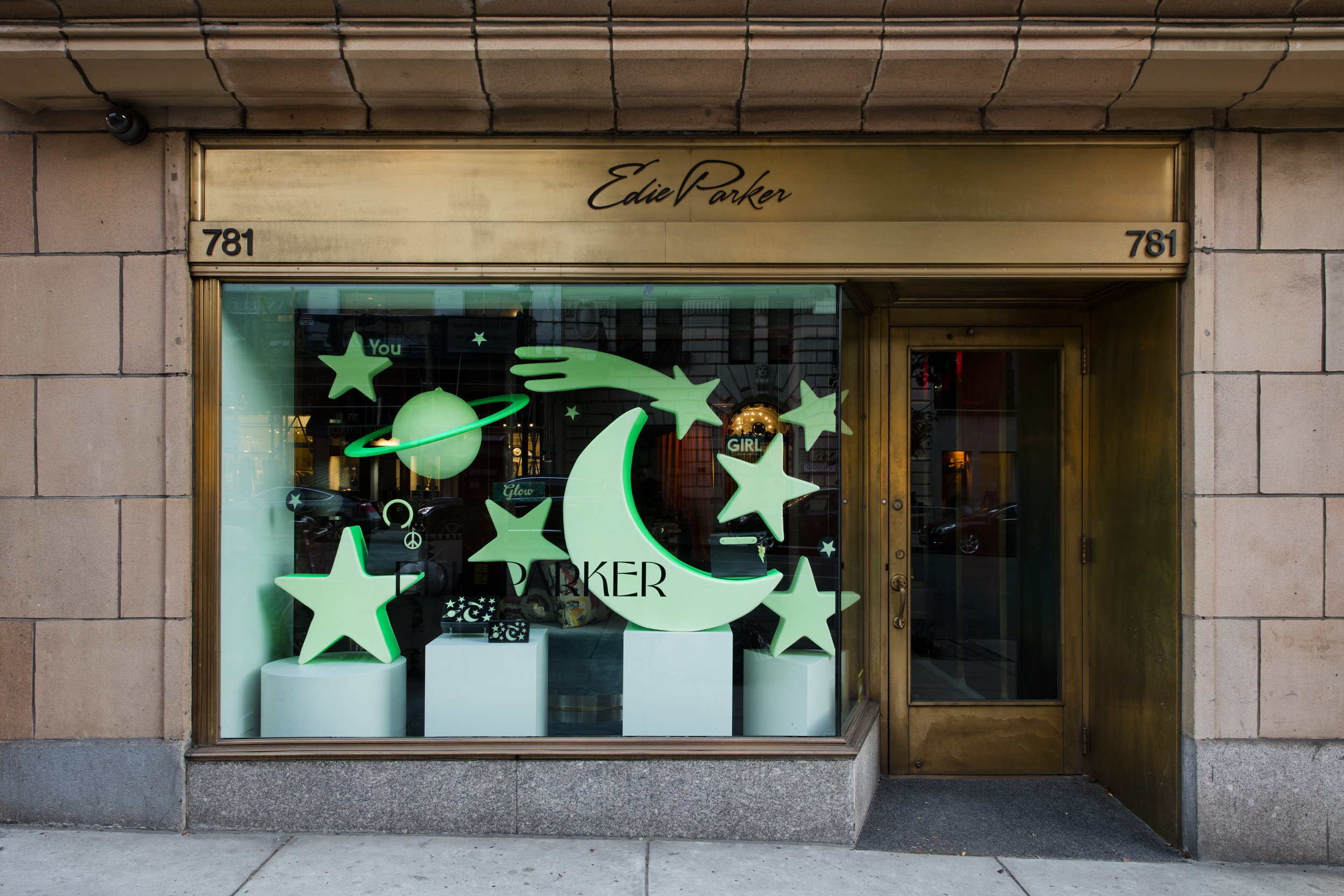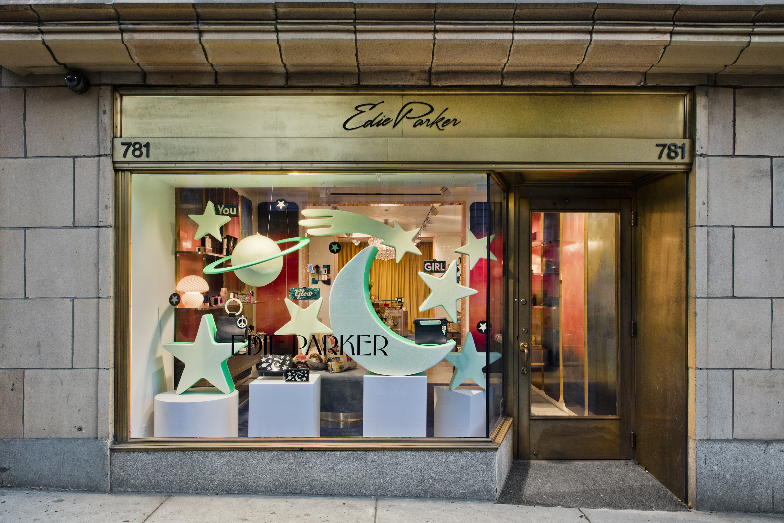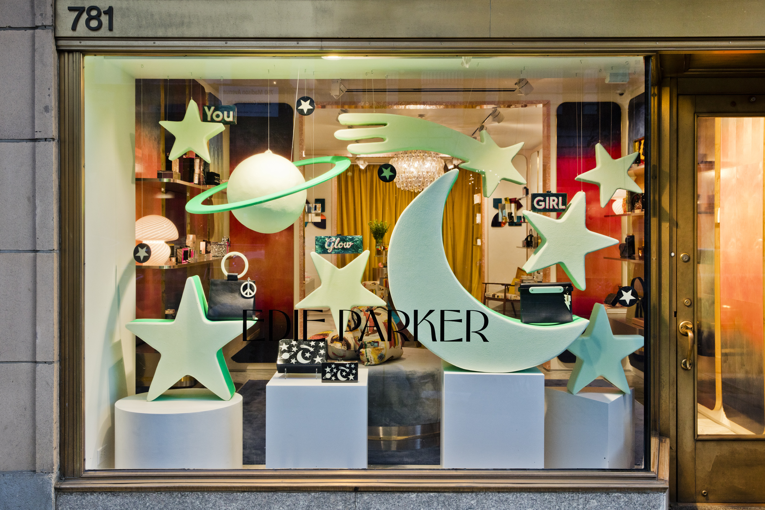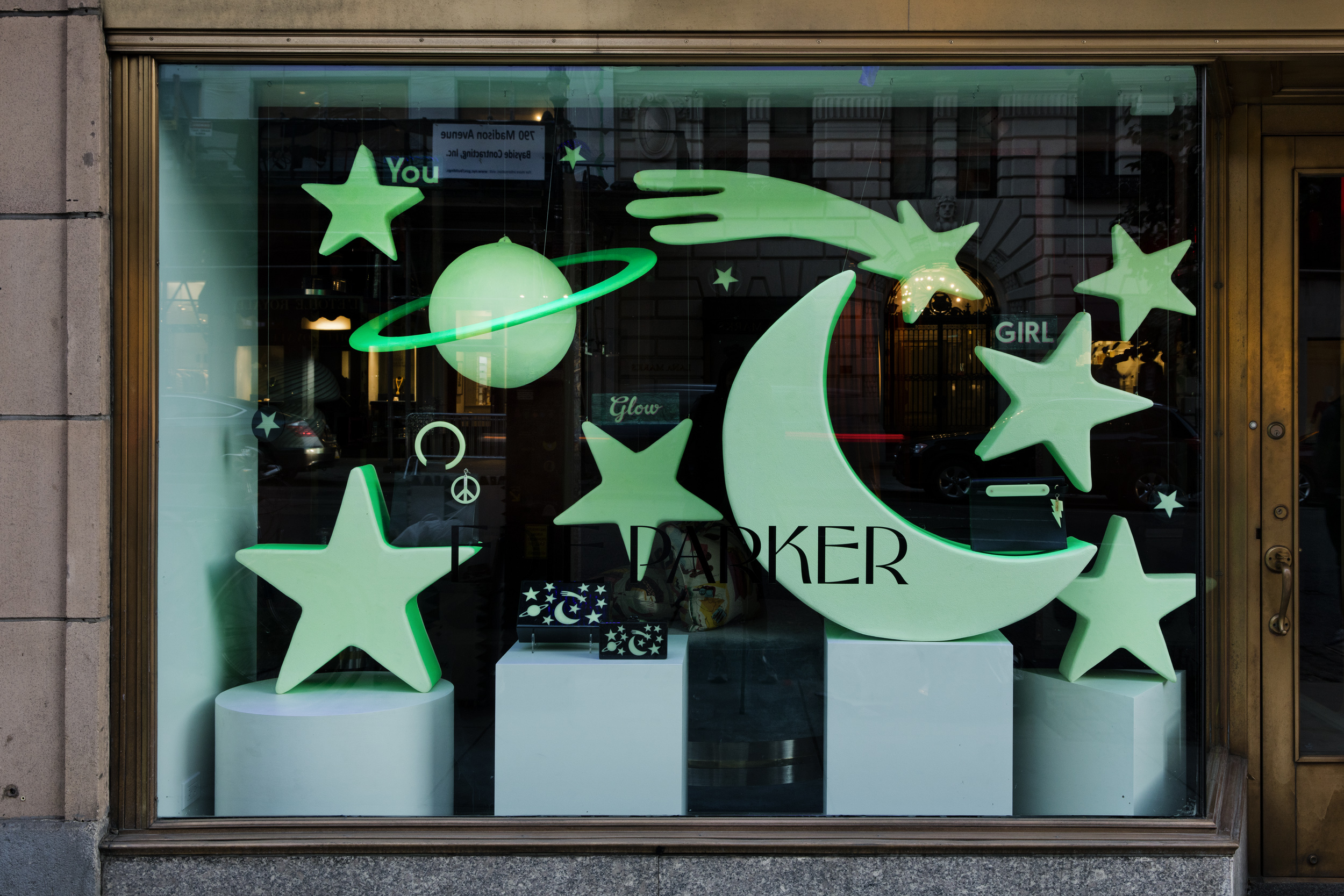 Using the shapes in the glow-in-the-dark acrylic collection from Edie Parker we created oversized glow-in-the-dark sculptures to mirror the celestial motif from the signature clutch in the collection. Black lights were used in the display so that the...Using the shapes in the glow-in-the-dark acrylic collection from Edie Parker we created oversized glow-in-the-dark sculptures to mirror the celestial motif from the signature clutch in the collection. Black lights were used in the display so that the window had a glow in the dark effect during day and night.See More