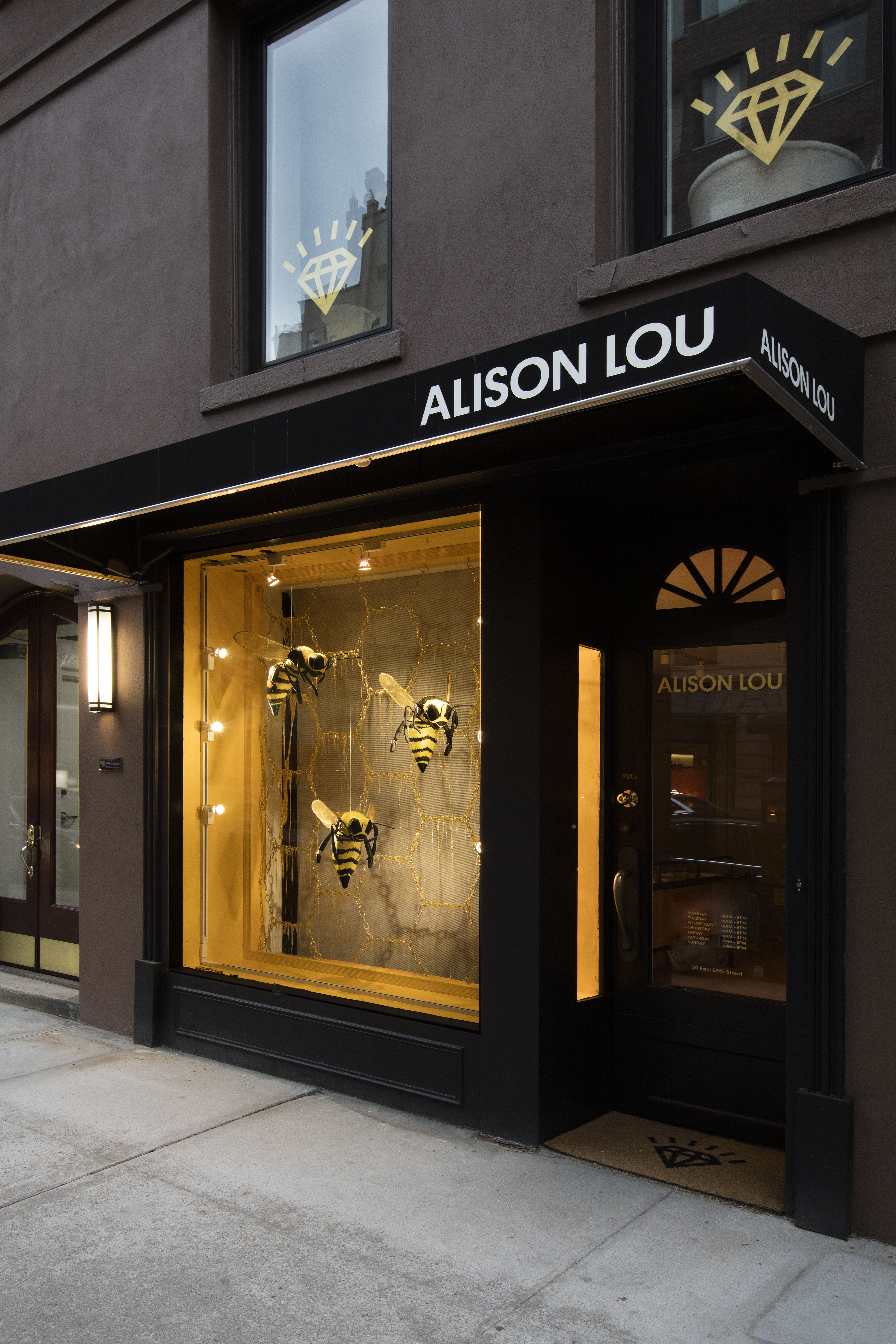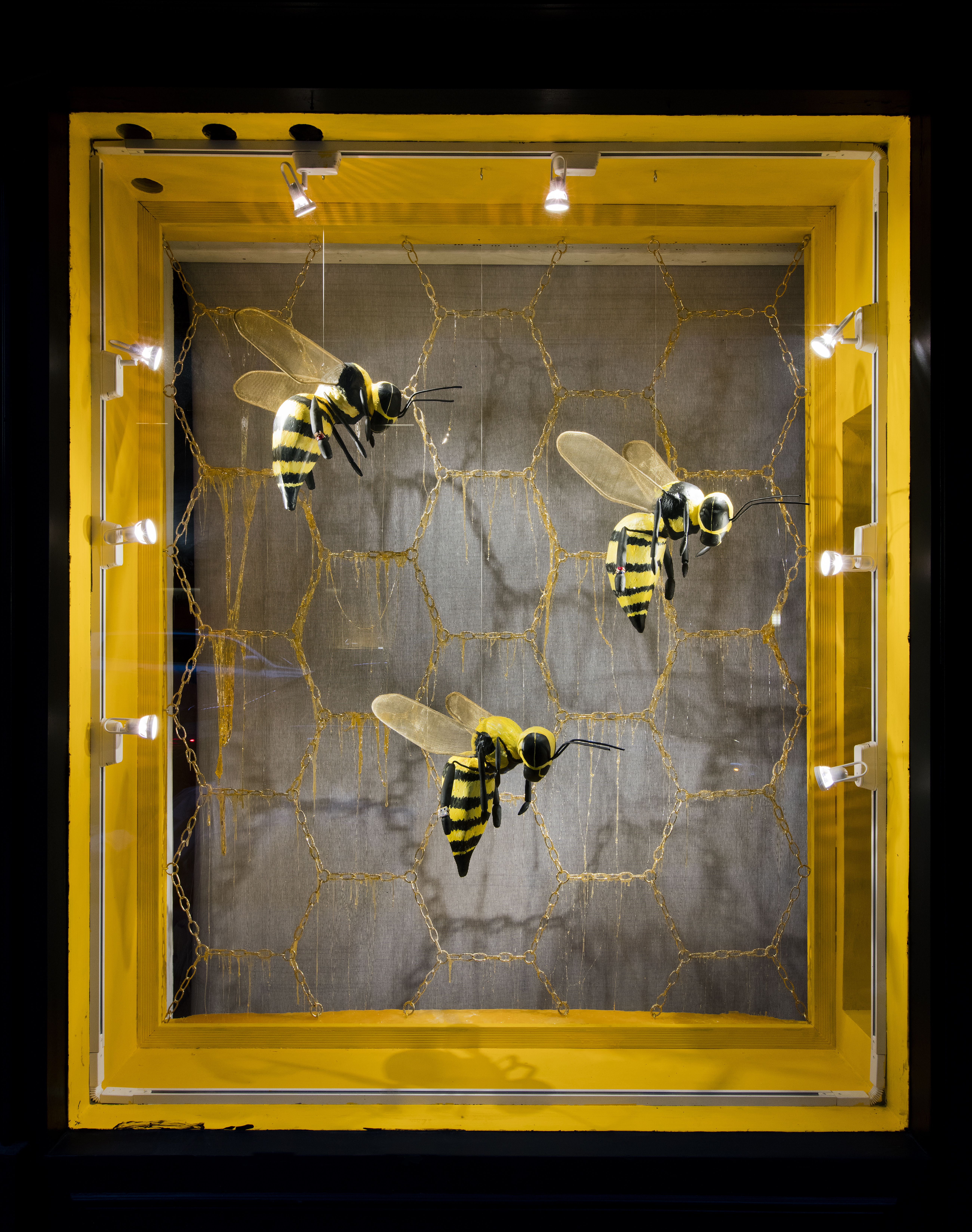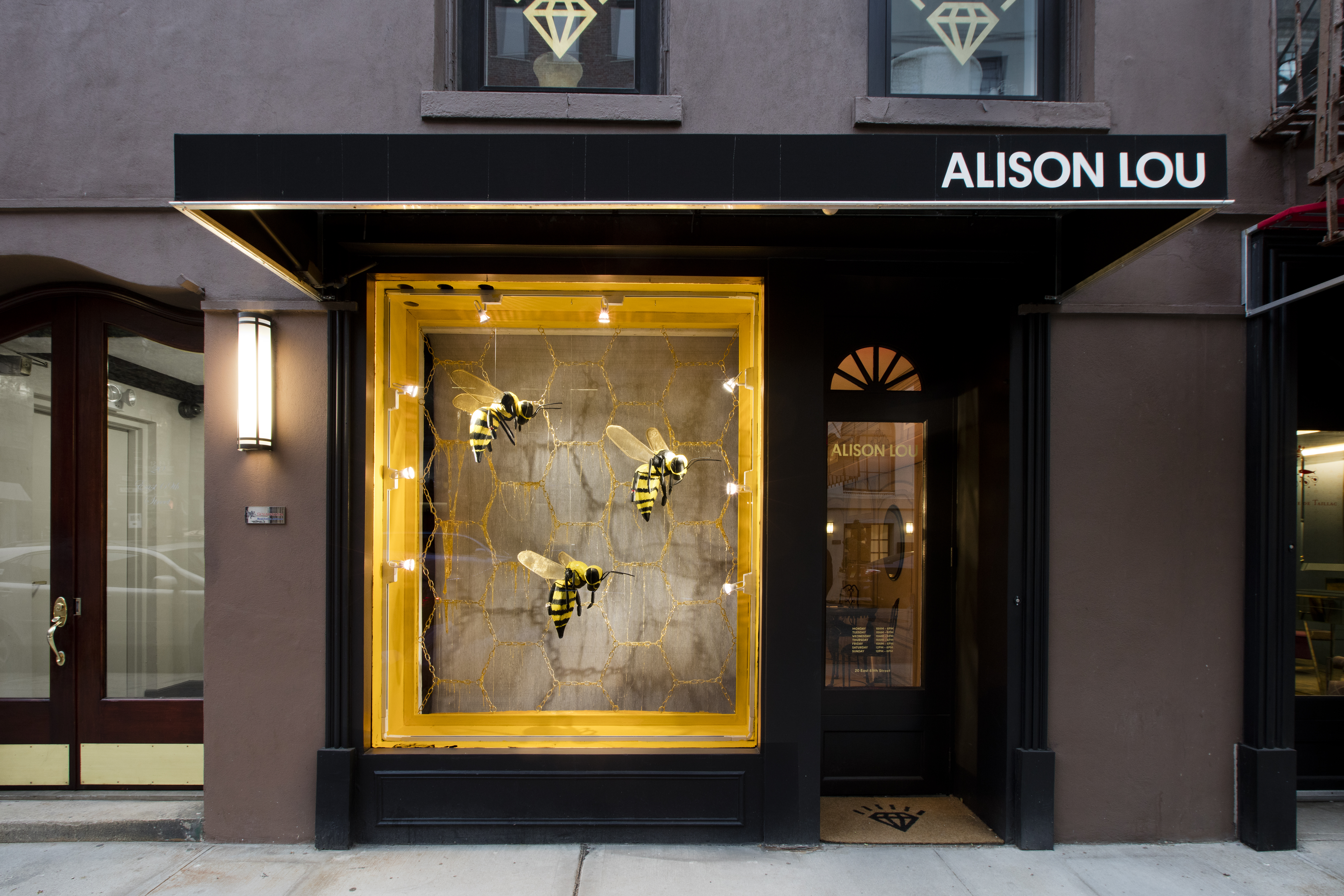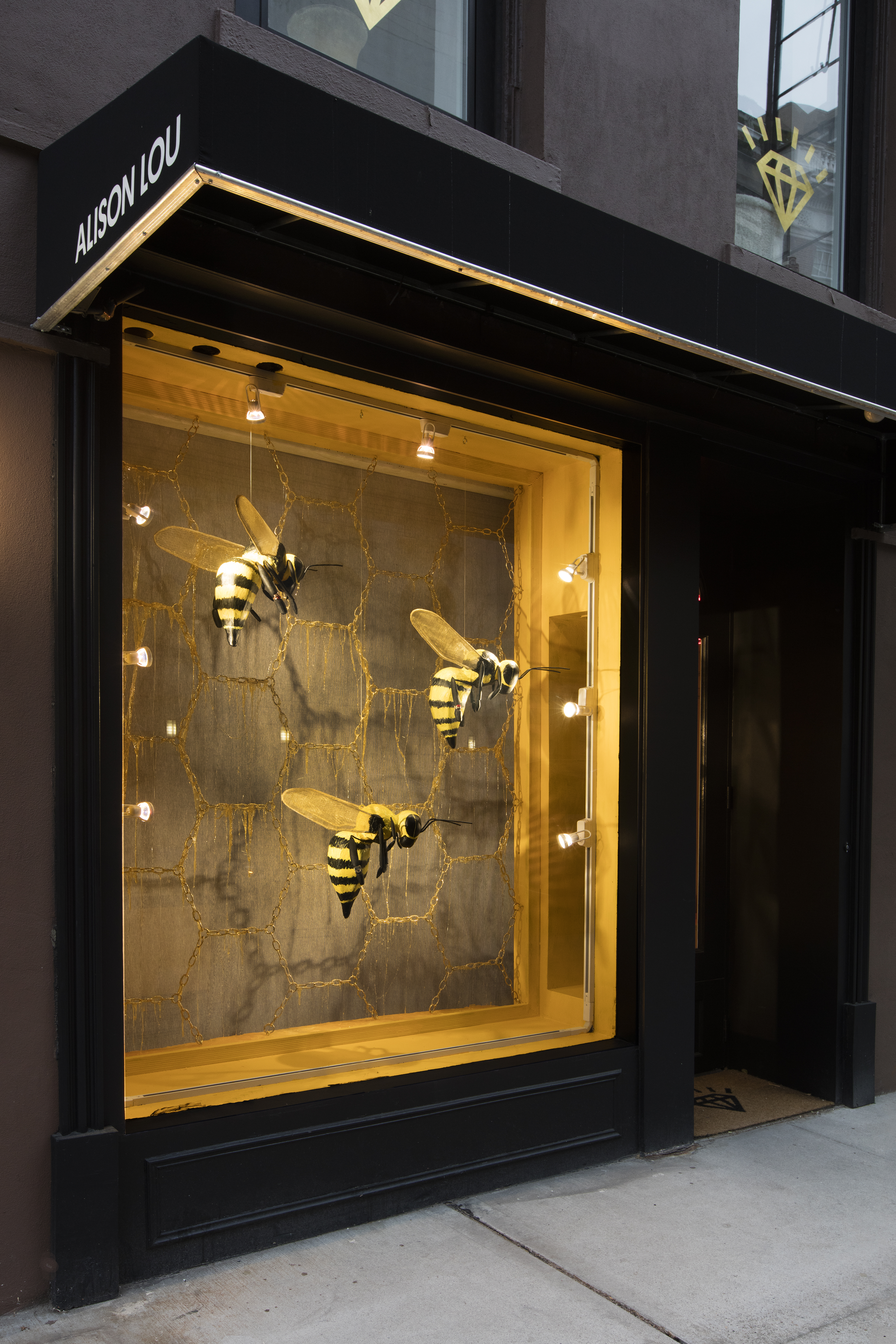 Hand Crafted Bees held Alison Lou rings on their front legs as they were suspended in front of a honeycomb chain backdrop dripping in honey.