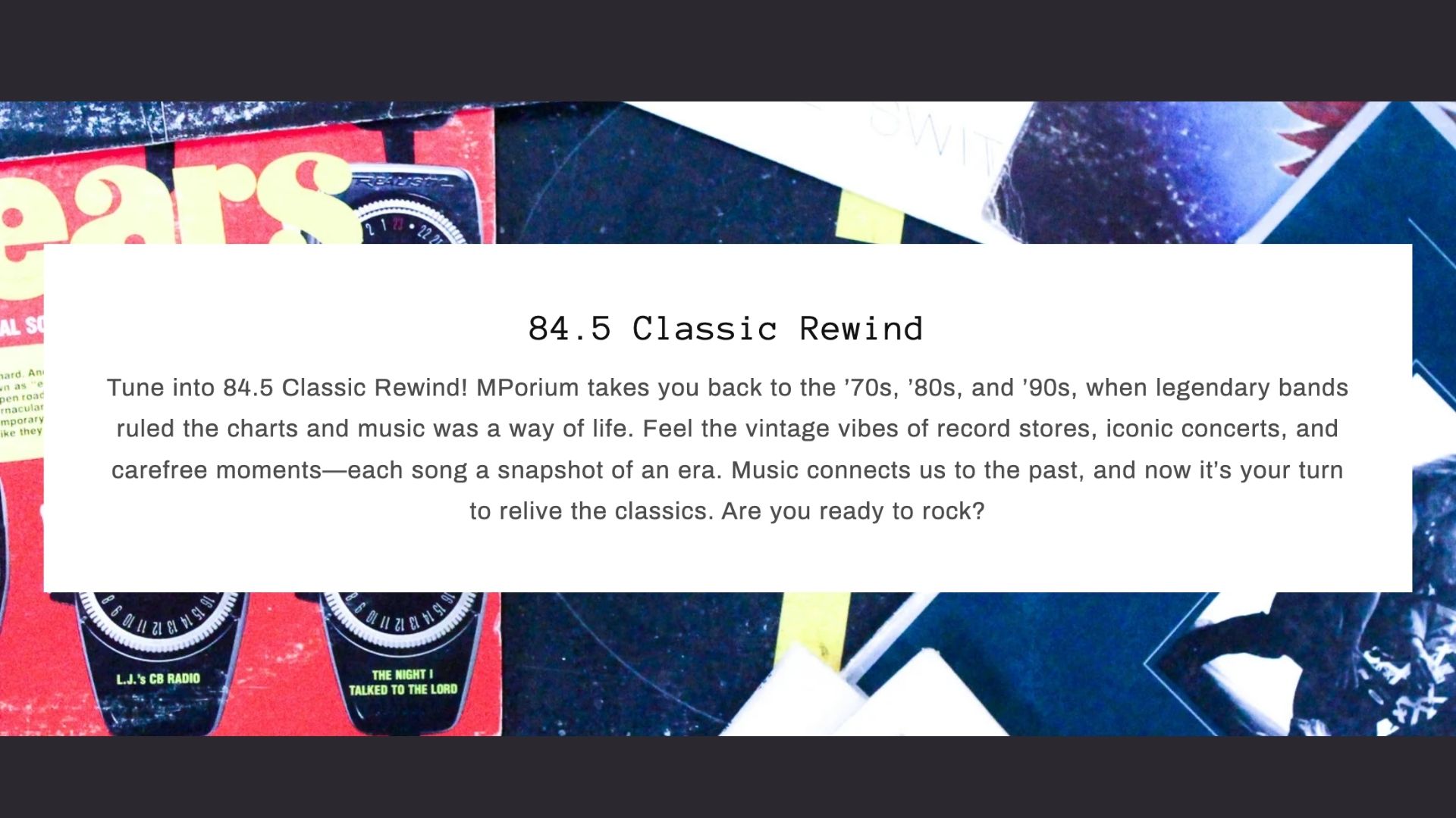 Tune into 84.5 Classic Rewind! MPorium takes you back to the ’70s, ’80s, and ’90s, when legendary bands ruled the charts and music was a way of life. Feel the vintage vibes of record stores, iconic concerts, and carefree moments—each song a snapshot of an era. Music connects us to the past, and now it’s your turn to relive the classics. Are you ready to rock?