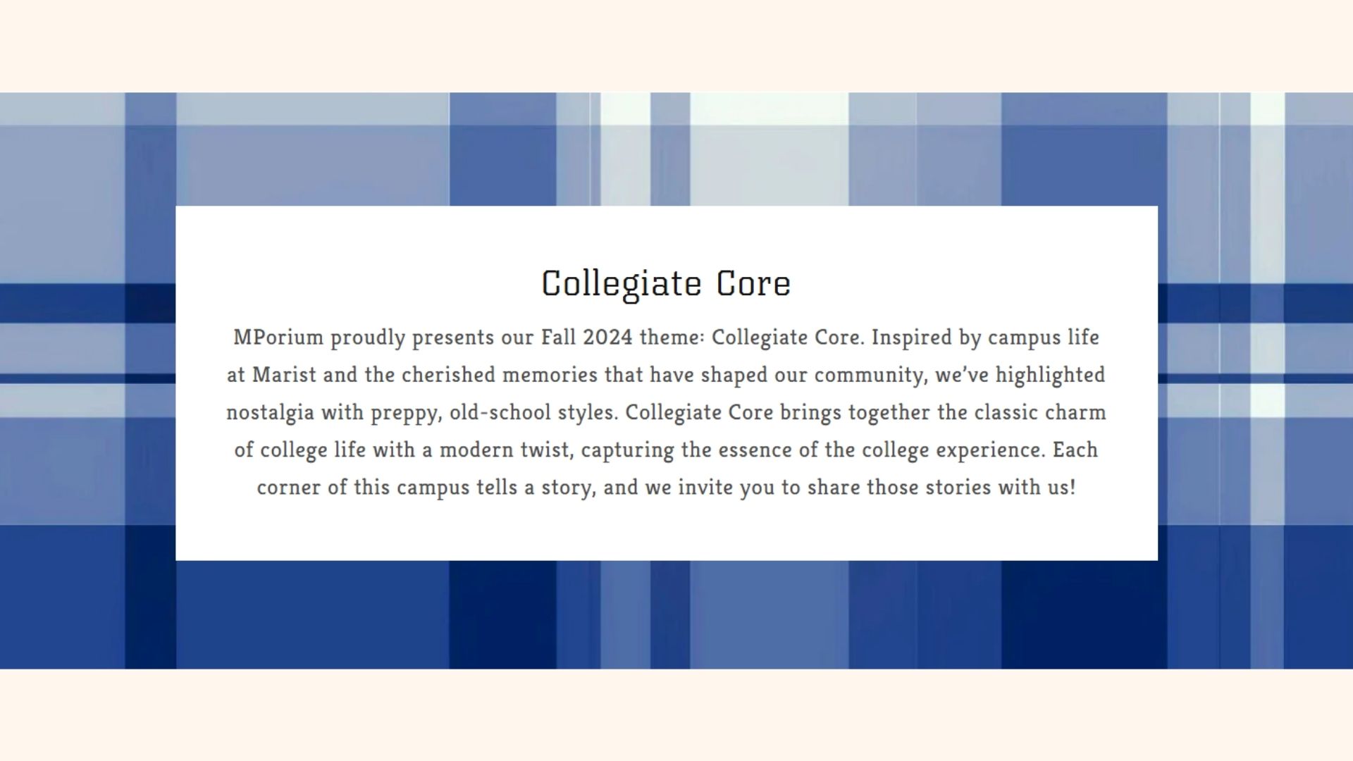 The Fall 2024 theme: Collegiate Core is inspired by campus life at Marist and the cherished memories that have shaped our community, we’ve highlighted nostalgia with preppy, old-school styles. Collegiate Core brings together the classic charm of college life with a modern twist, capturing the essence of the college experience.