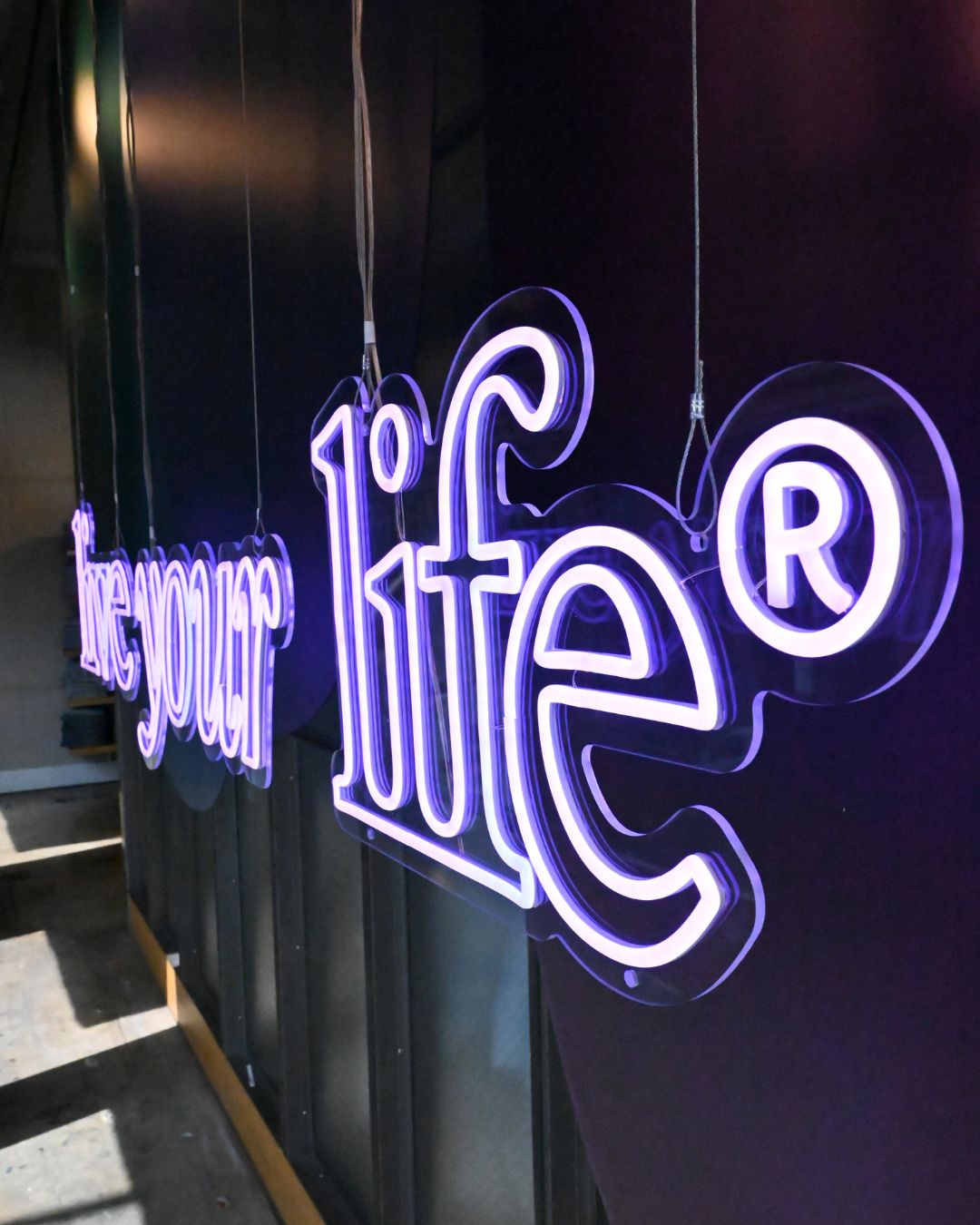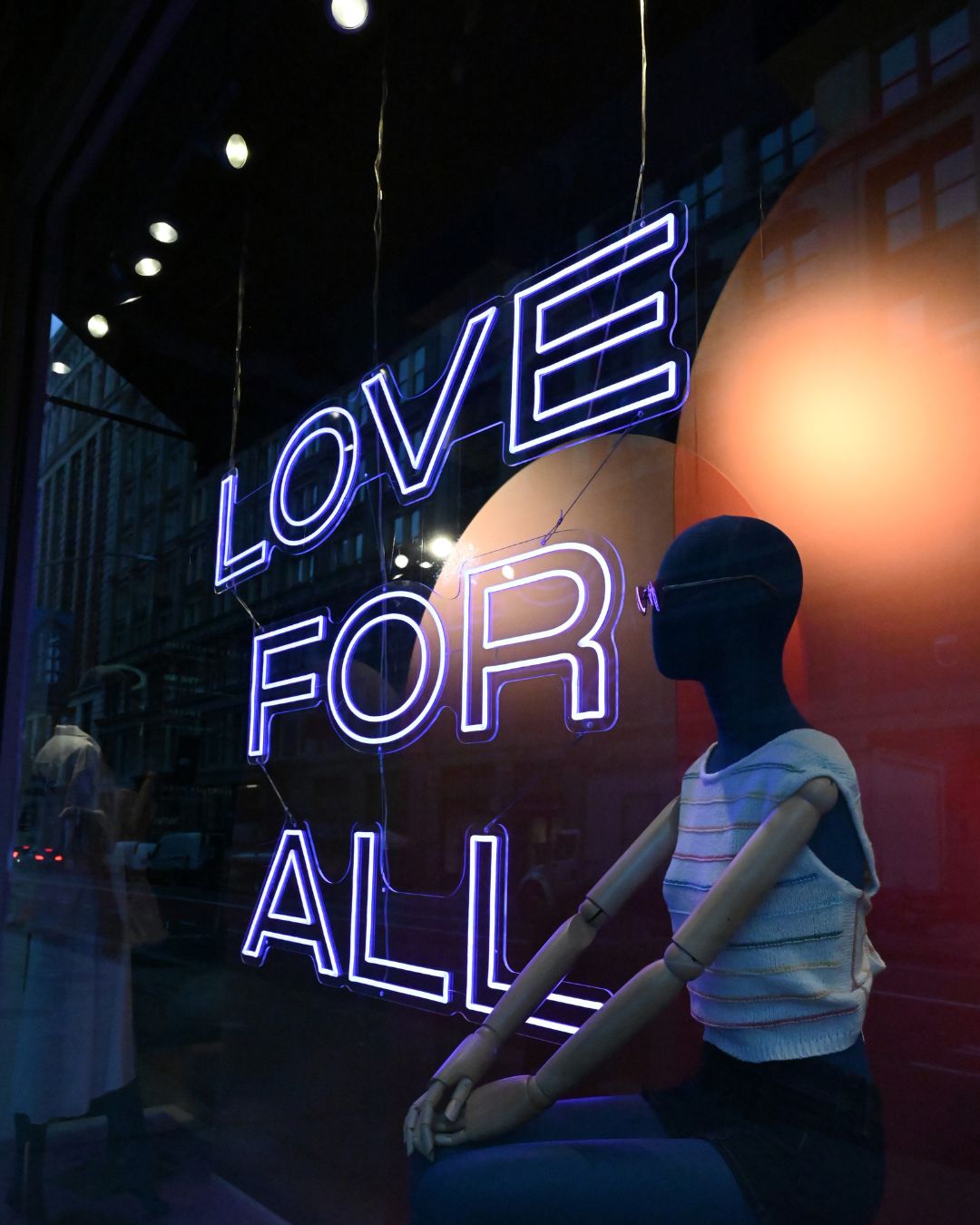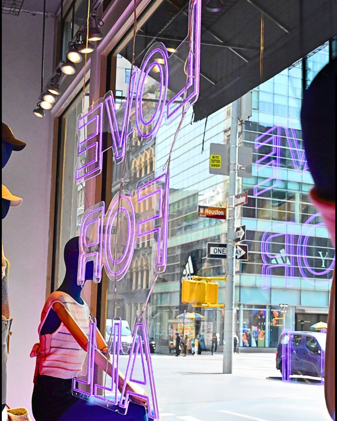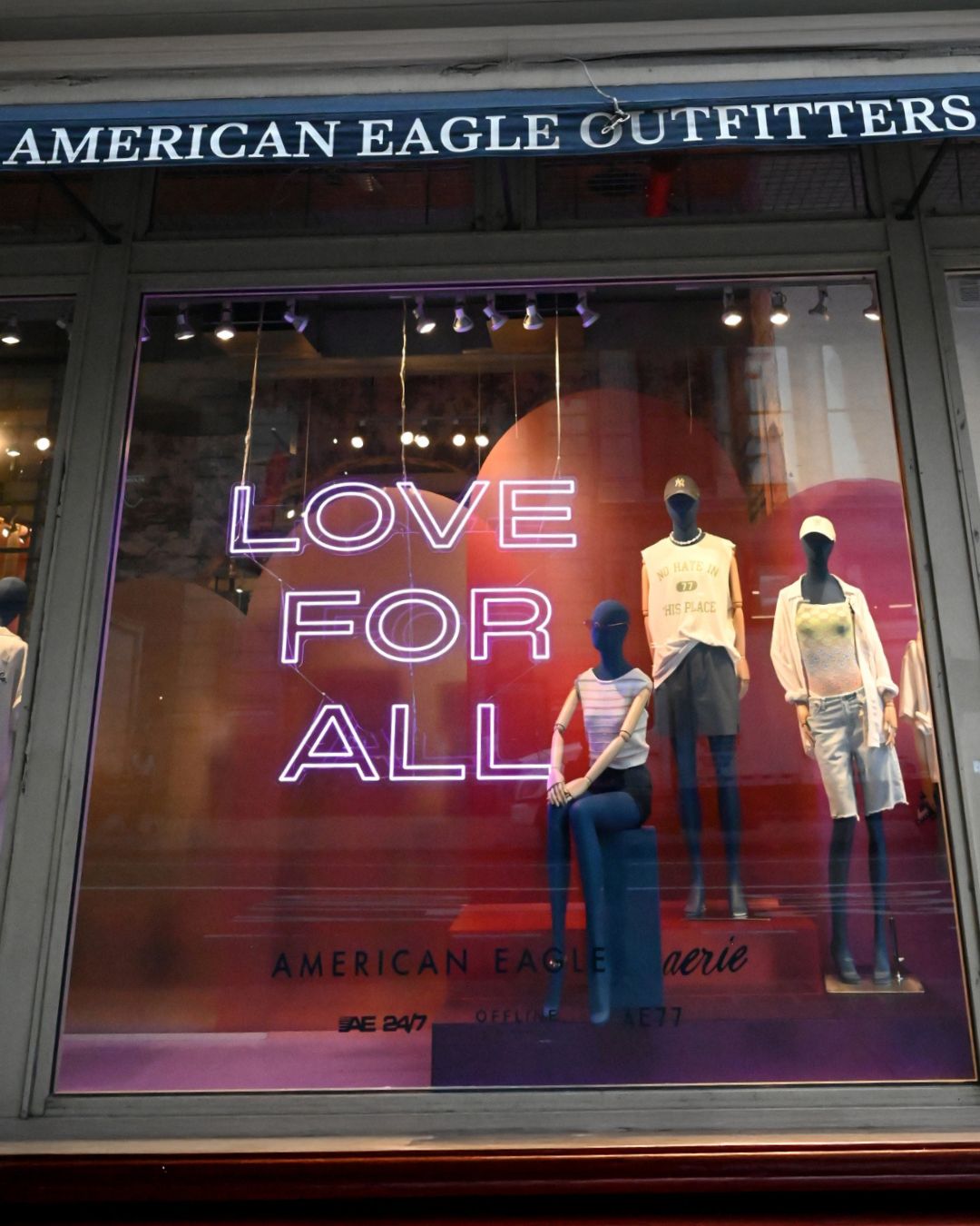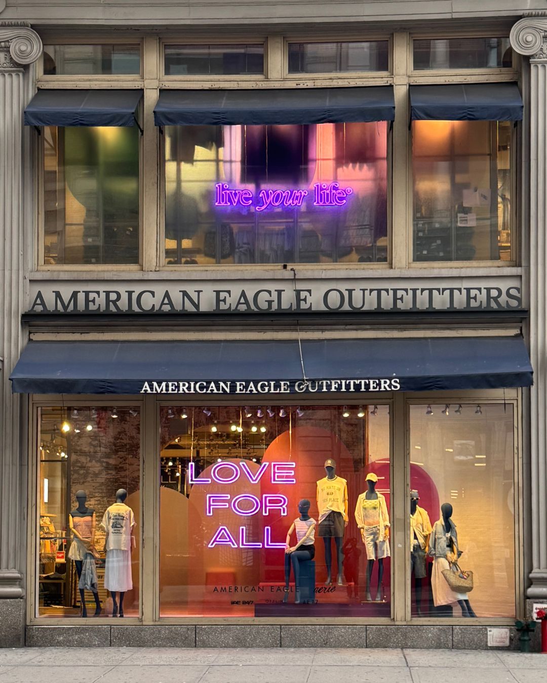 Duggal partnered with American Eagle Outfitters on a two-story Pride activation at their Soho store, featuring custom layered acrylics, and bold LED signage to create a vibrant, branded visual experience.