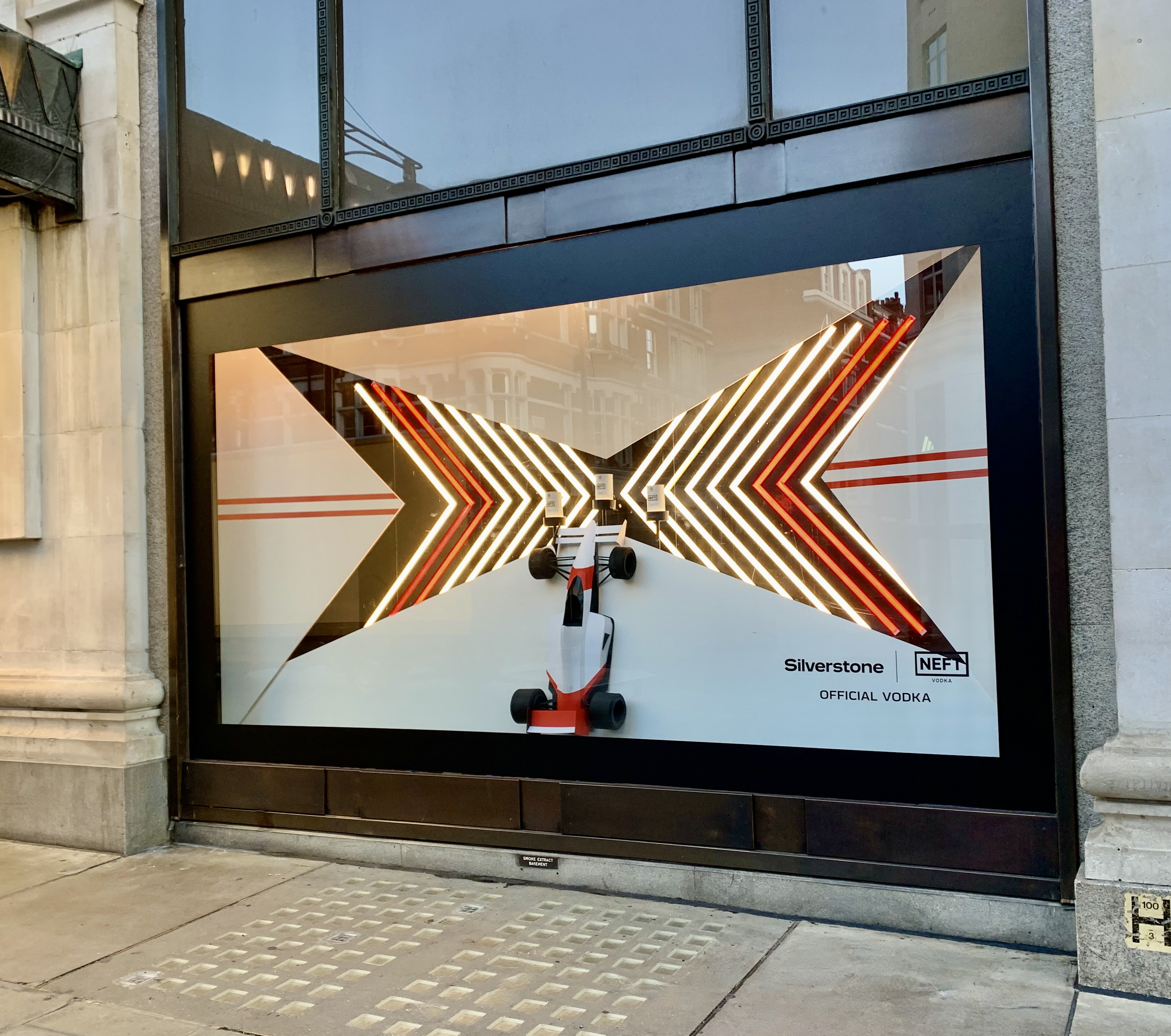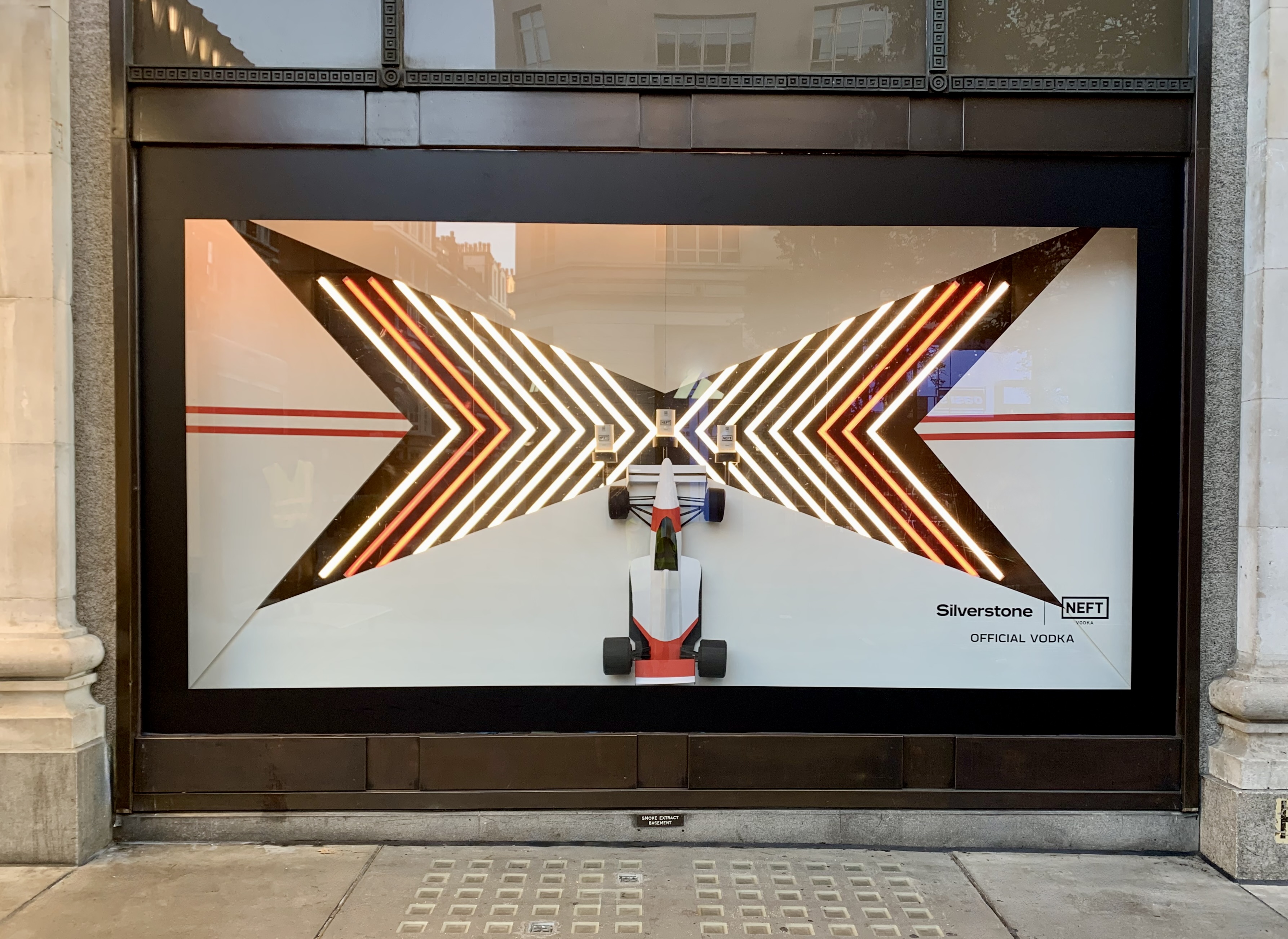 B_RD were challenged with bringing to life a bold and eye-catching window display on one of London’s busiest shopping destinations and iconic global department stores. Taking cues from motorsport and the Silverstone track aesthetic - the design language utilises the narrative which naturally frames the product in the window. Pulling on a use of a primary red colour way commonly used in F1 motorsport racing and as a contrast against the monochromatic signature colours of the NEFT Brand.