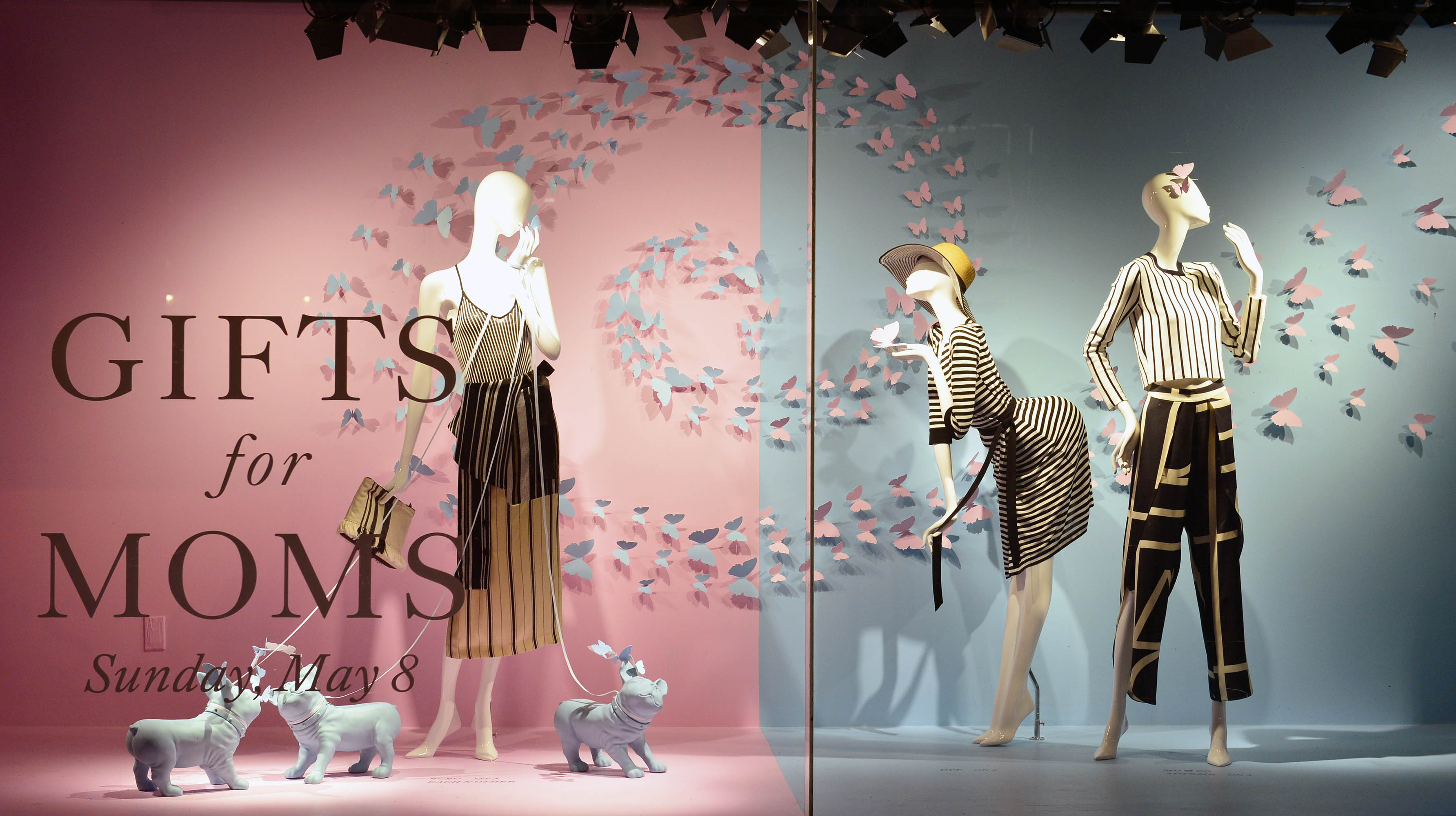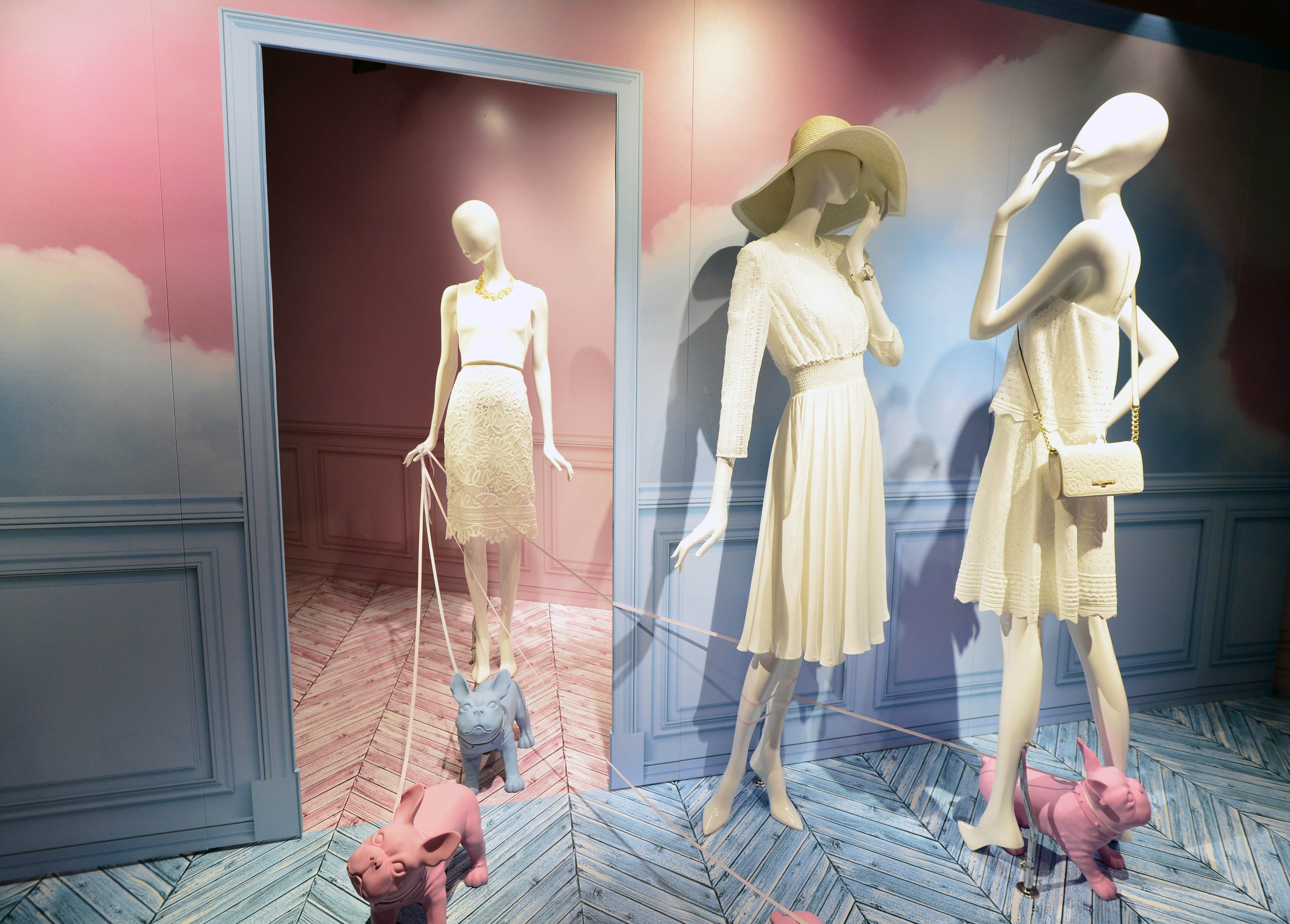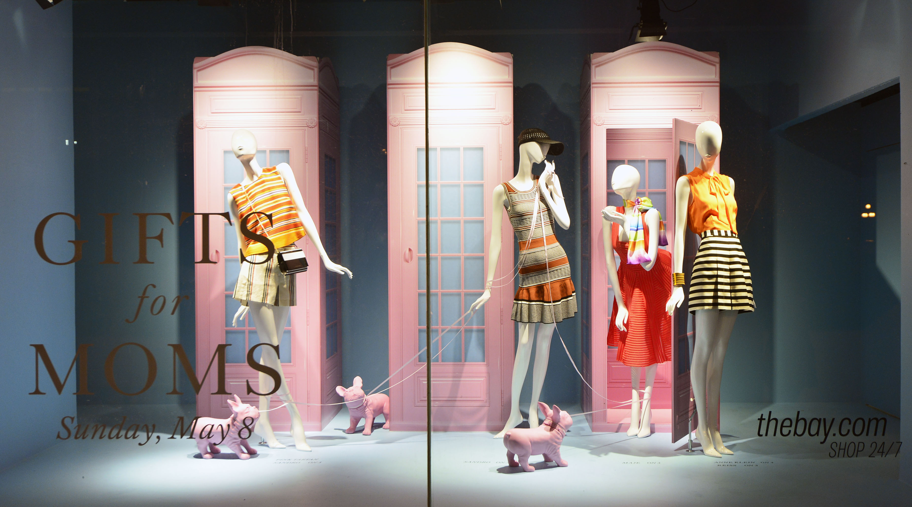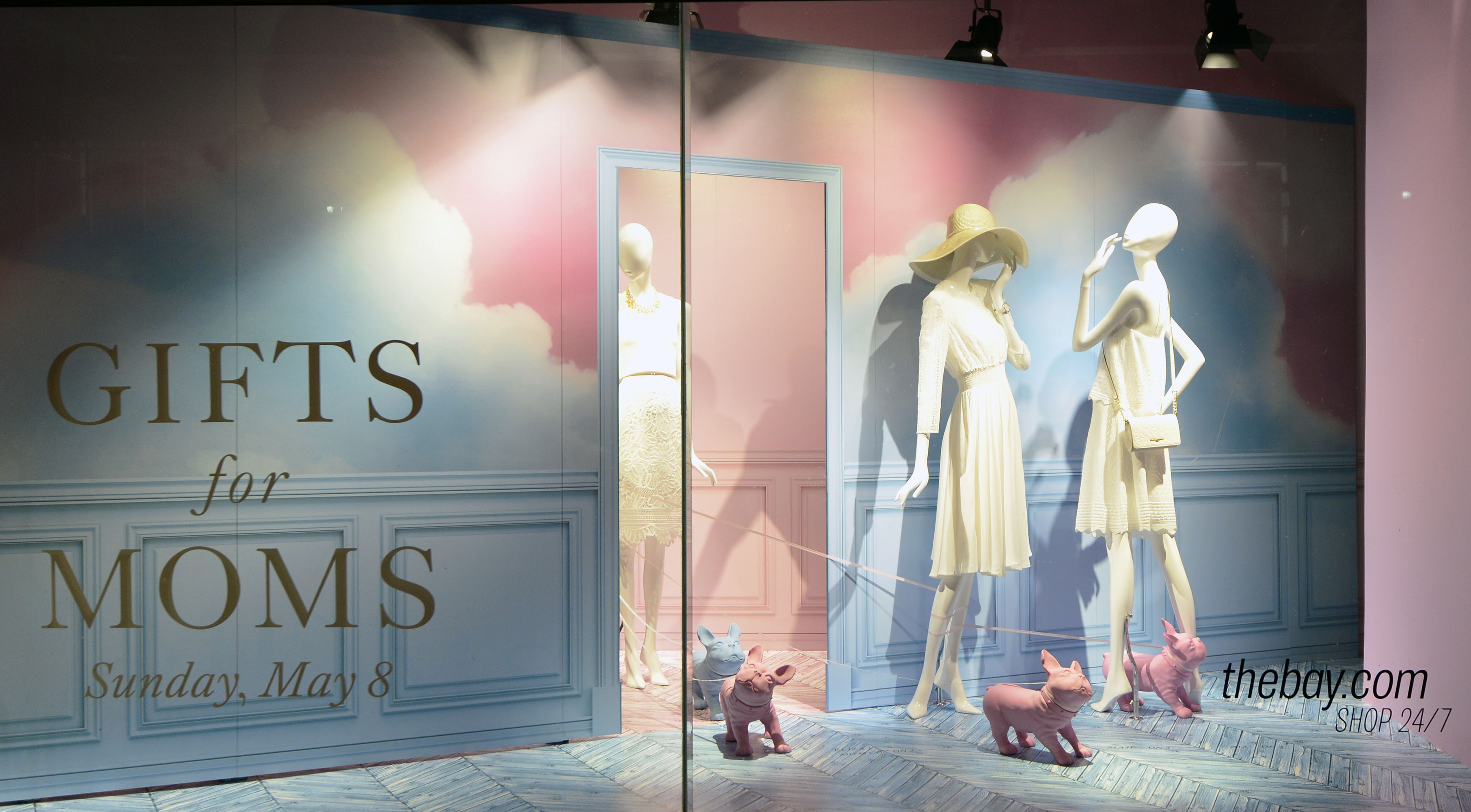 Inspired by the Pantone colours of the year Rose Quartz and Serenity, we took these colours and applied then to scenes that would allow us to both play off on these 2 different colors, yet create fun, whimsical scenes for our Mother’s Day inspired windows.