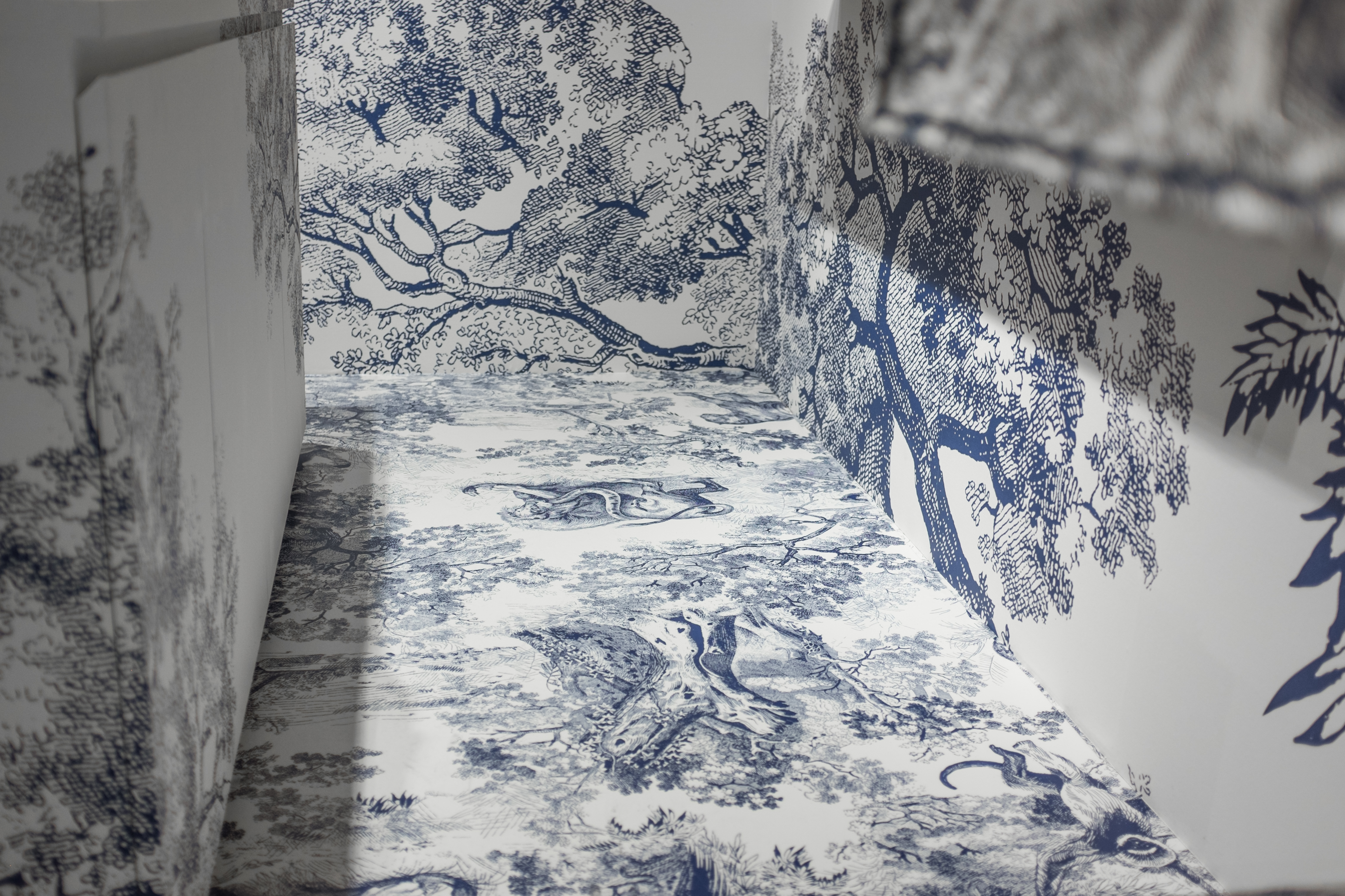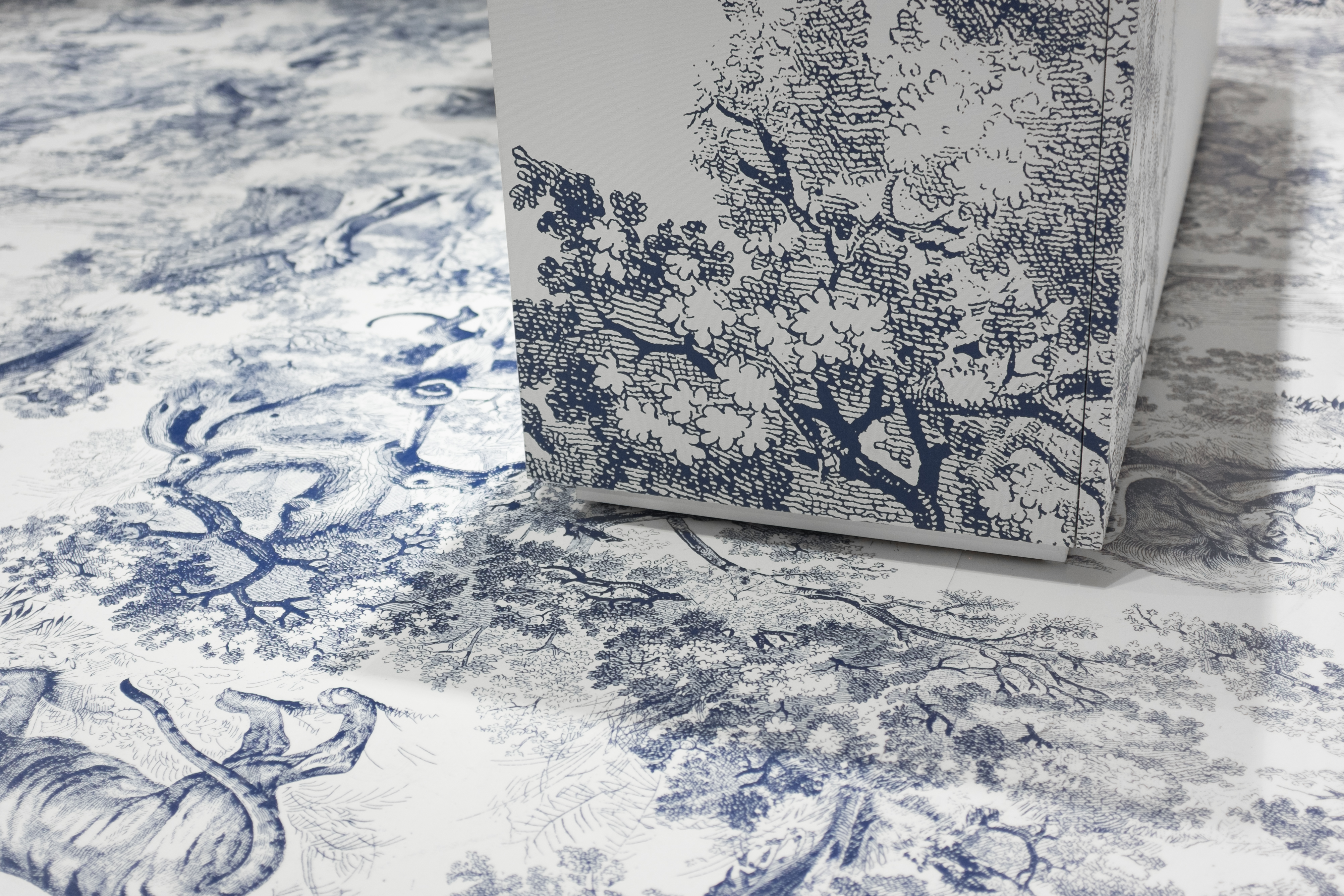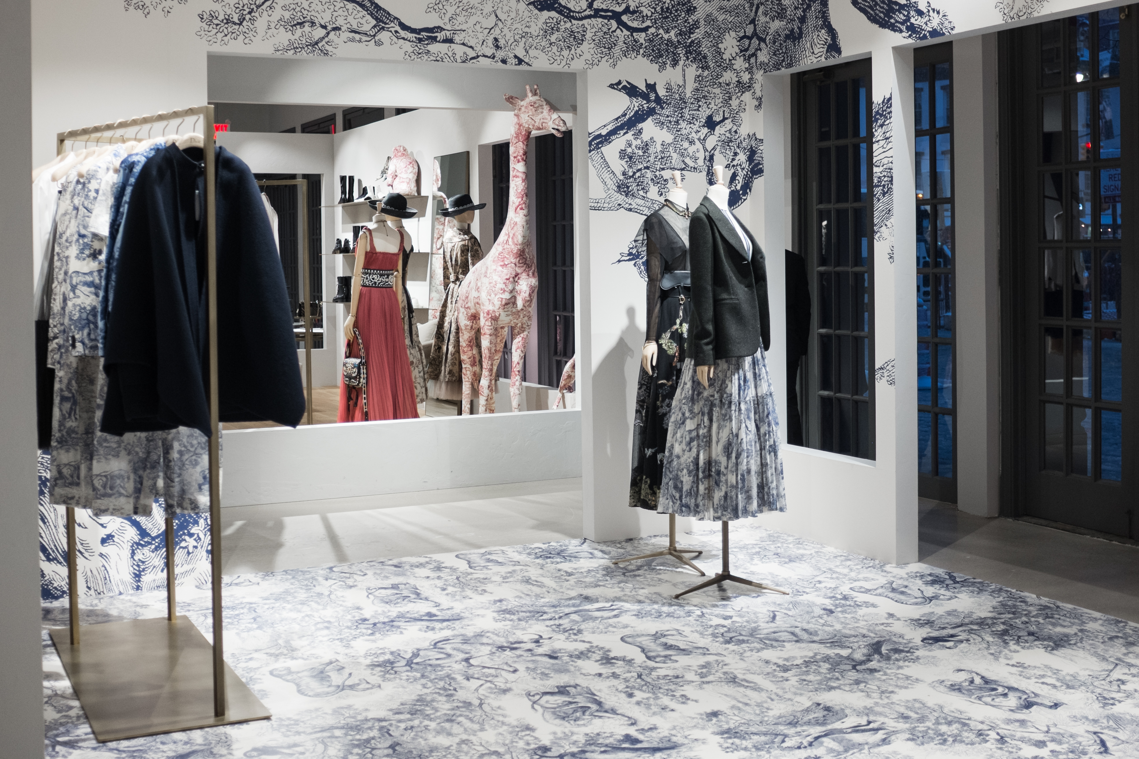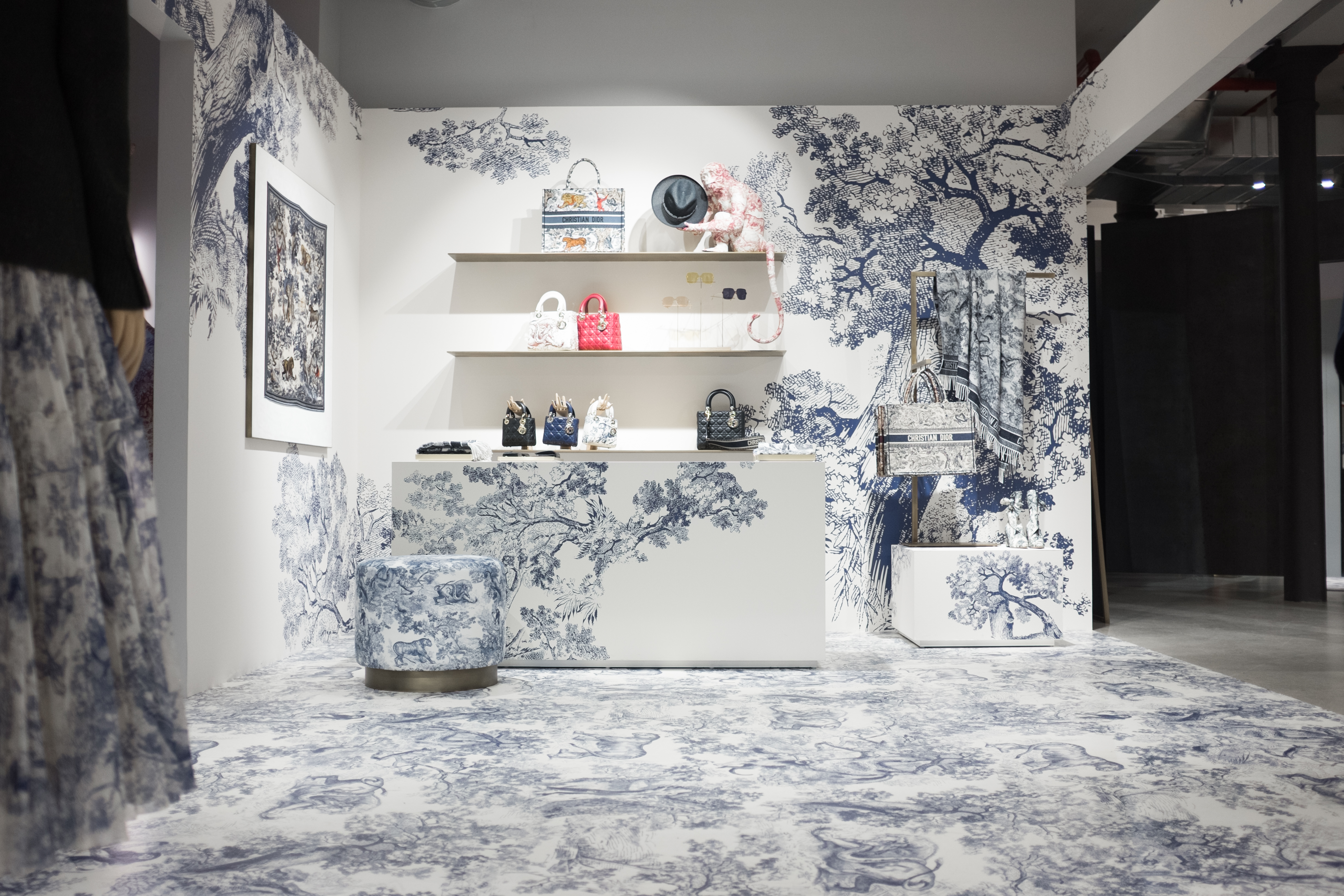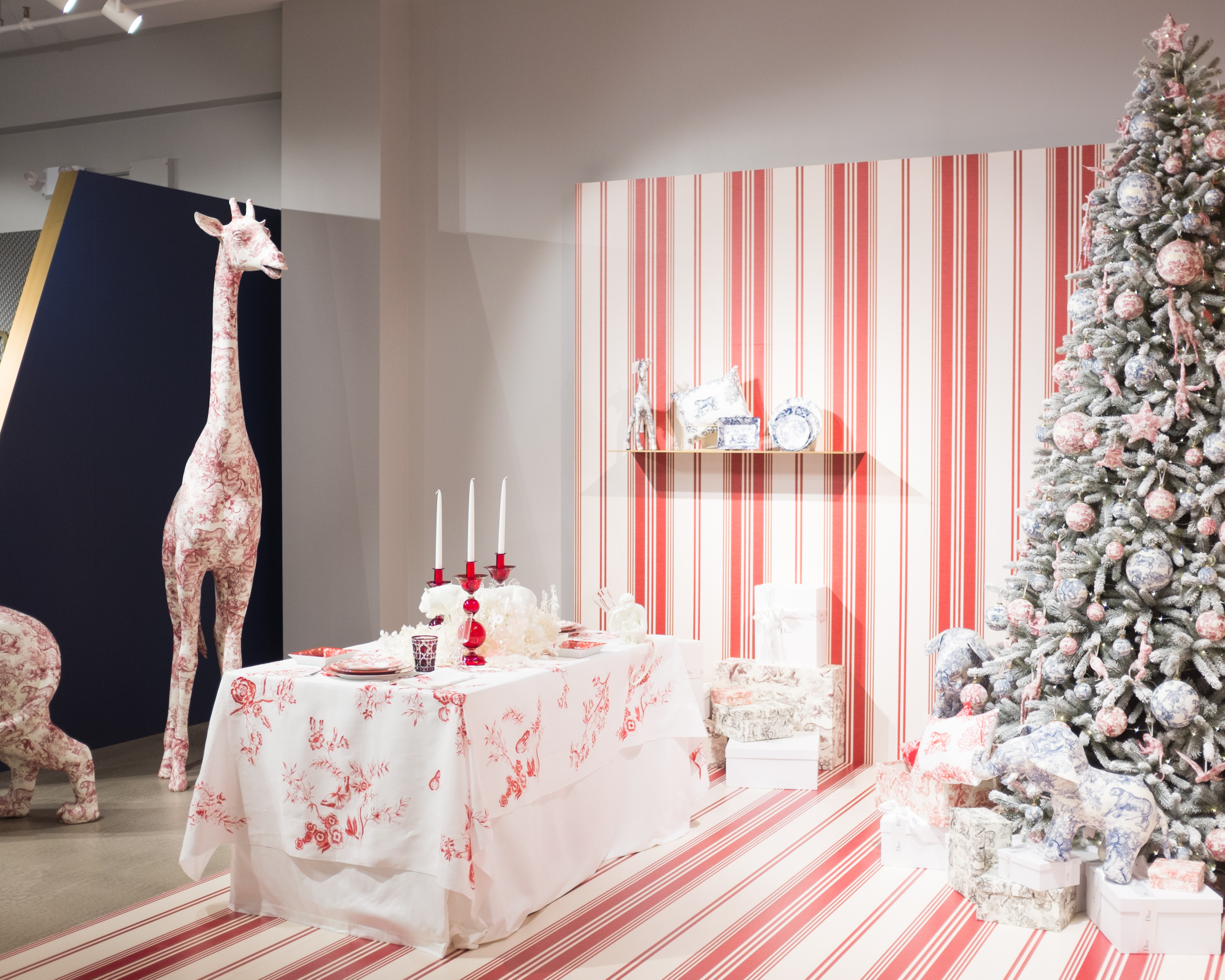 The boutique featured two immersive, contrasting themes: a serene “Blue Toile de Jouy” concept and a festive “Red Stripes” holiday dining motif. Duggal handled the large-format printing for both, including full-coverage floor vinyl, wall graphics, wrapped tables, counters, shelves, display podiums, and even life-size animal sculptures.