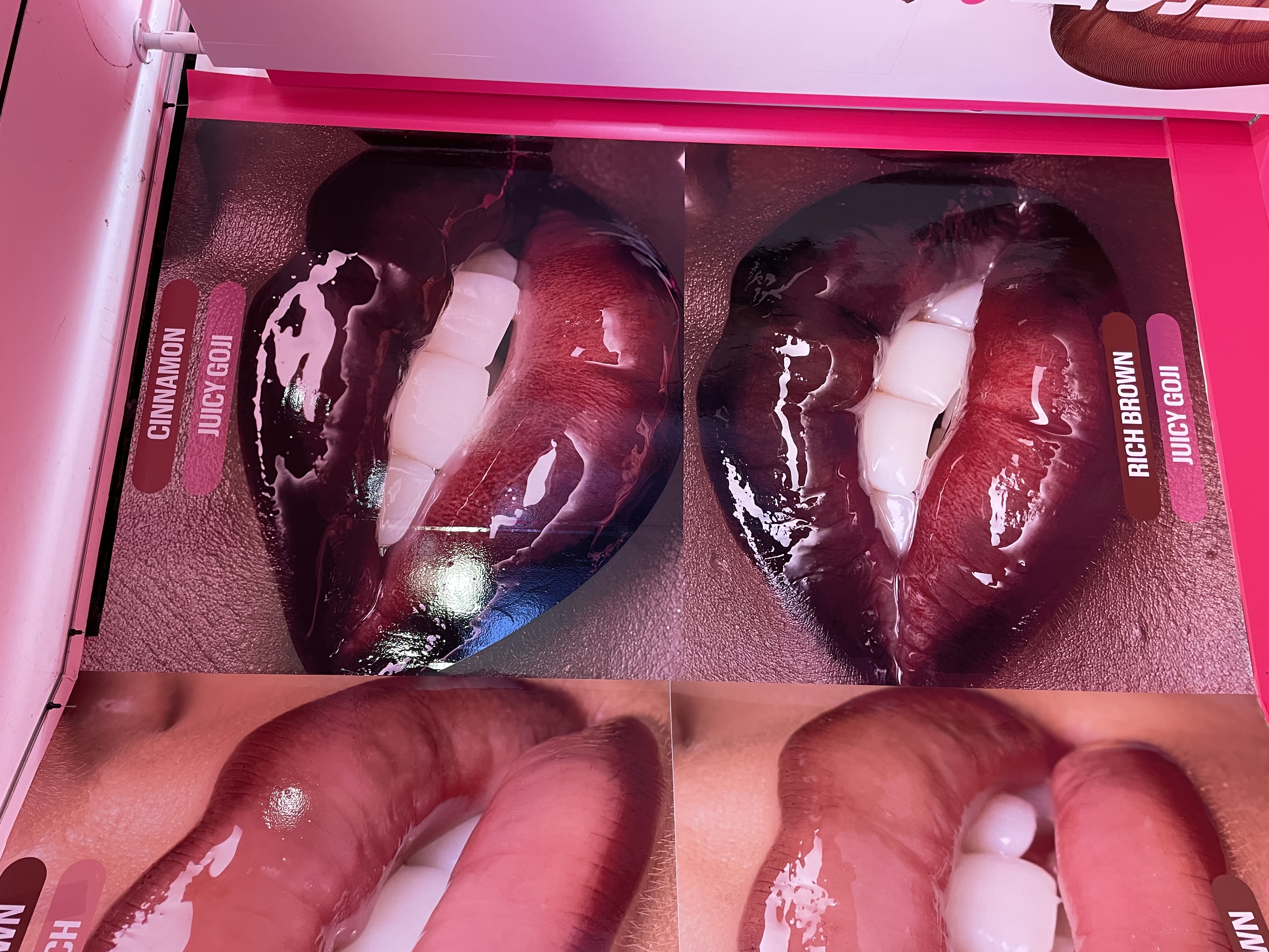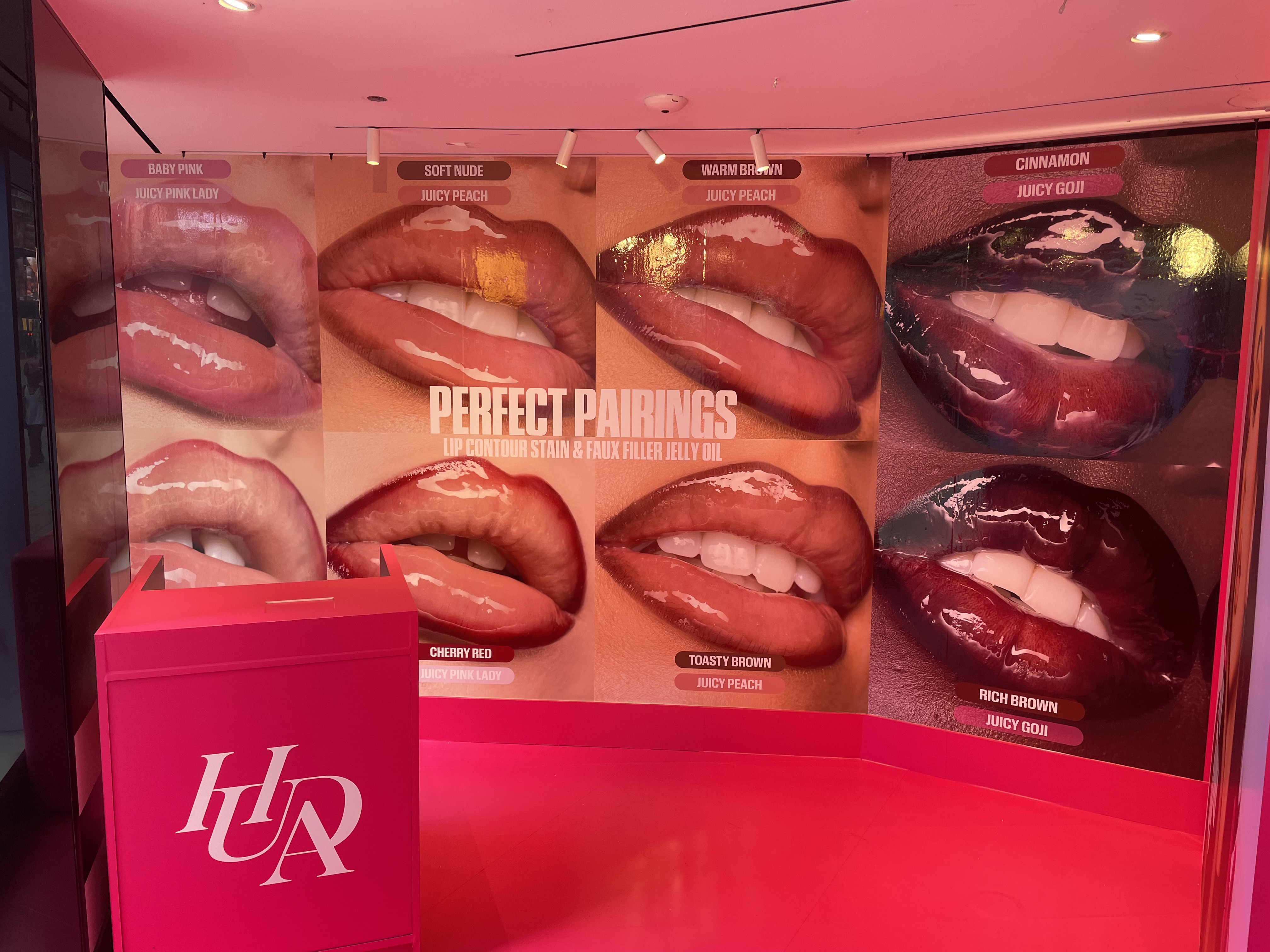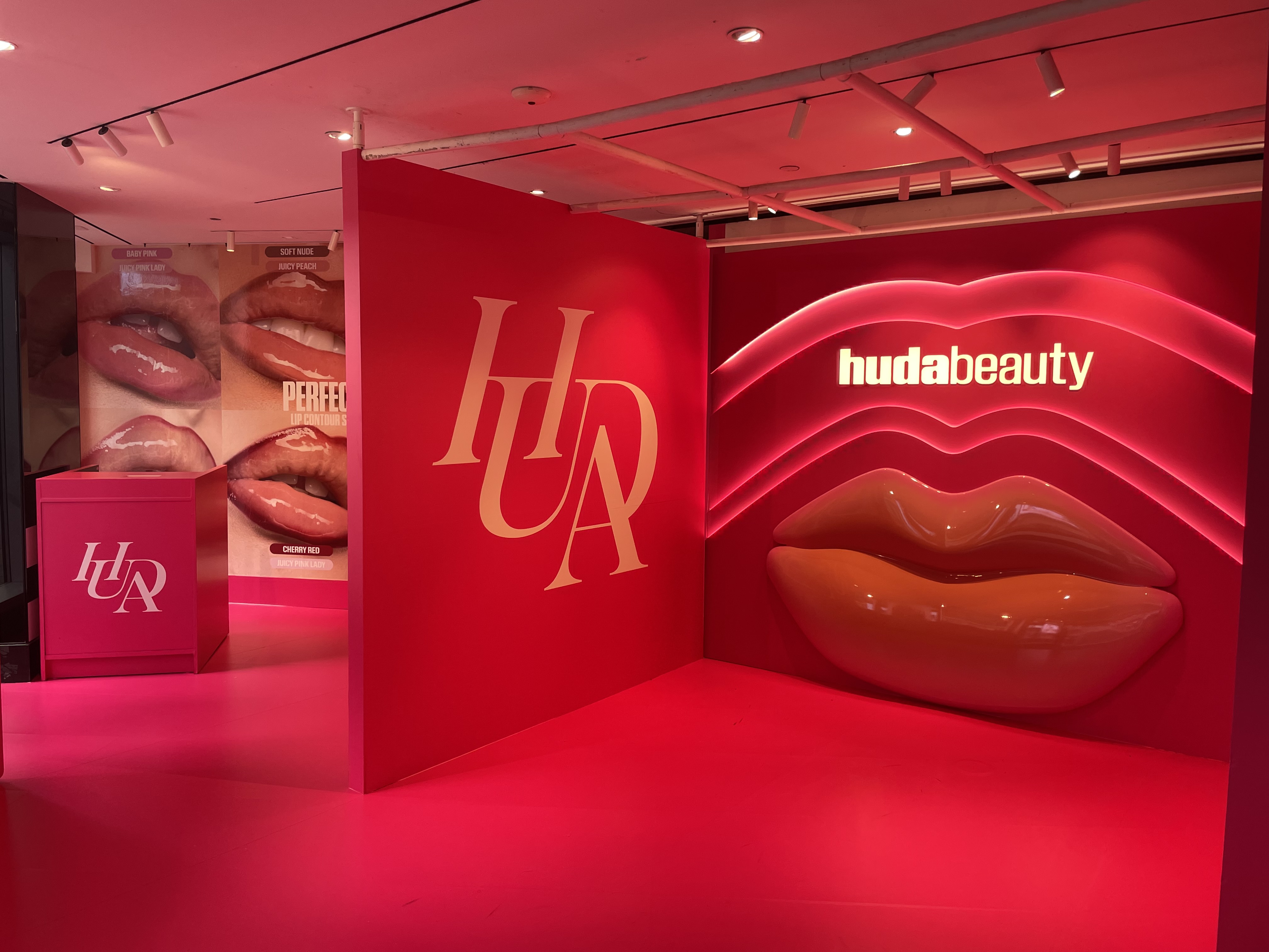 - Custom-built hero lip wall centerpiece featuring glossy 3D sculptural lips color-matched to brand shades