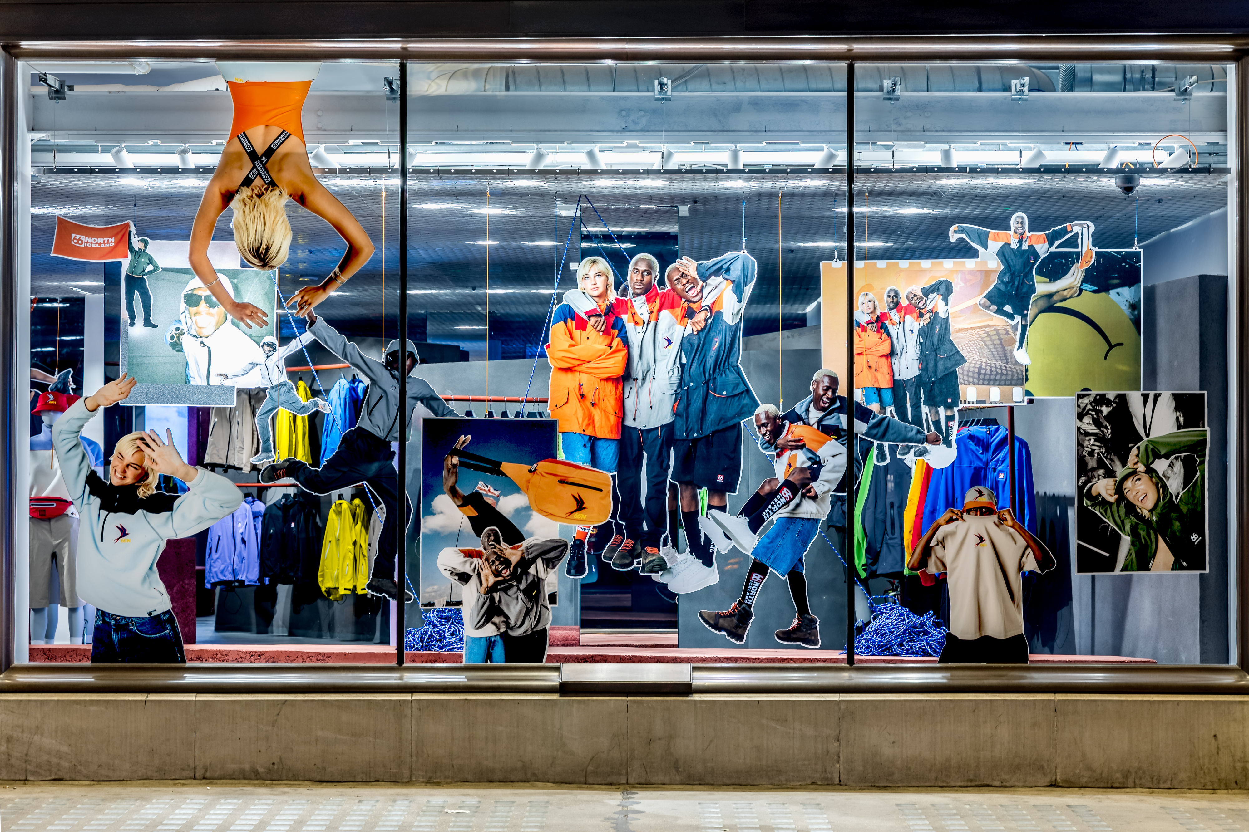 For the window, we only had a hand drawn sketch and imagery assets from their Look-Book Campaign to work from to create the desired collage effect, which consisted of multi-layers of both Vinyl direct to glass, double-sided printed reboard suspended with climbing rope and carabiners. It was also the 1st time the brand ever showcased a window scheme with no product or mannequins which made a strong visual impact on high-traffic shopping district of London UK.