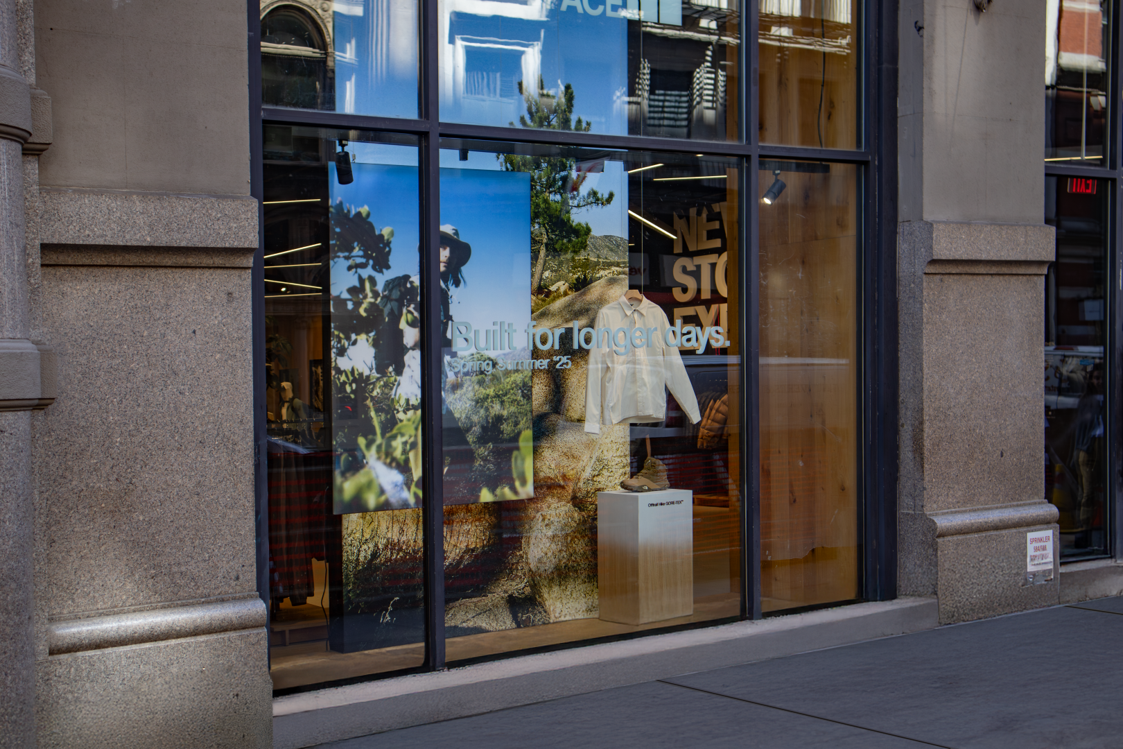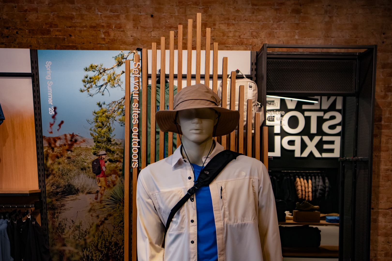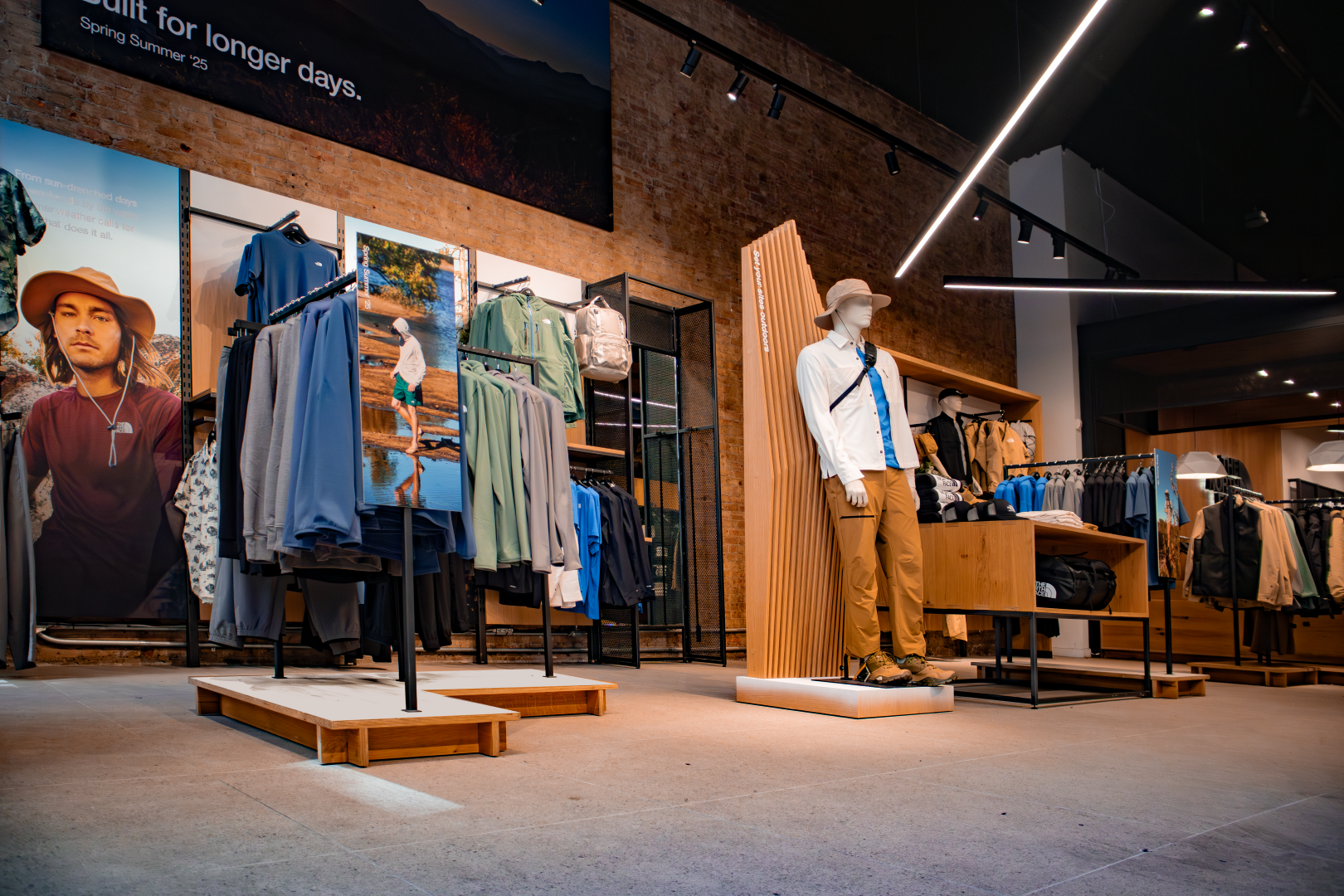 Visual Citi partnered with The North Face to create an immersive summer in-store experience — translating outdoor inspiration into tactile storytelling. Custom Wood-Slat Fixture: CNC-cut vertical planks crafted from plywood and hand-finished in a warm, natural oak veneer. The structure mimics a rising ridgeline and serves as a sculptural focal point for key product displays. Integrated Branded Messaging: The phrase “Set Your Sites Outdoors” was precision-cut and attached to the wooden elements, maintaining brand clarity while blending into the overall form. Naturalistic Textures: Large-format scenic printed graphics are used throughout the store interior and window display to create a seamless visual journey from city sidewalk to trailhead. Product - Driven Plinths: Custom-built display pedestals rolled out to +50 doors — allowing apparel and footwear to stand out without distraction. Outdoor energy, captured in-store and built for impact!