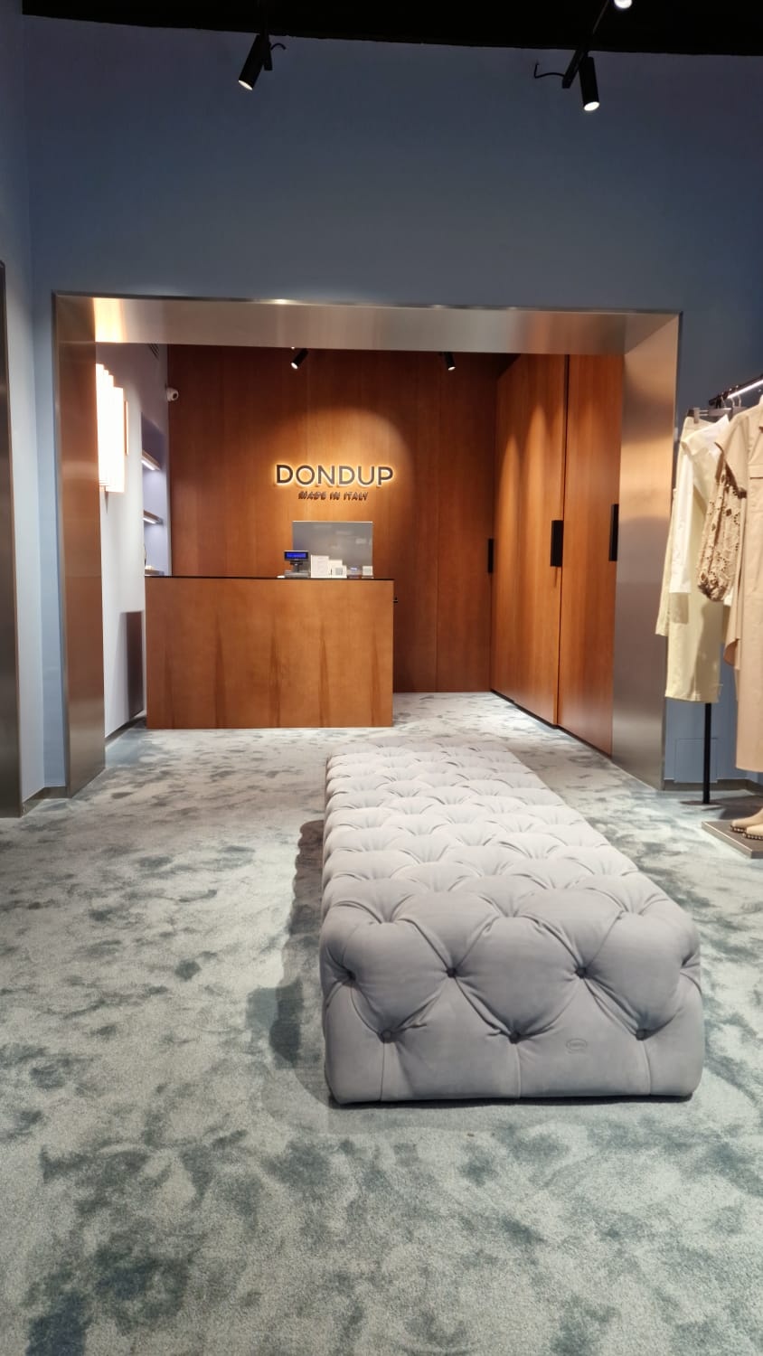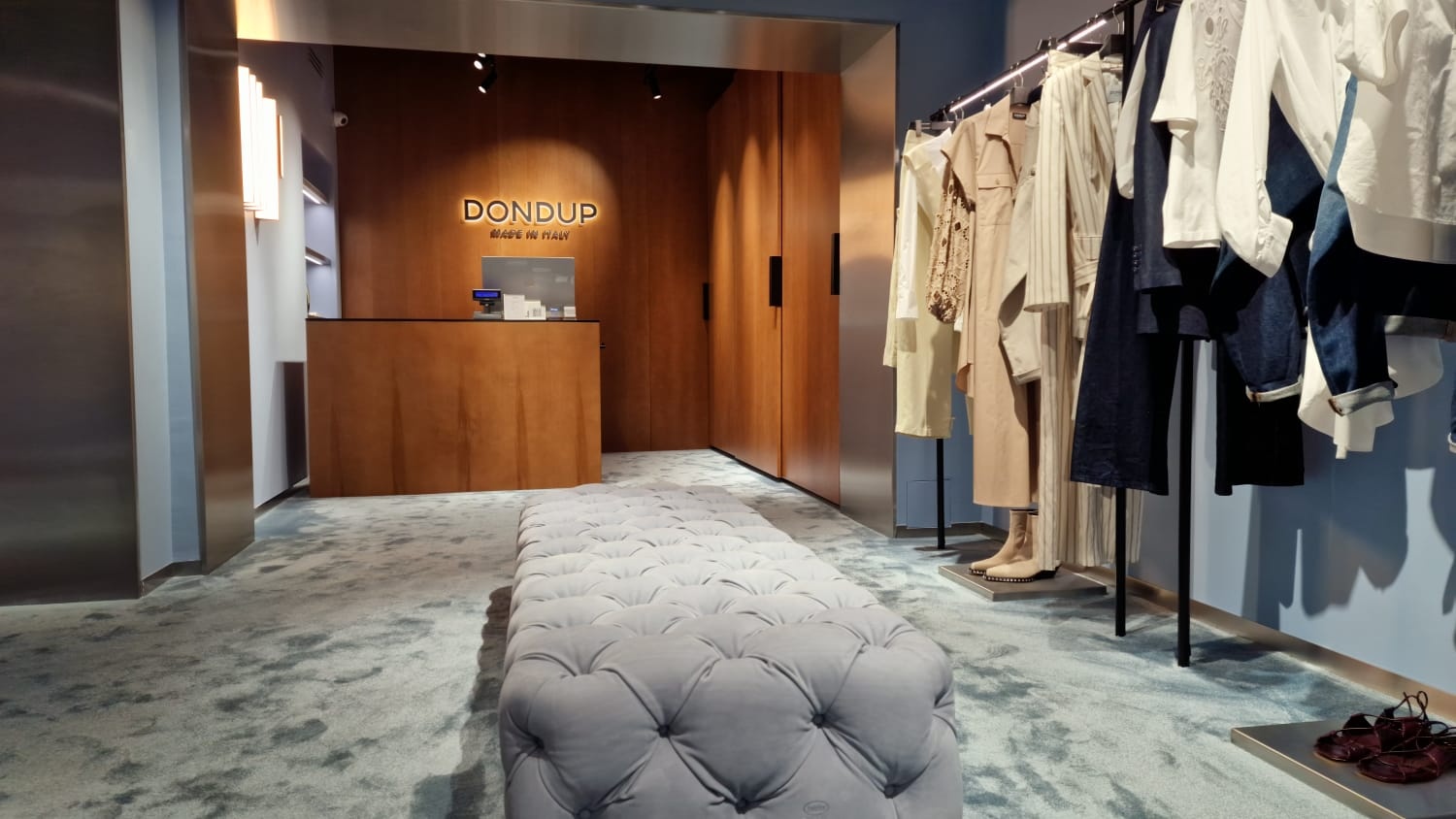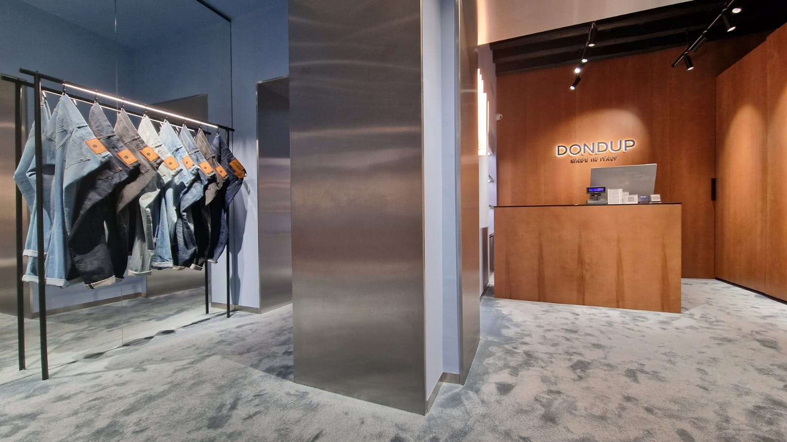 The concept of the Dondup store in Milan’s Via Della Spiga comes to life in the new location through the skillful use of soothing colors and tones, such as the light blue carpeting and walls, the sleekness of satin-finished steel, and the warmth of oak wood.