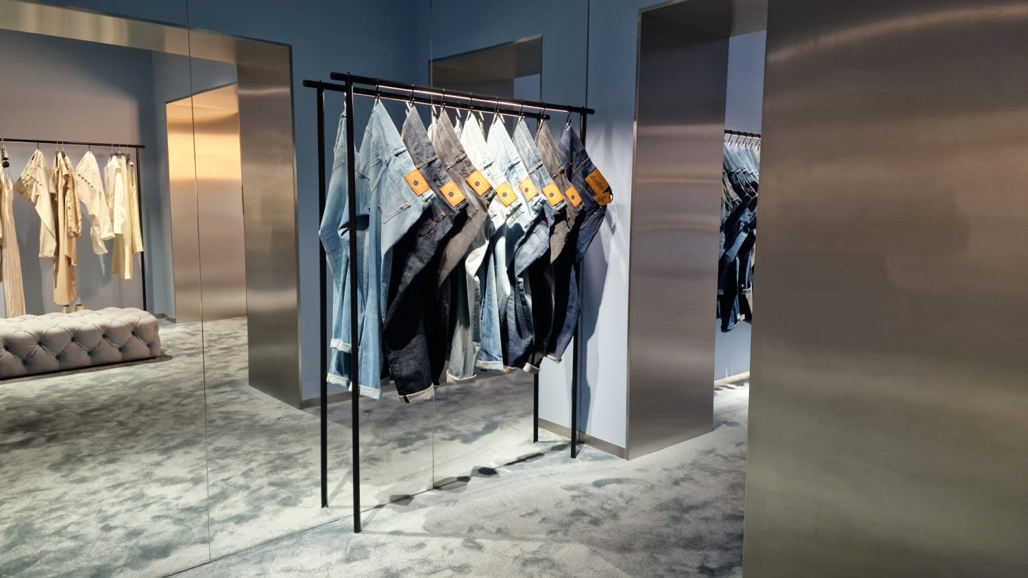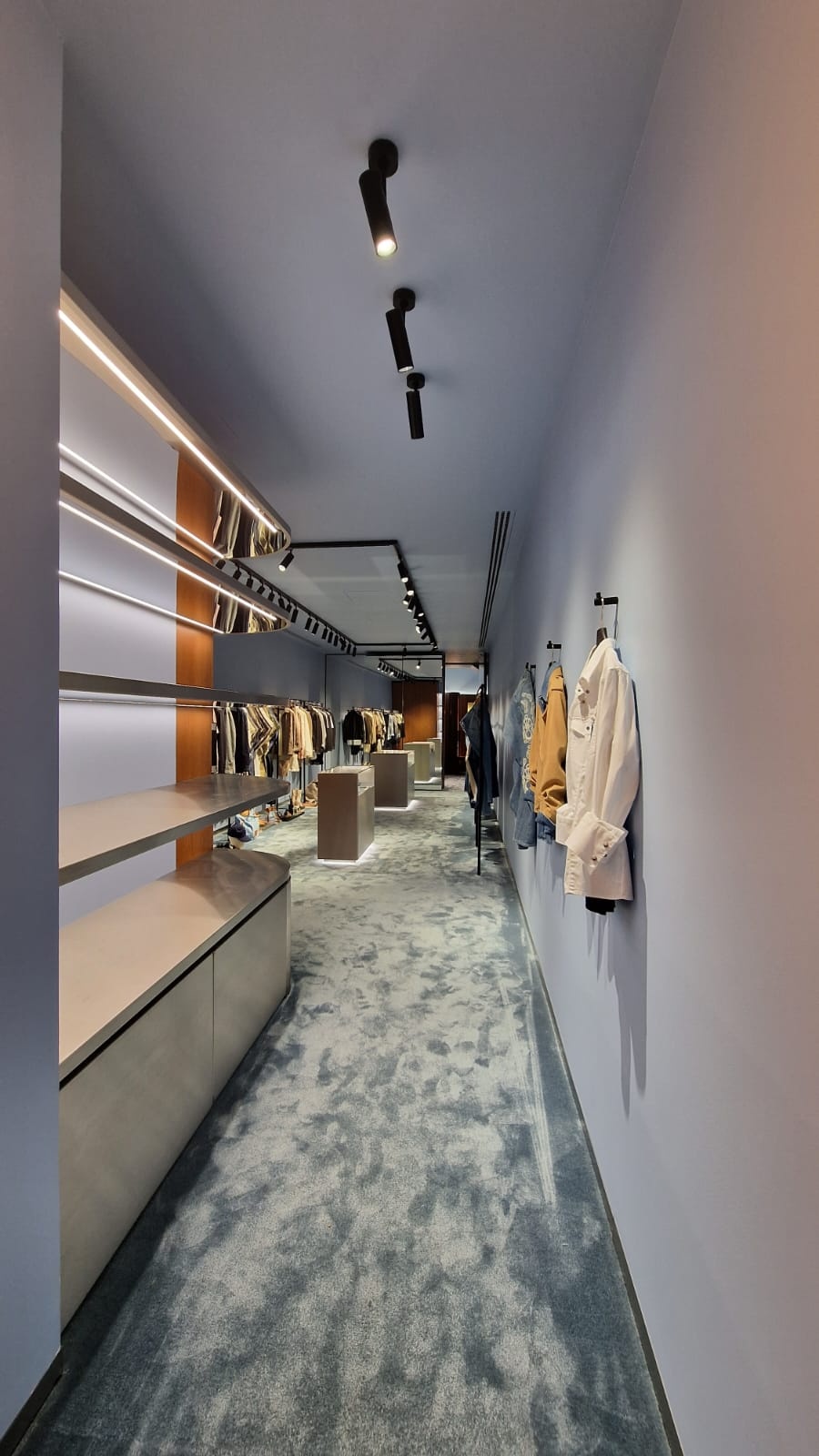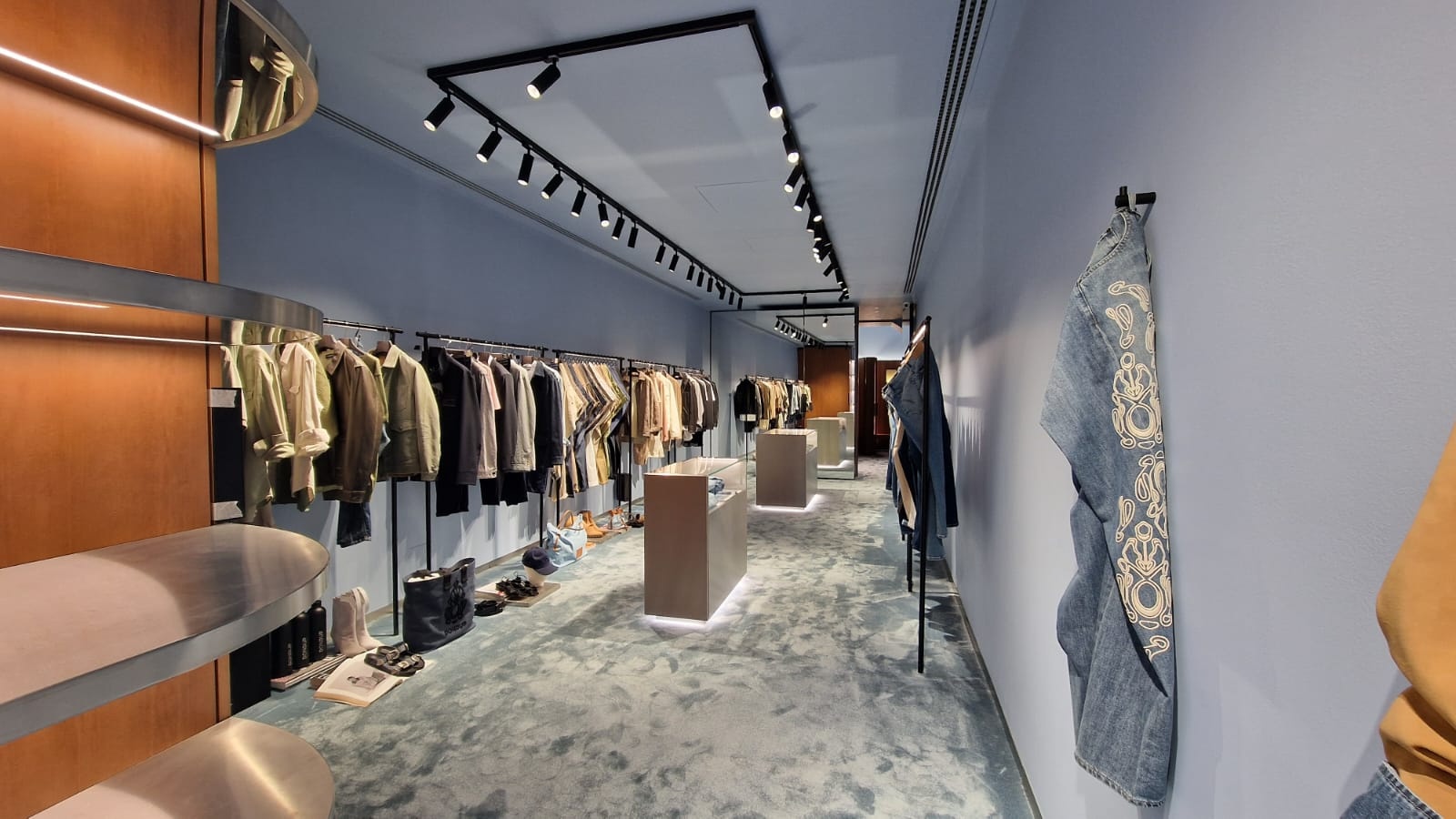 The concept of the Dondup store in Milan’s Via Della Spiga comes to life in the new location through the skillful use of soothing colors and tones, such as the light blue carpeting and walls, the sleekness of satin-finished steel, and the warmth of oak wood.