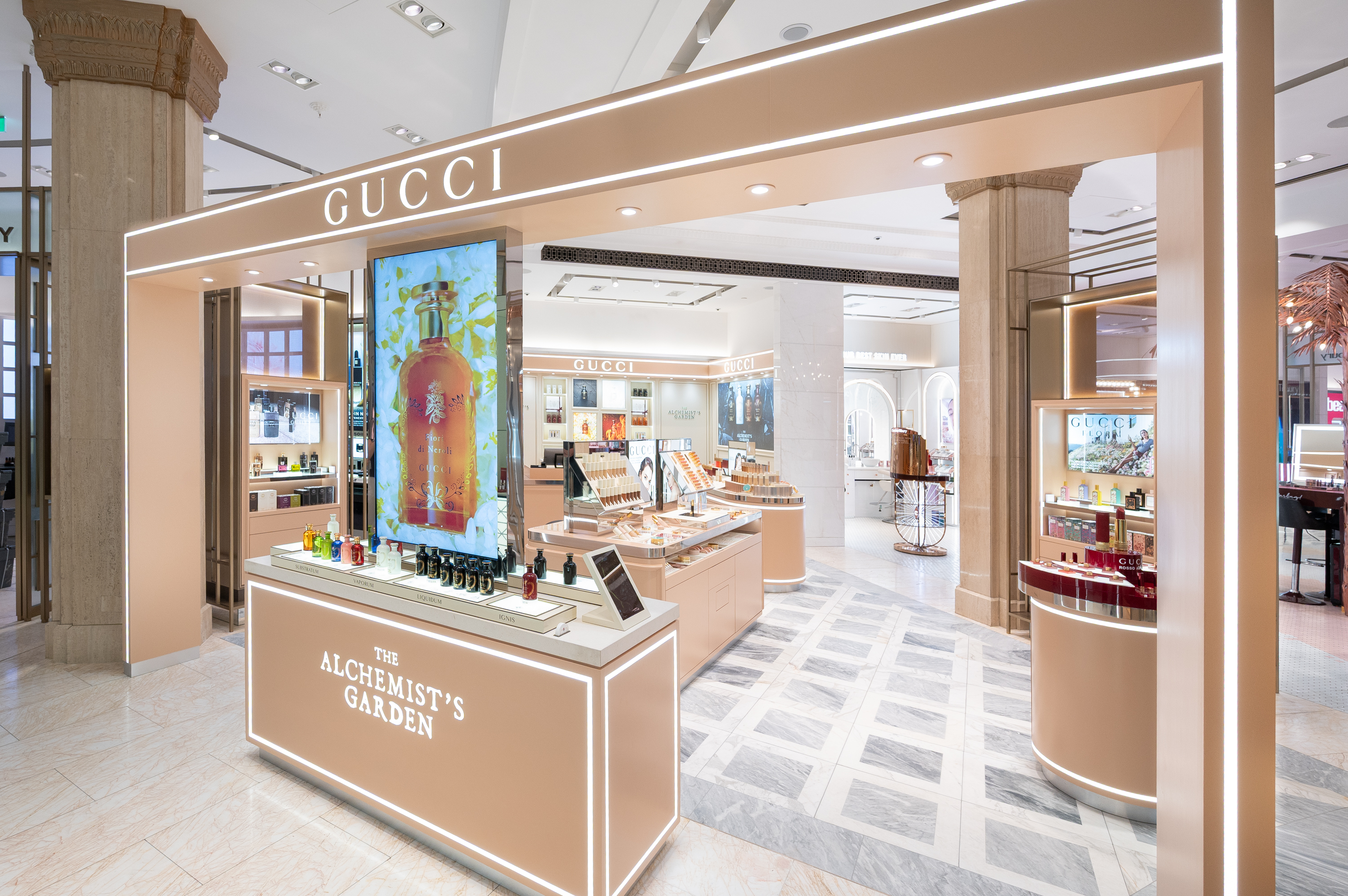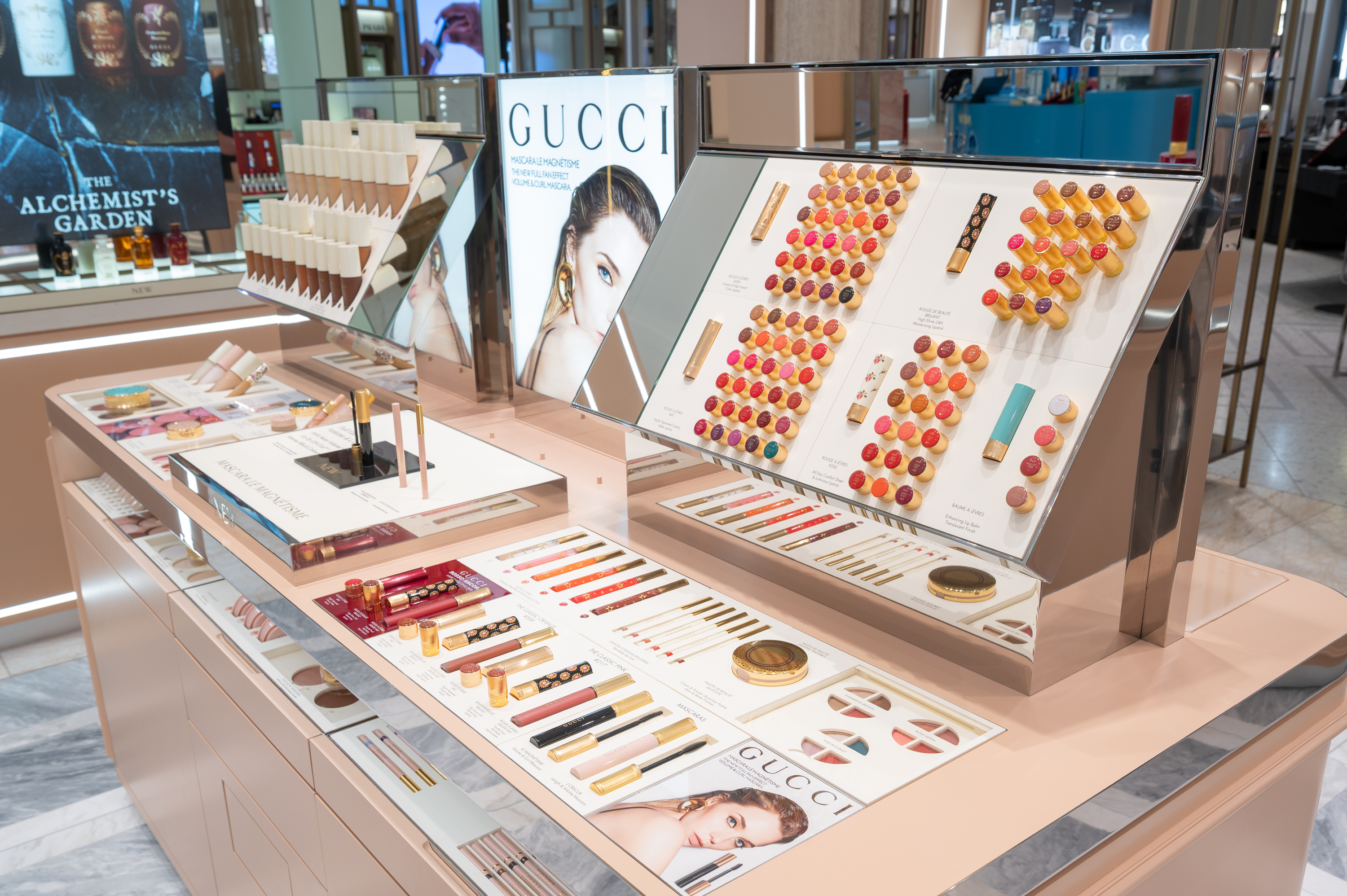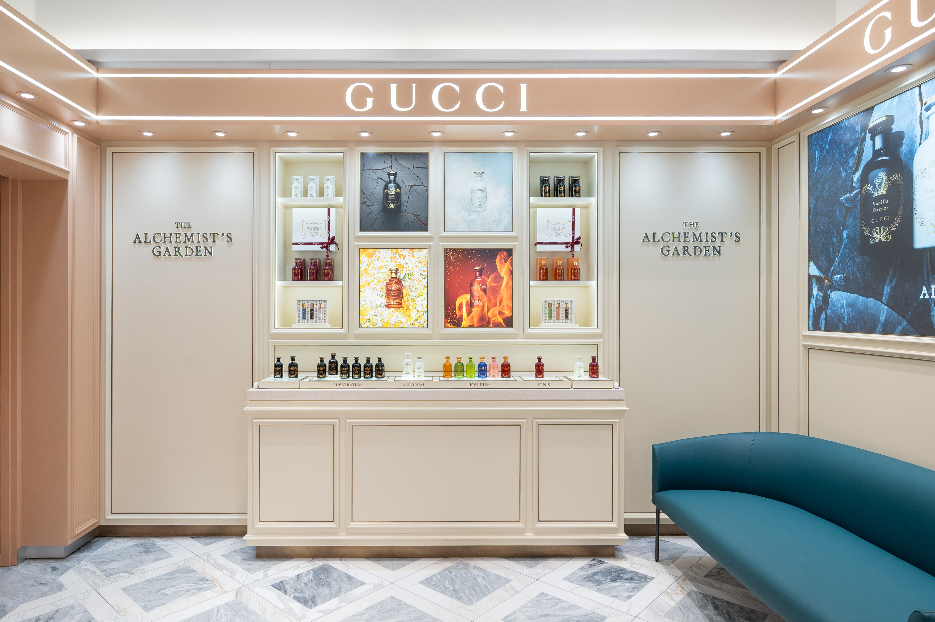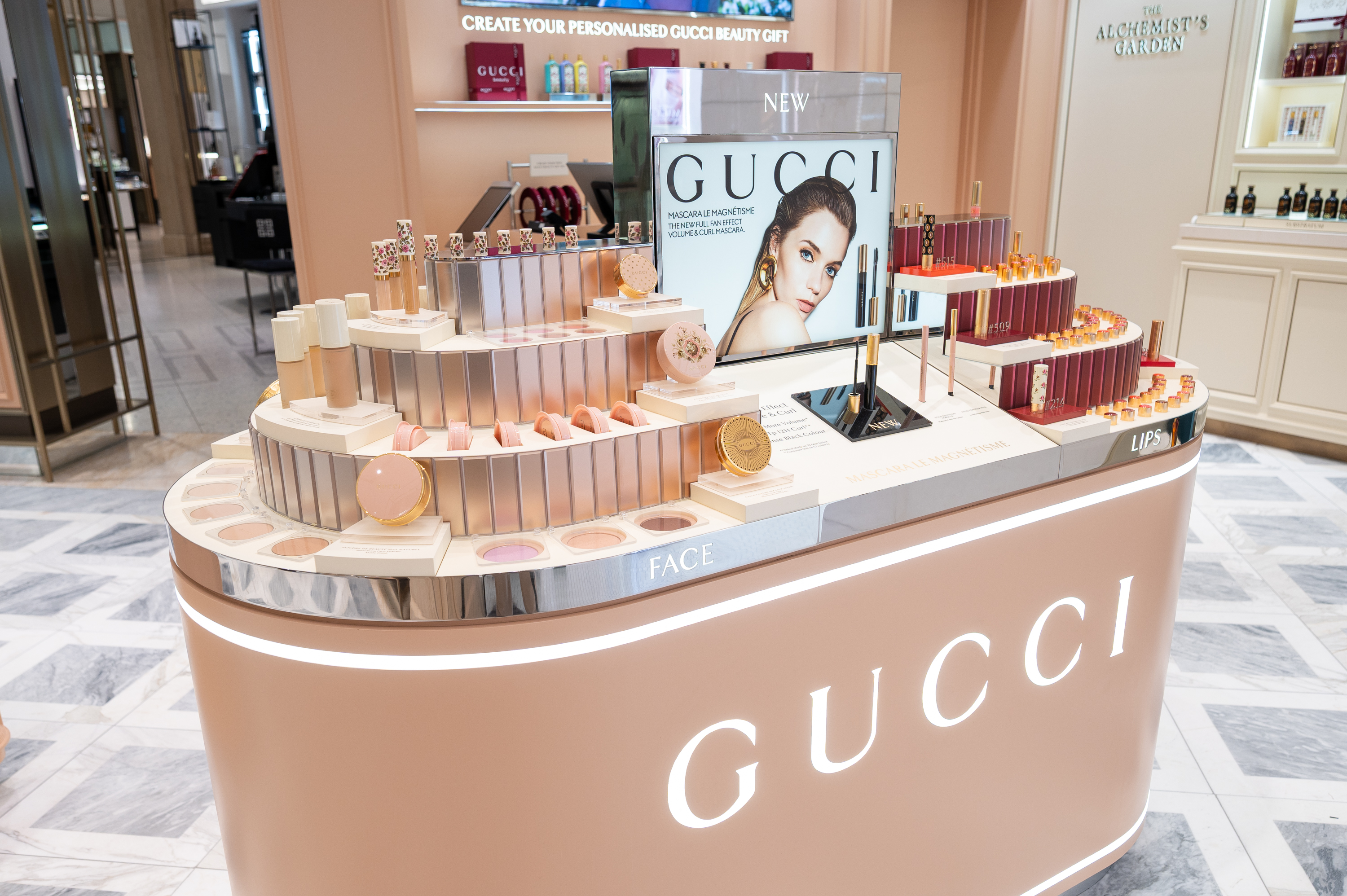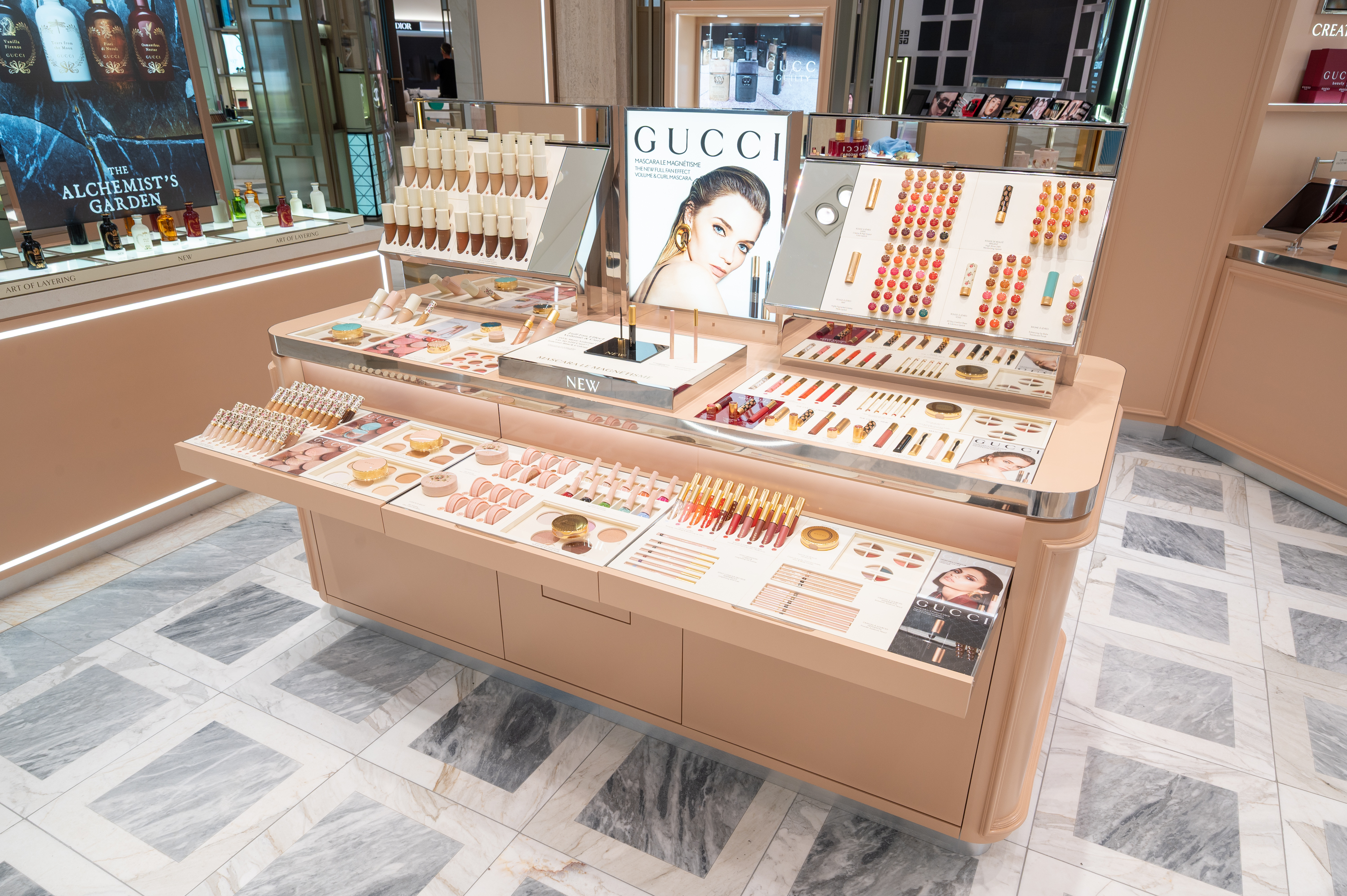 The boutique embodies Gucci Beauty’s new Store Design concept, created in avant-premiere for Harrods with exclusive elements like custom flooring in Italian Bardiglio Nubolato and Calacatta marbles, showcasing Gucci’s signature passion for striking graphic patterns.