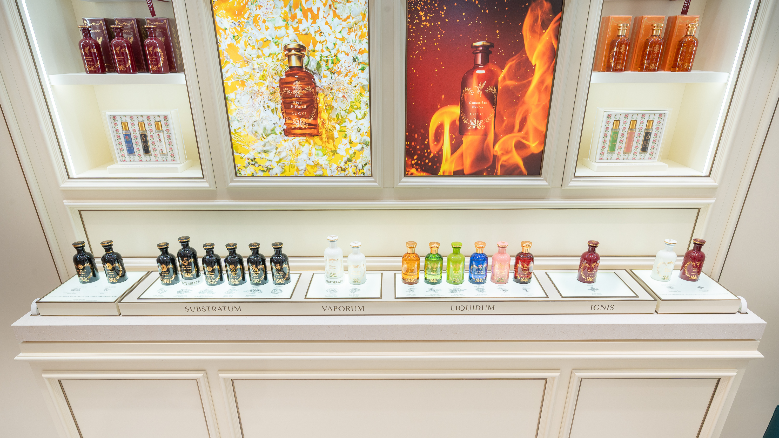 The luxury fragrance collection The Alchemist’s Garden is reimagined through storytelling, tactile materials such as Florence Pietra Serena limestone, and creative combinations that invite customers to layer and craft personalized alchemic scents.