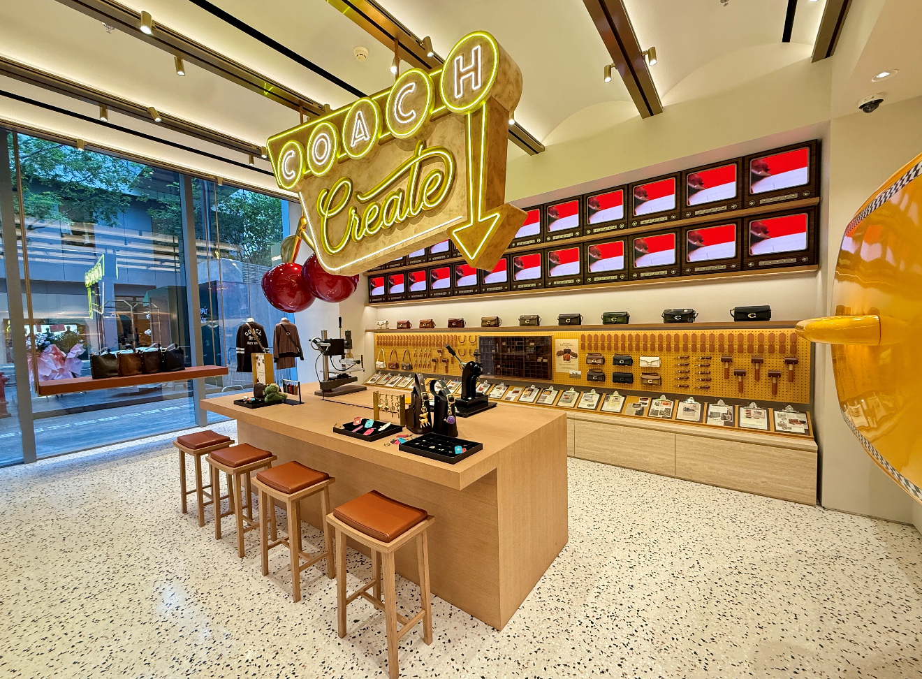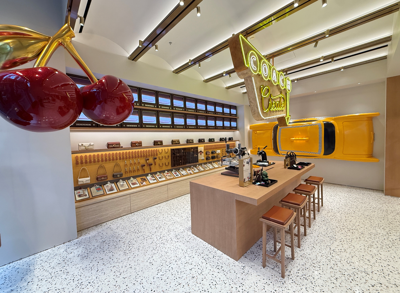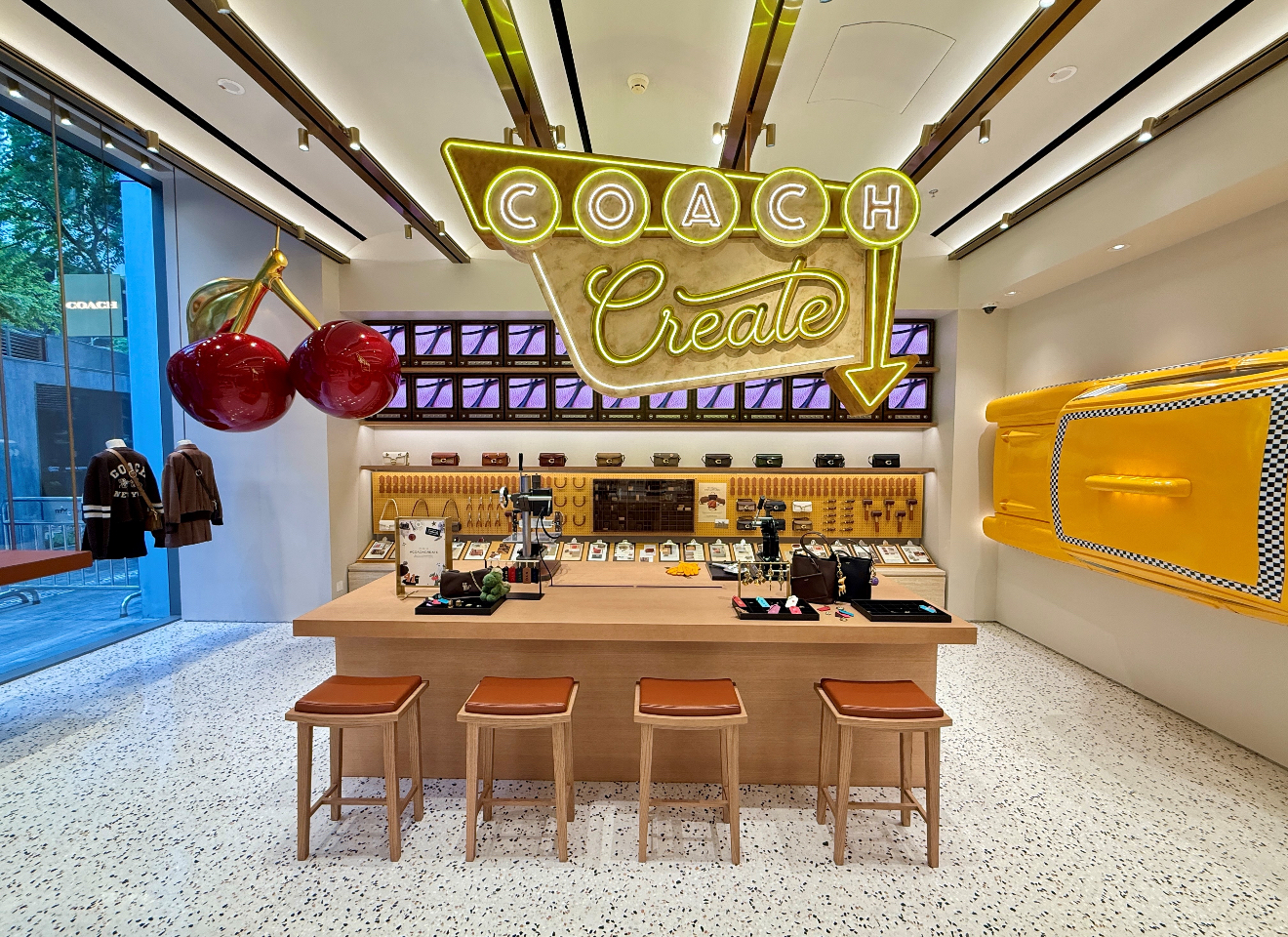 Coach opens a new stores at the iconic Shenzhen MixC World. This new location features a bespoke Coach Create bar: a place for customization, programming & community building. We love our iconic cherry & taxi bag charms so much that we made them oversized and interactive!