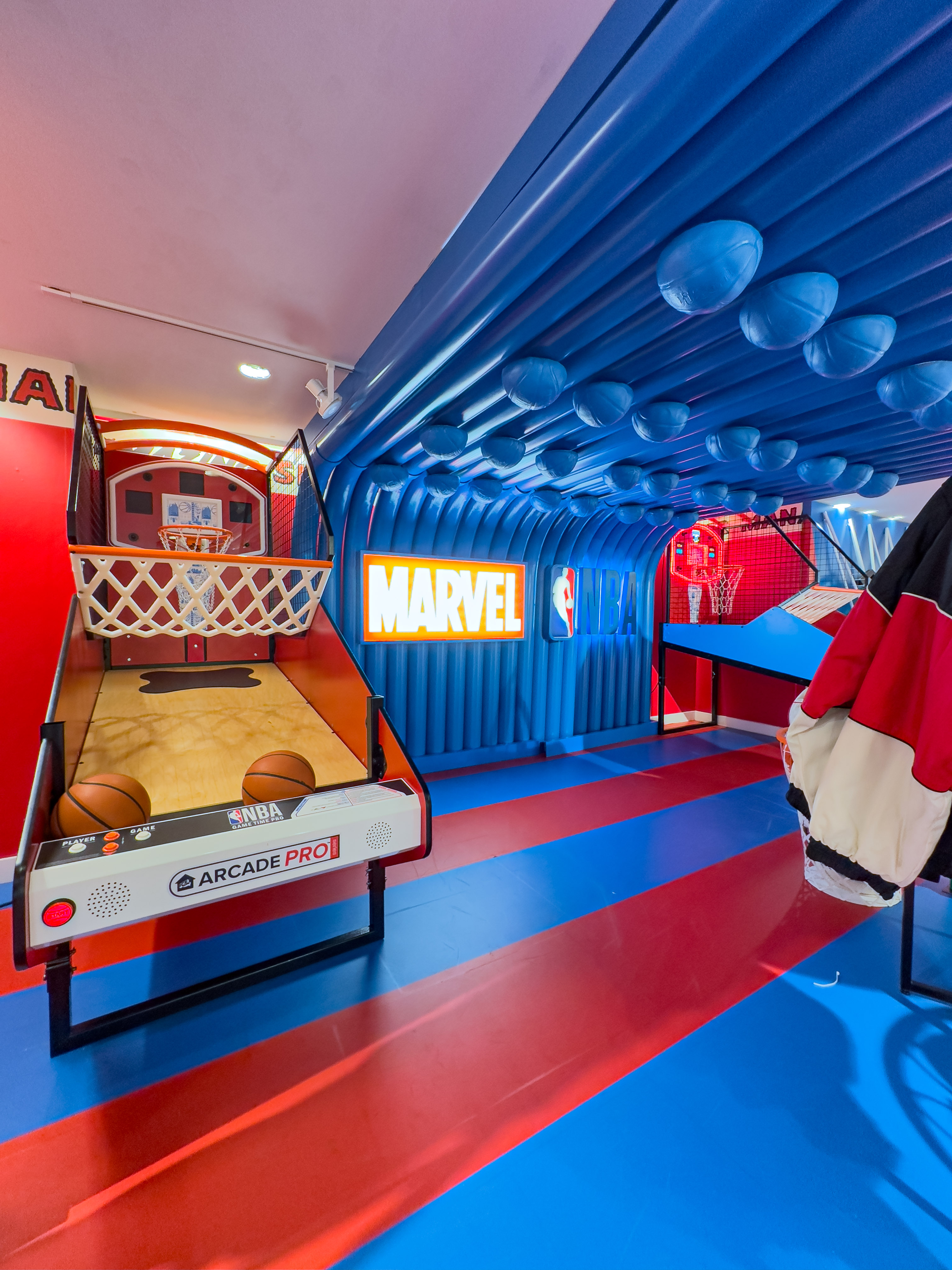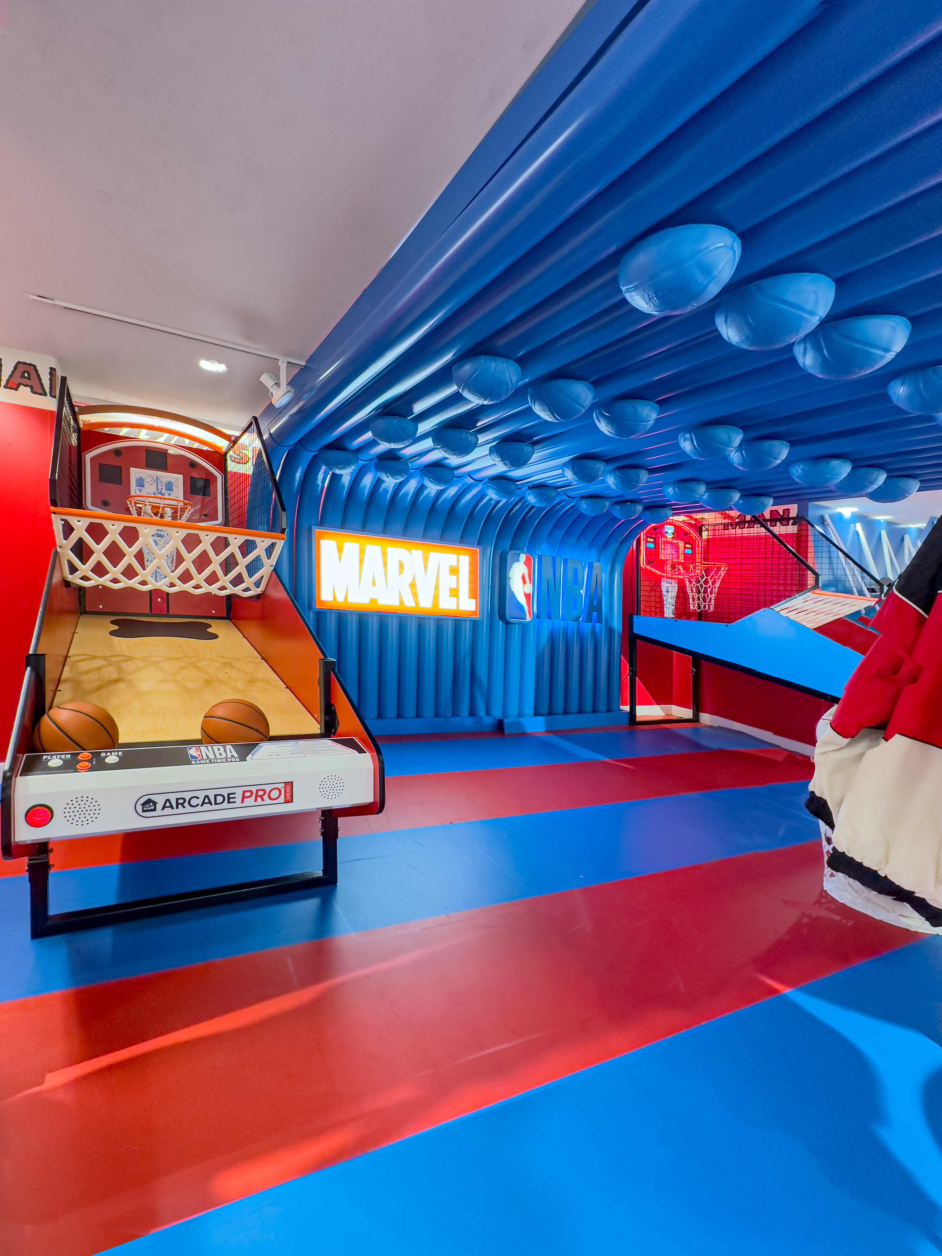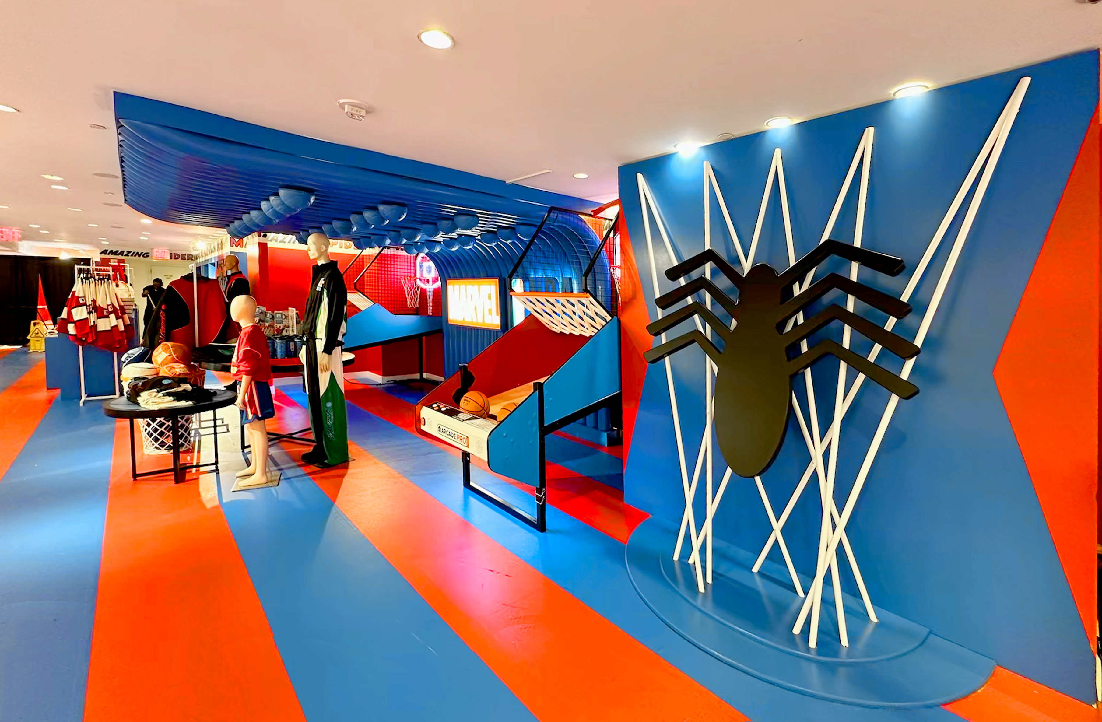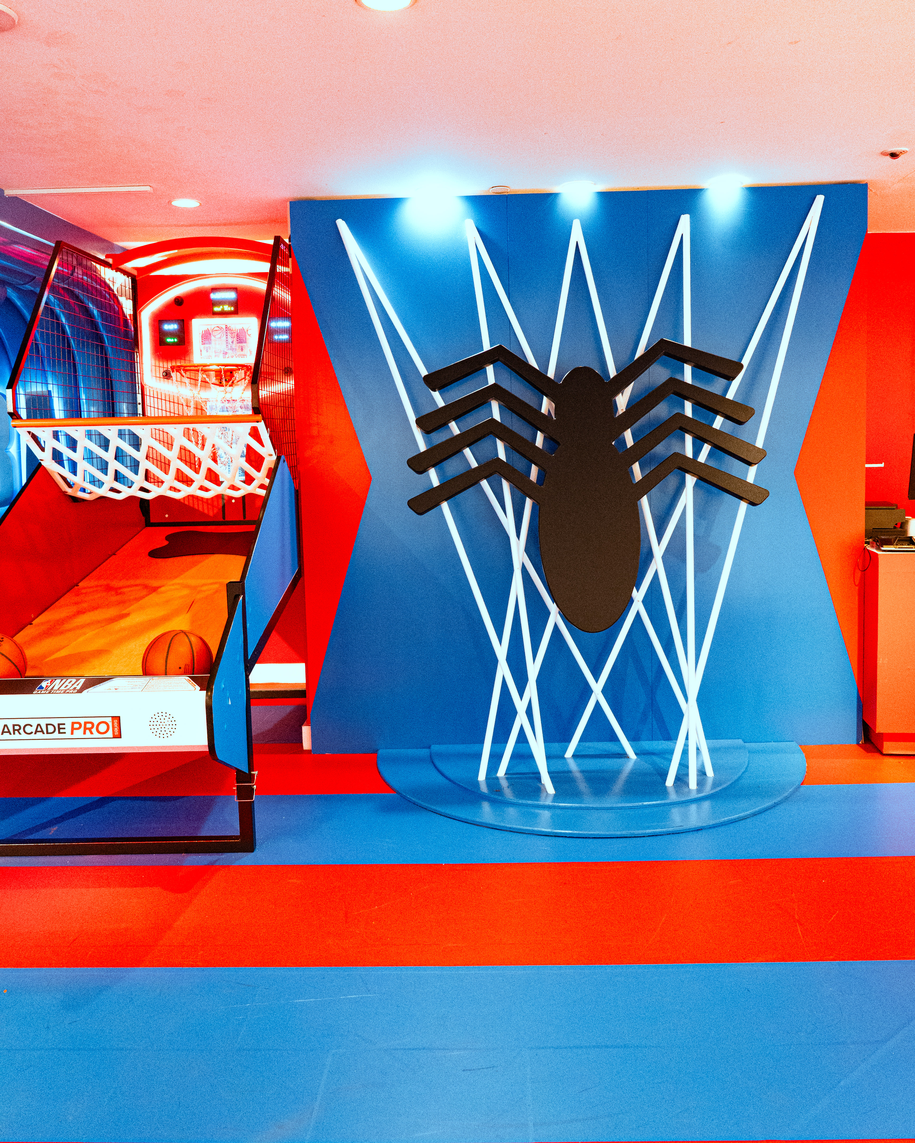 Key production elements included a custom-fabricated tube wall with illuminated logos, a 3D sculpted Spider-Man web, and spray-finished lockers featuring vinyl-wrapped shelving and branded backings. Duggal’s team also produced painted trays, clear acrylic poster containers, dimensional signage, and floor and wall vinyls, complemented by interactive basketball games wrapped in custom graphics to extend the in-store engagement.