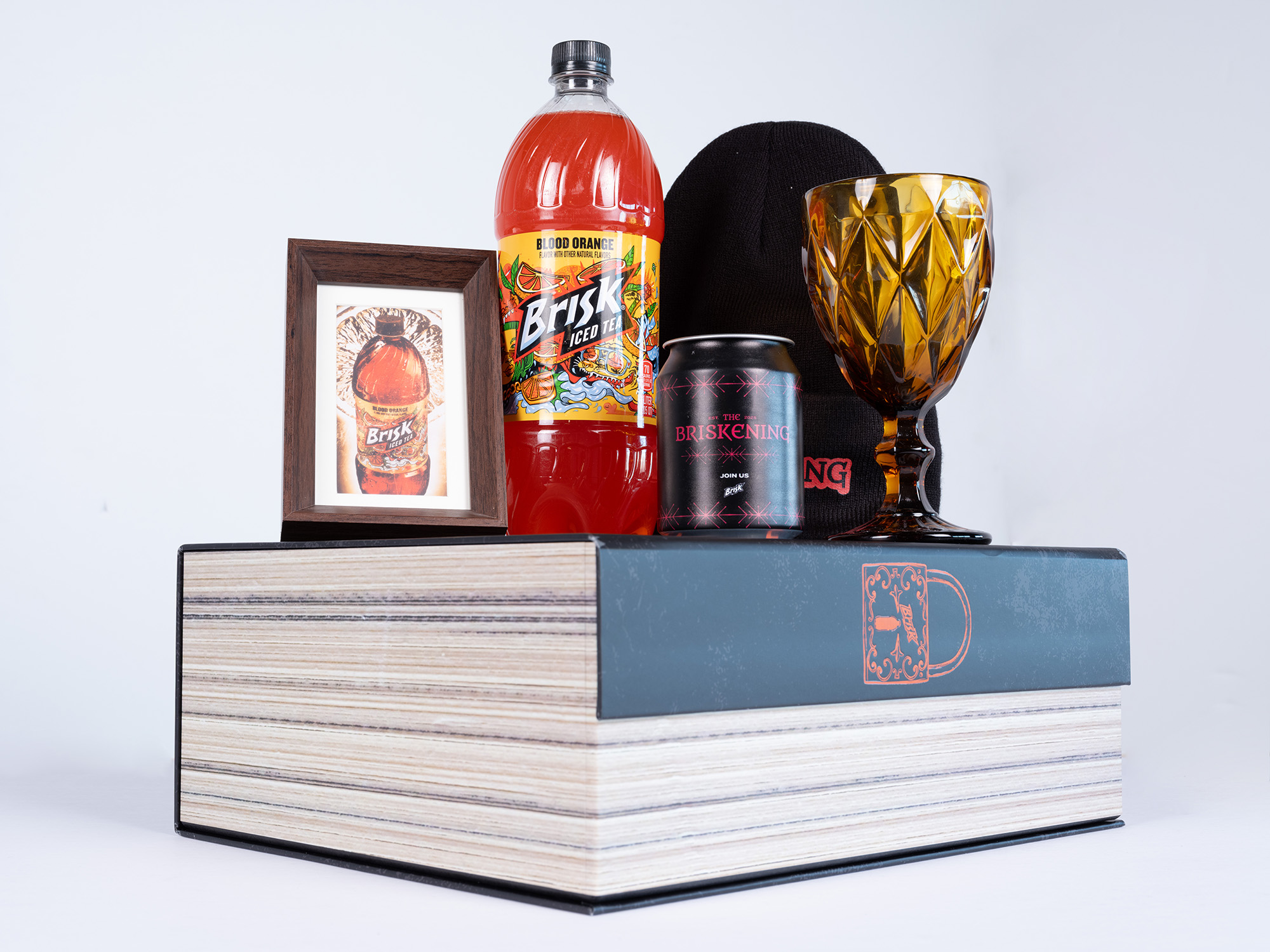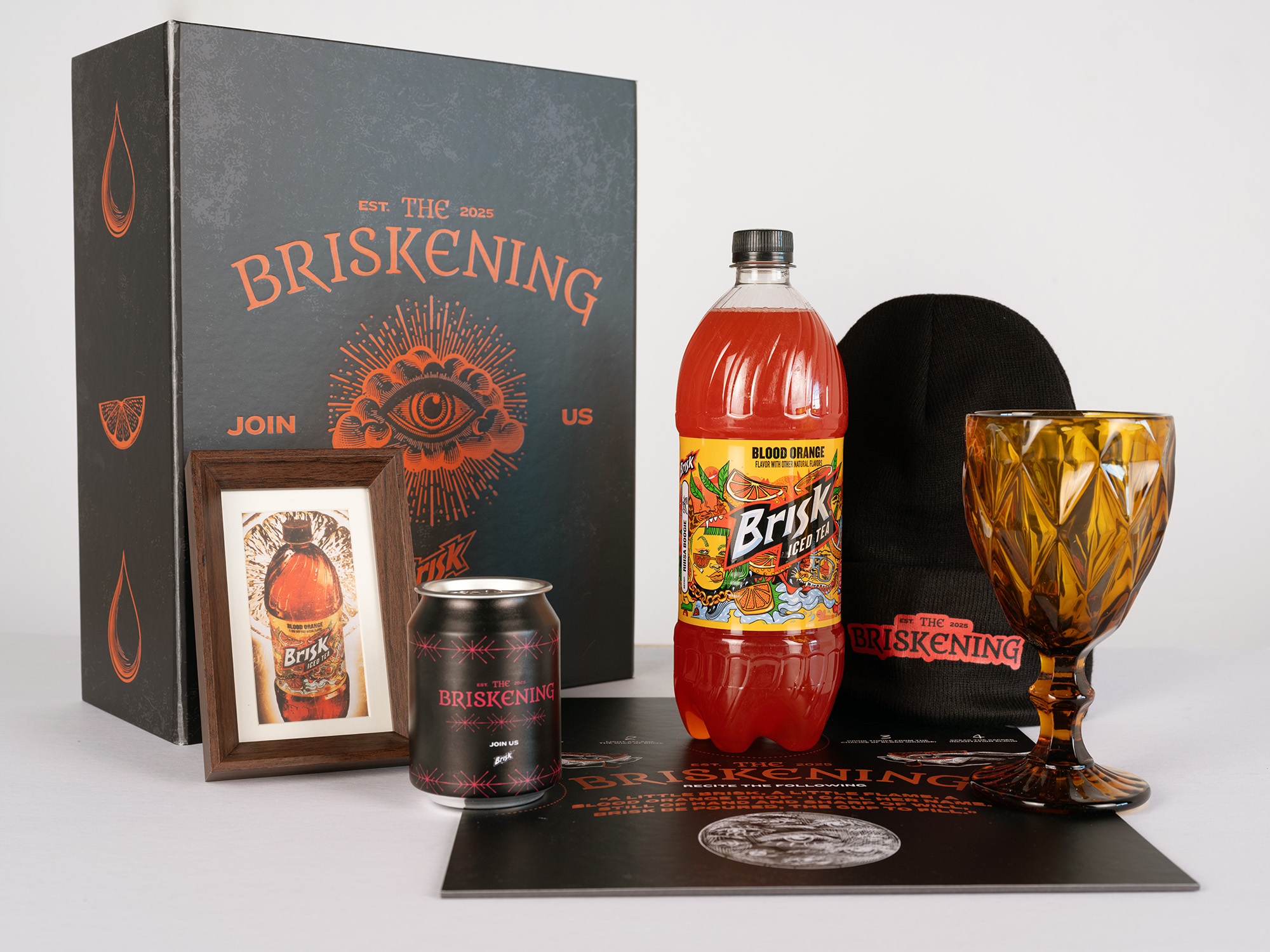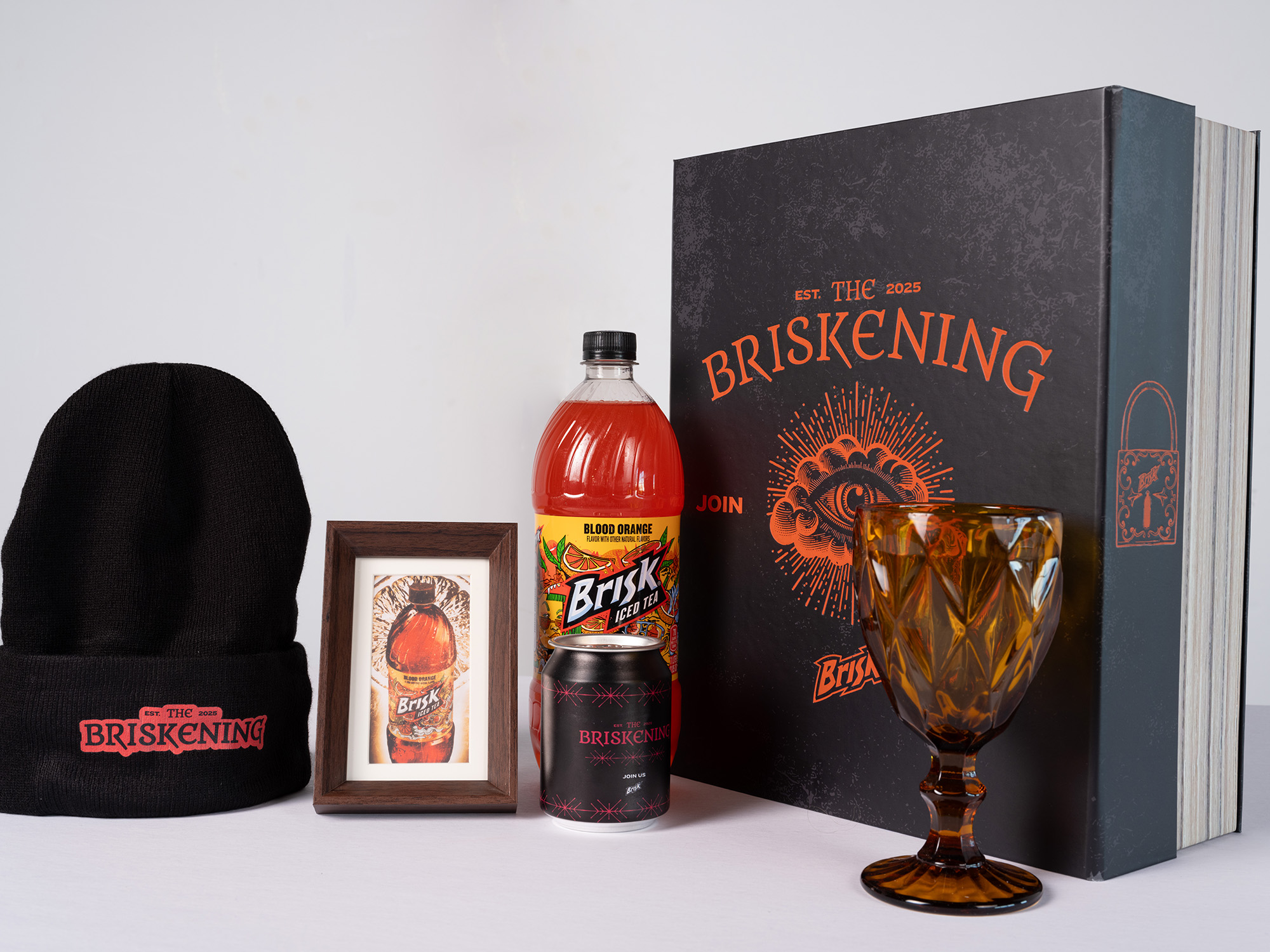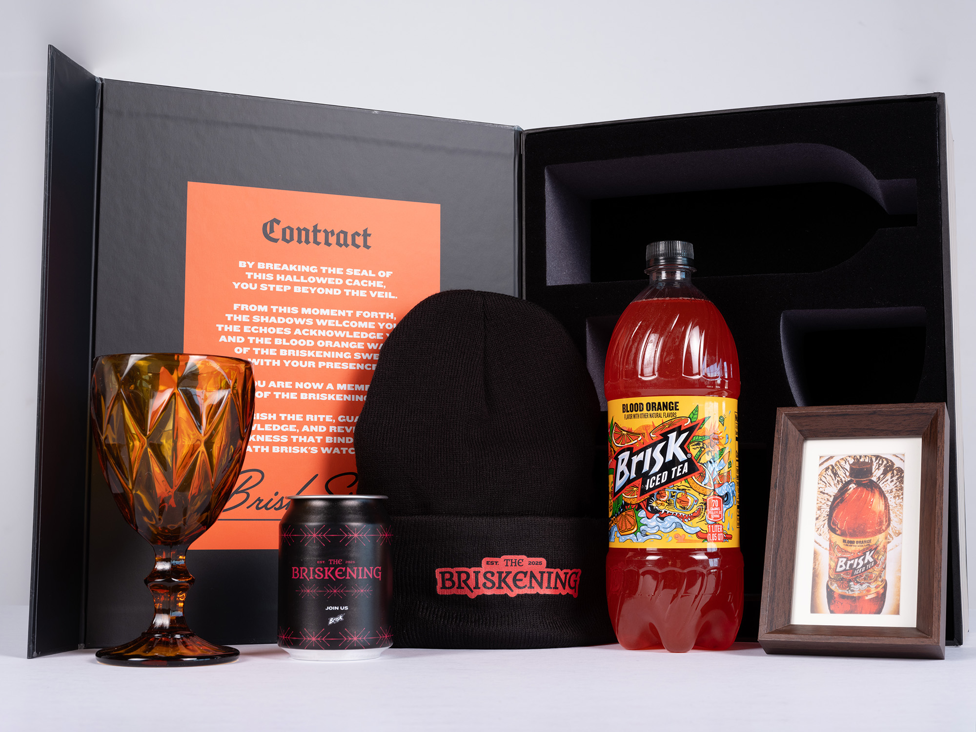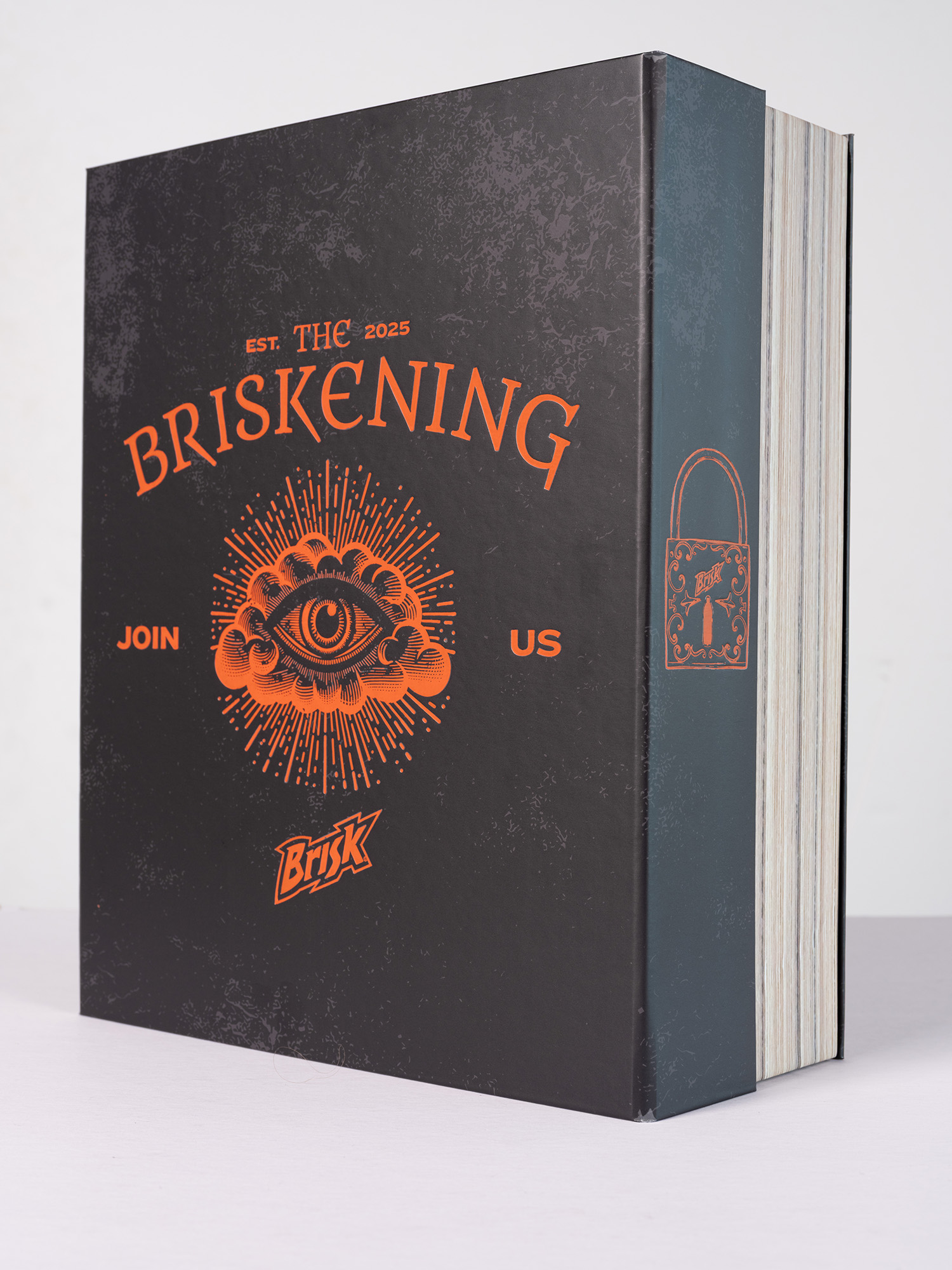 Duggal produced the custom packaging for Brisk’s limited-edition “Briskening” influencer kit, created for the Blood Orange campaign in October 2025. Our team fabricated the oversized book-style box, engineered the structural foam insert, and printed all exterior and interior graphics, balancing matte textures with vivid orange accents to heighten the reveal. Each kit was designed for an immersive unboxing moment, housing a bottle of Brisk Blood Orange, a branded beanie, a gothic-styled chalice, and collectible artwork. The result delivered a dramatic, story-driven presentation that showcased Brisk’s visual identity through bold color, craft, and attention to detail, making the kit a standout in influencer gifting and branded experiences.