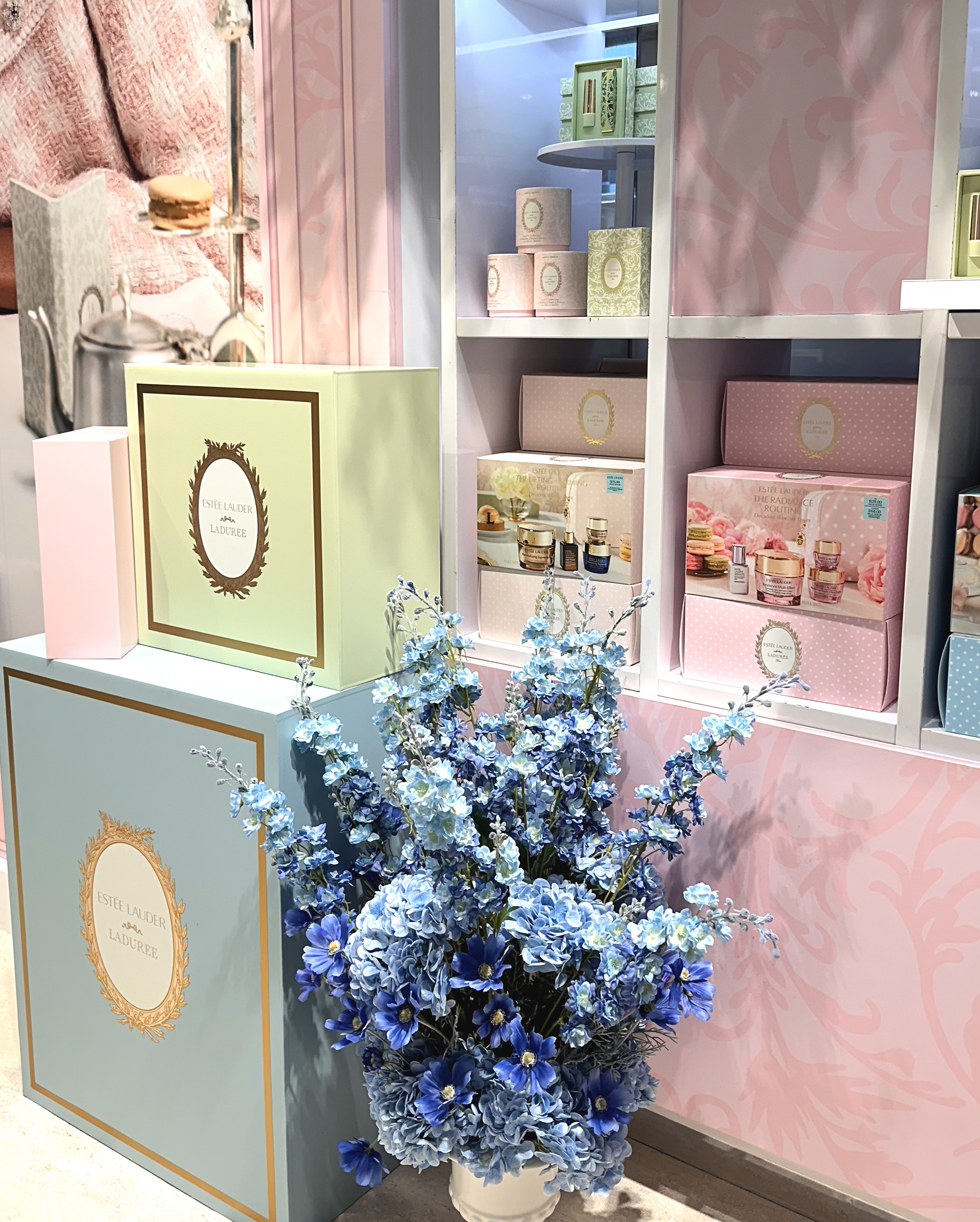 Duggal produced and installed a full suite of branded elements, including MDF-built awnings, column graphics, vinyl-wrapped fixtures with shelving and doors, and a series of XL decorative boxes that anchored the space. To complete the immersive environment, the team crafted lush blue hydrangea, delphinium, wisteria, and ranunculus arrangements — adding a sense of romantic flourishes and sculptural dimension that echoed the confection-inspired packaging.