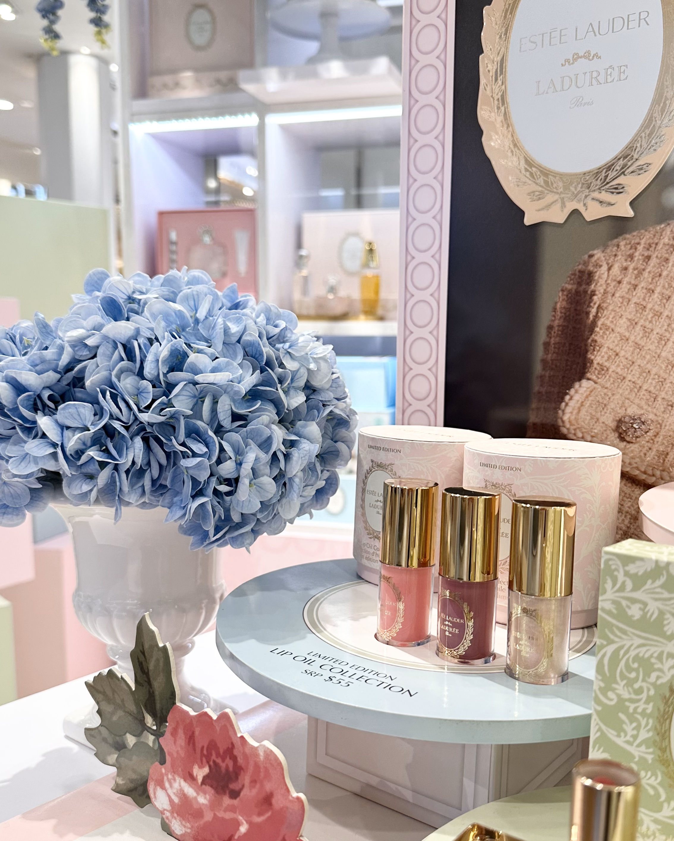 For the Spring 2025 season, Duggal Visual Solutions brought the Estée Lauder × Ladurée collaboration to life with a pastel-rich “Spring Outpost” installation at Macy’s Herald Square. Inspired by the elegance of Parisian patisseries, the pop-up featured custom-fabricated display bunkers wrapped in soft mint, rose, and powder-blue vinyls; oversized rigid boxes accented with raised gold acrylic emblems; and a delicately patterned backdrop that framed the full collection of limited-edition gift sets.