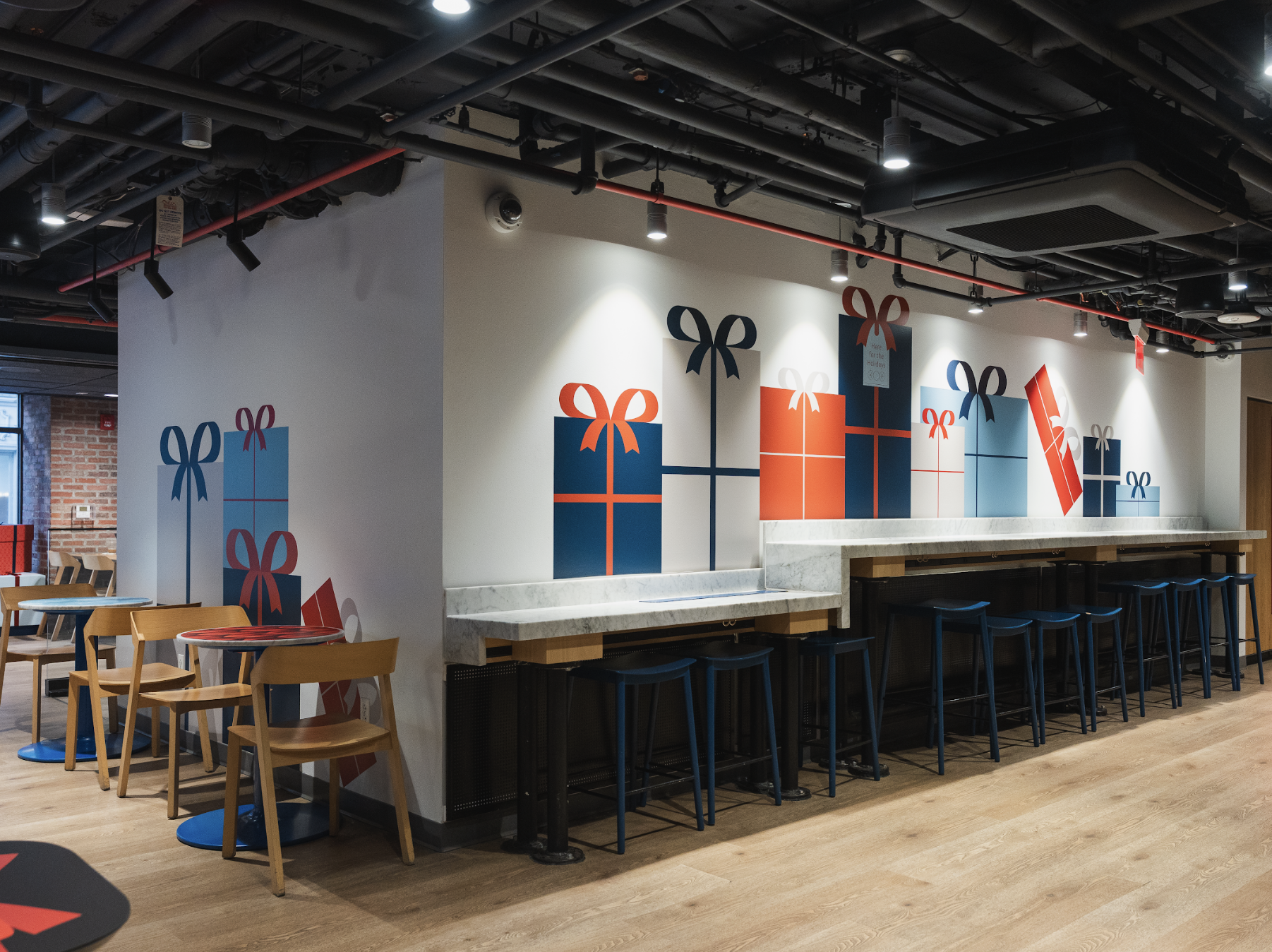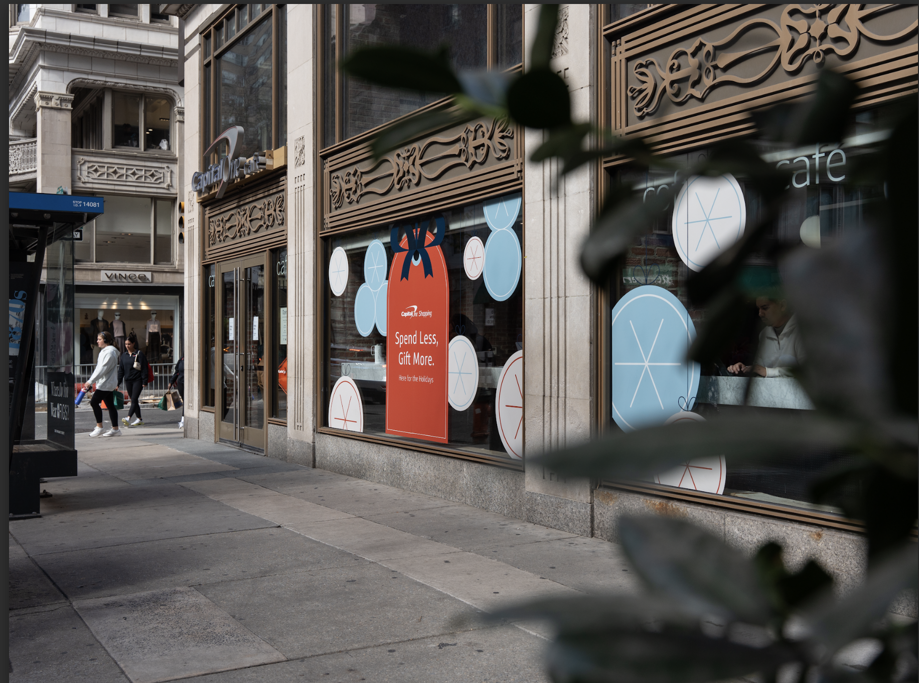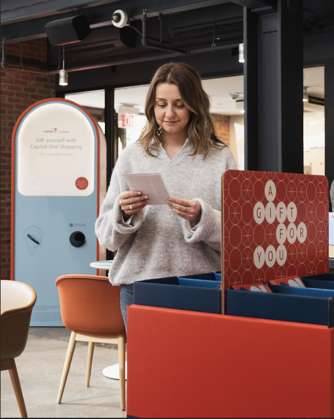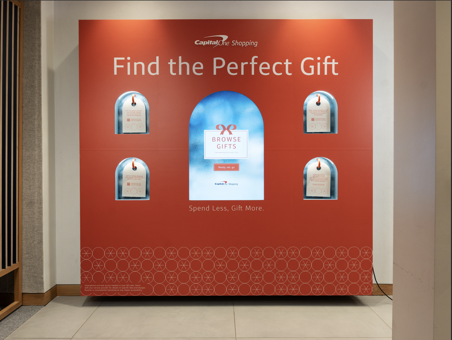The Capital One Cafe transformed into a festive holiday hub for an activation focused on promoting Capital One Shopping, positioning it as the ultimate interactive tool for finding the best gifts and deals of the season. The activation immediately captured the holiday spirit with: Engaging Holiday-Themed Facade Graphics: The exterior of the cafe was adorned with lively and festive holiday graphics. These visuals created a warm, inviting atmosphere, clearly signaling the season and drawing guests in with promises of holiday cheer and smart shopping solutions. Inside, the experience was driven by interactive, gift-focused environment: Interactive "Best Gift Options" Quiz Hubwall: The cafe featured an interactive hub wall hosting a fun and engaging quiz. This quiz challenged customers on their knowledge of the best holiday gift options based on the recipient, cleverly integrating information about how Capital One Shopping can help them save money and find perfect presents. The gamified format made learning about the platform enjoyable and memorable. The Large Gift Machine: Adding an element of playful suspense, a large gift “gumball” machine was prominently featured. Customers who engaged with the gift machine would receive a festive ornament from the machine with select ornaments holding a free coffee card.These ornaments can be decorated and can become a delightful holiday keepsake. To complete the experience and encourage the use of Capital One Shopping, customers received practical and festive takeaways: Festive Winter Holiday Cards: Guests received beautifully designed festive winter holiday cards, perfect for sending to friends and family. Stickers for Wrapping: They also received stickers for wrapping—a perfect complement for all the amazing gifts they purchased with the help of Capital One Shopping. This activation successfully blended the joy of the holiday season with the practical value of Capital One Shopping, creating a memorable, interactive, and rewarding in-cafe experience.