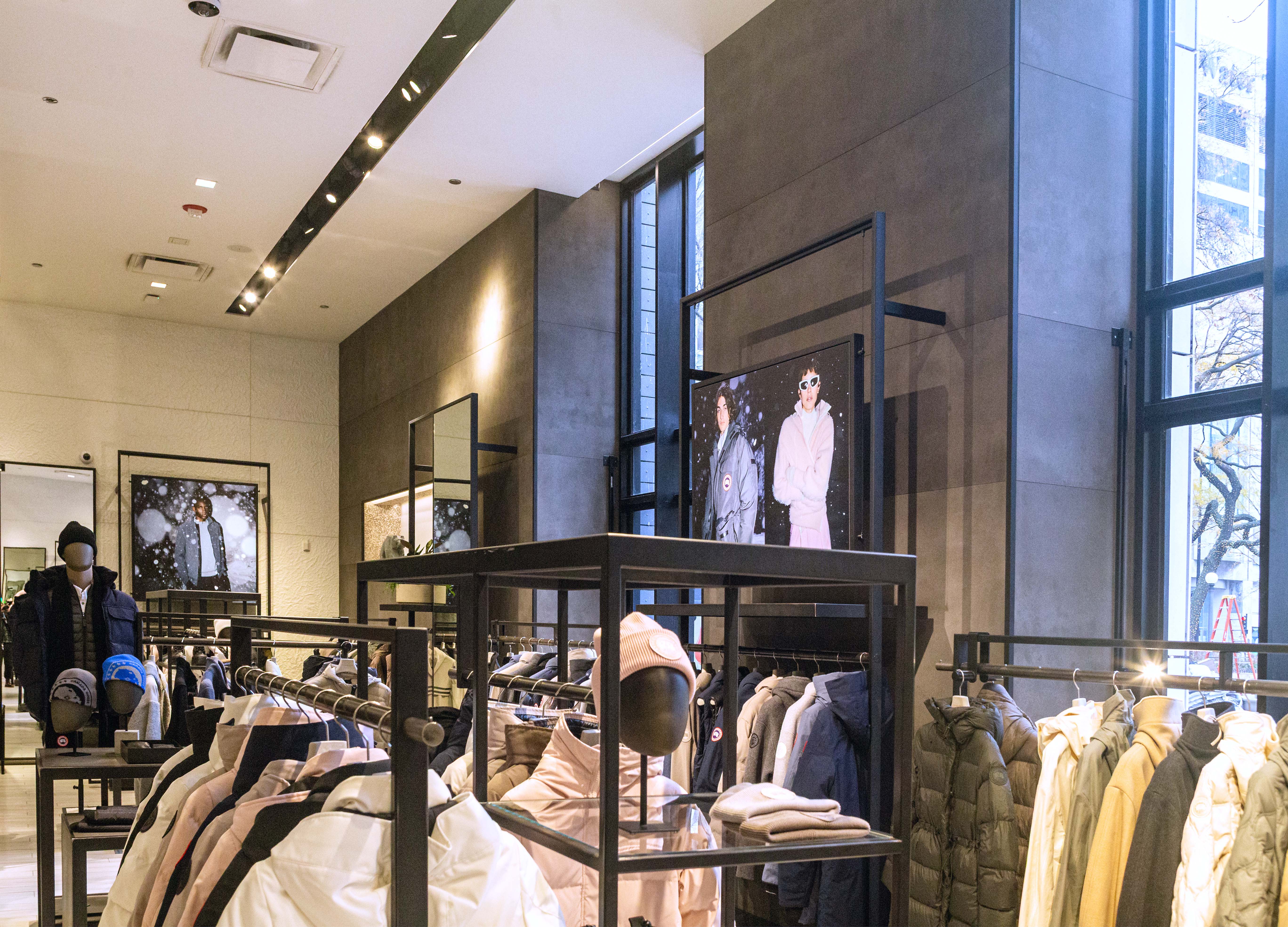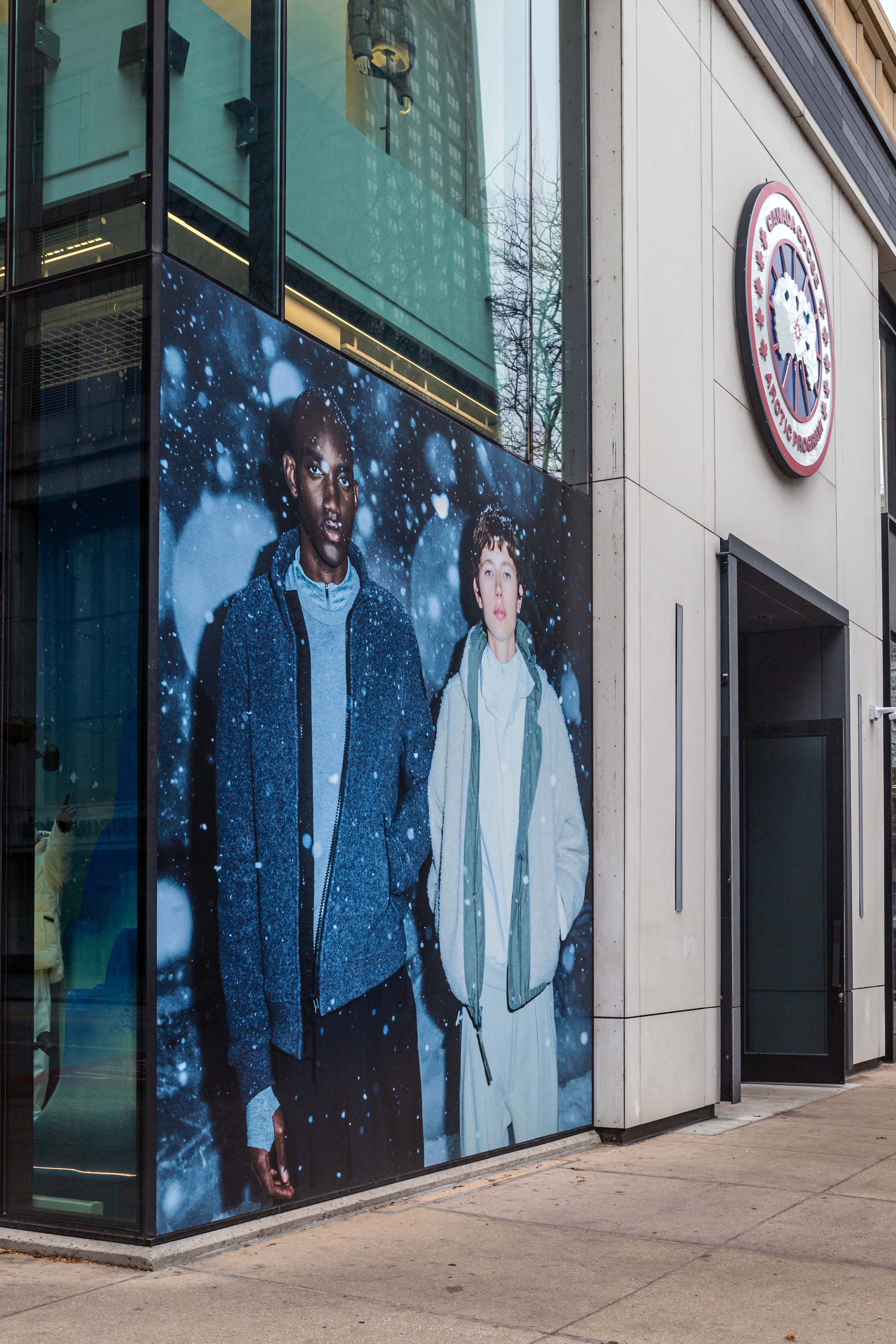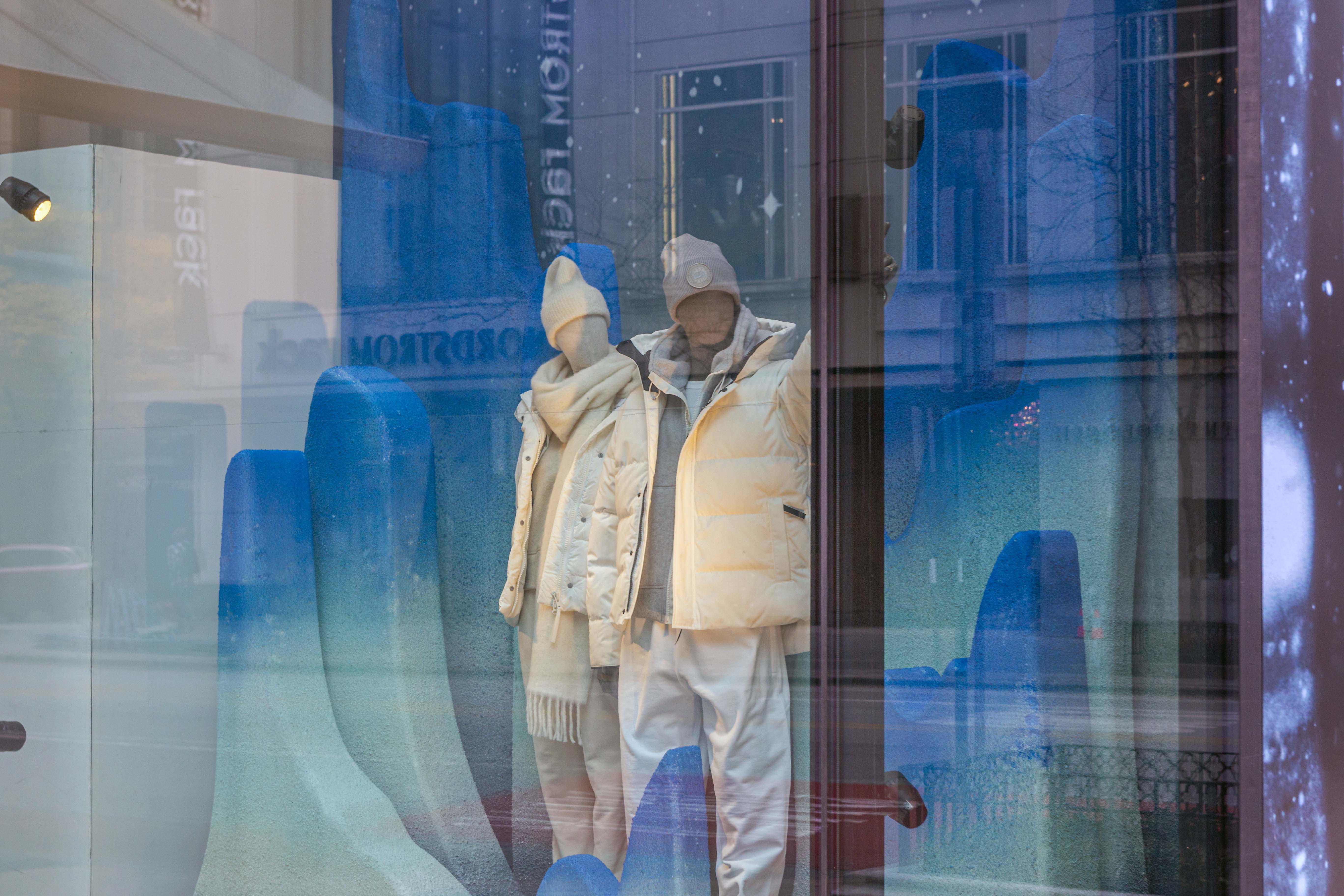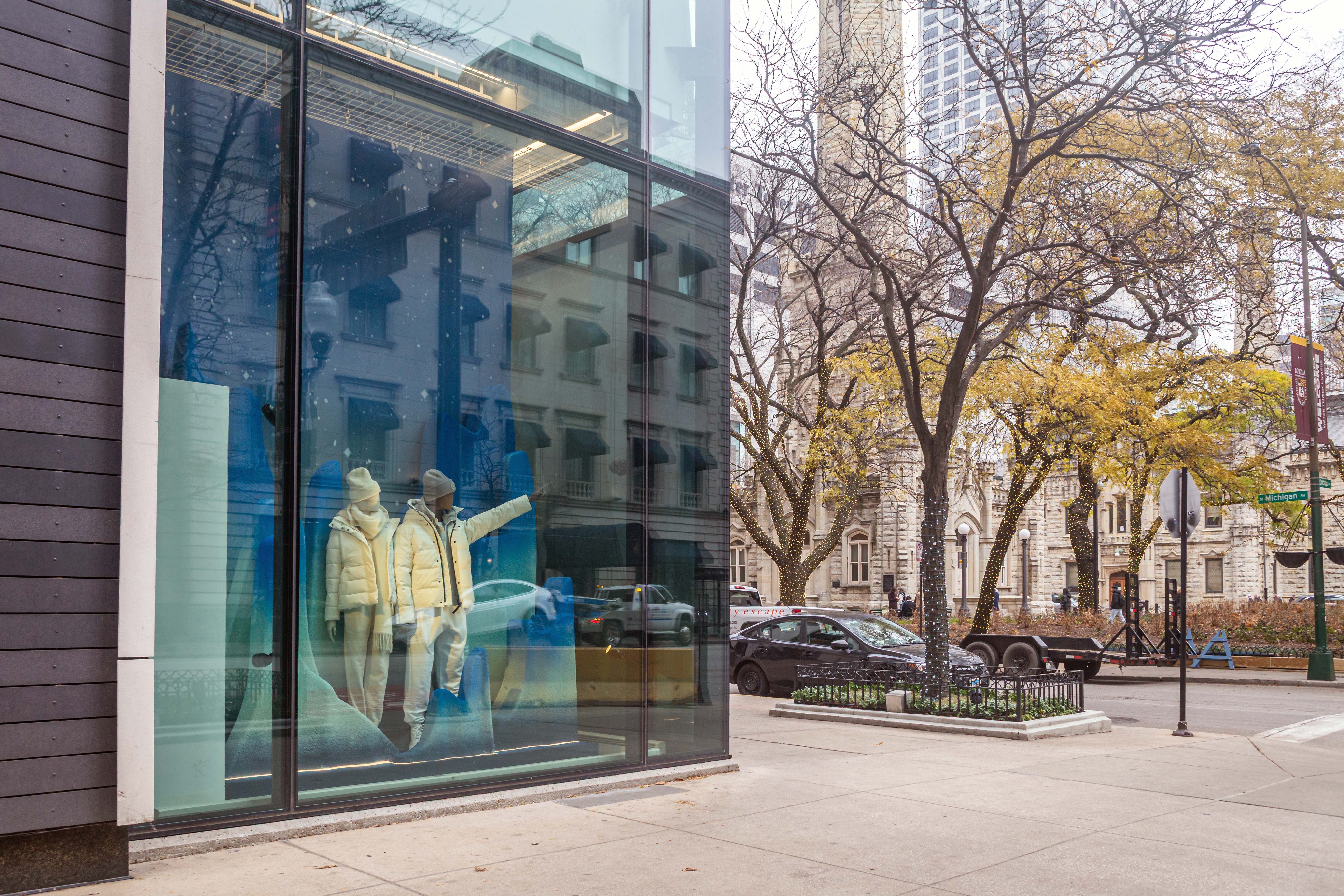 For the Chicago flagship, Duggal Visual Solutions brought Canada Goose’s winter story to life through a sculptural, full-scale window environment designed to feel immersive from the street and seamless inside the store. Beginning with prototyping, color testing, and design file preparation, our team translated the brand’s concept into a refined installation anchored by a series of dimensional glacier forms. Each glacier was fabricated with shifting tonal blues and organic contours that interact beautifully with the store’s lighting, creating soft gradients, shadows, and icy reflections that elevate the overall composition.