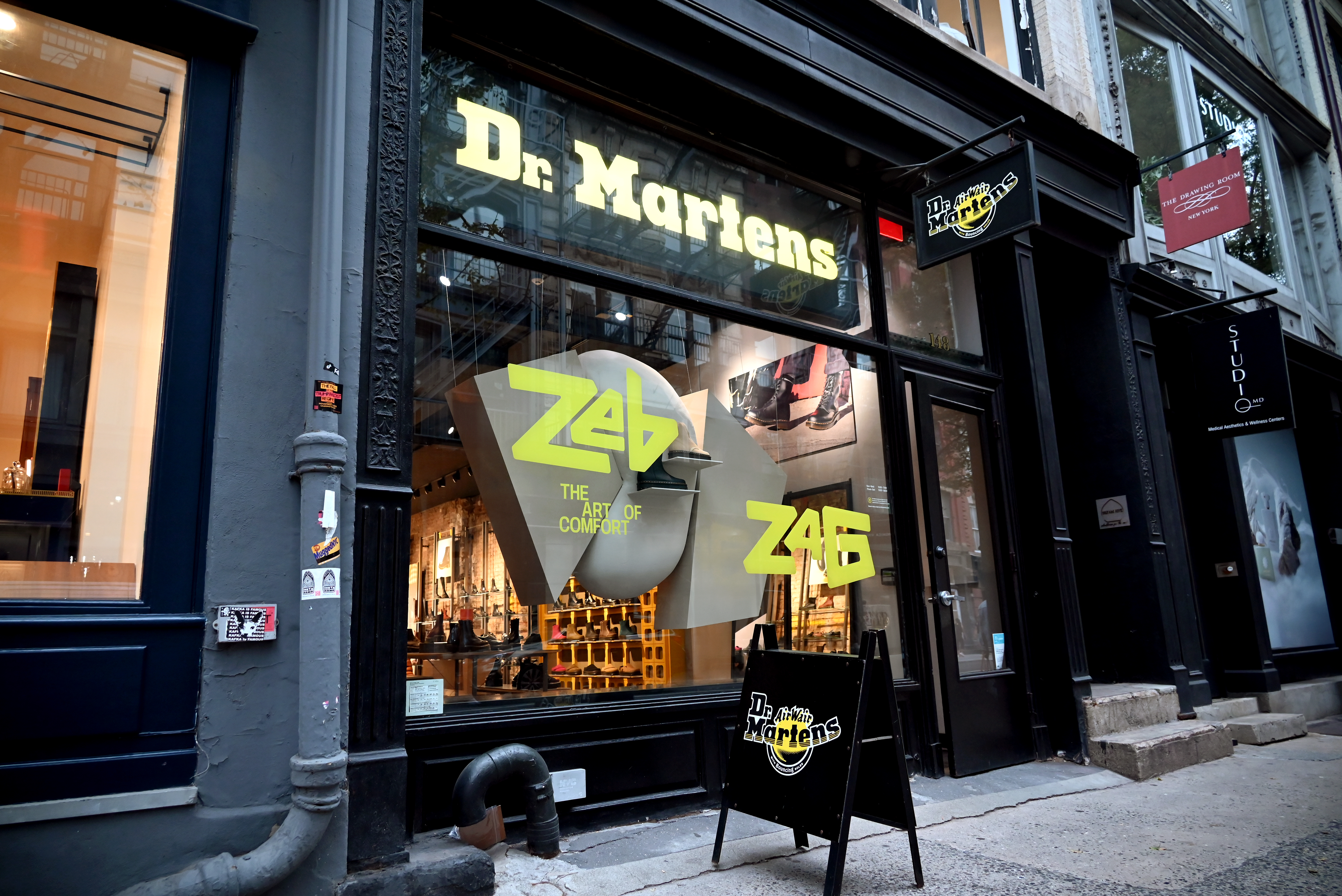 To launch the ZebZag campaign at their SoHo flagship, Dr. Martens collaborated with Duggal on a bold visual statement designed to echo the campaign’s theme: The Art of Comfort. The centerpiece of the window display featured a custom-fabricated sculptural form, combining sharp, angular panels with a central organic shape, visually representing the balance of structure and softness that defines the ZebZag line.