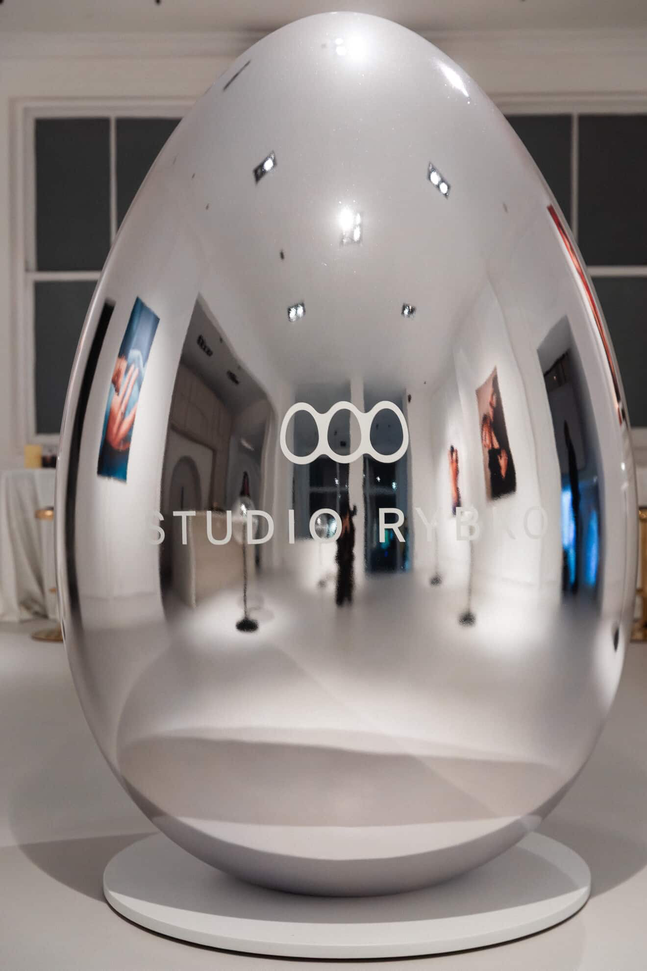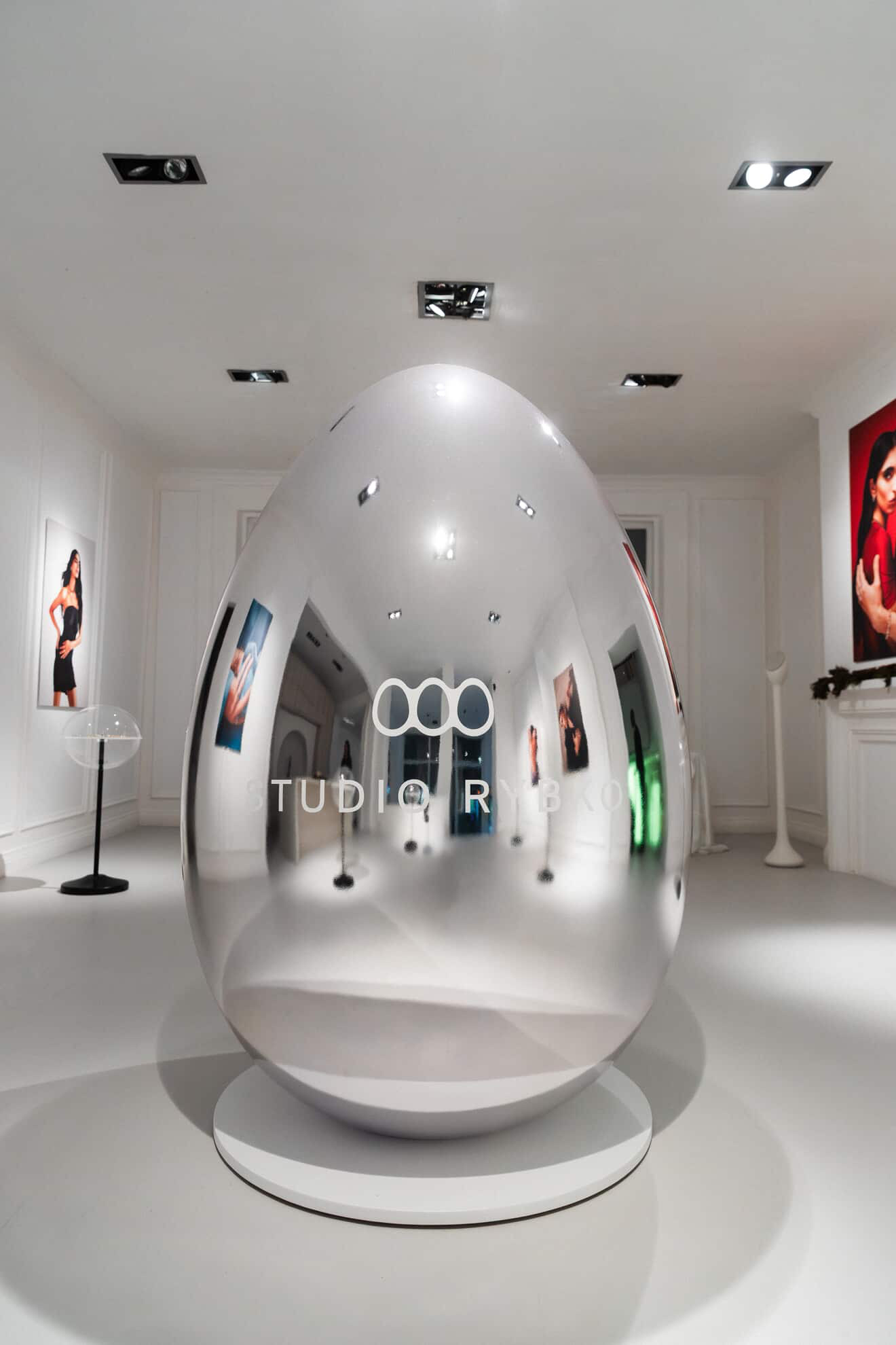 A 6- foot metallic chrome egg. not painted. Not Wrapped. Pure mirror chrome. For Studio Rybko, a jewelry brand with a bold artistic identity, we created.