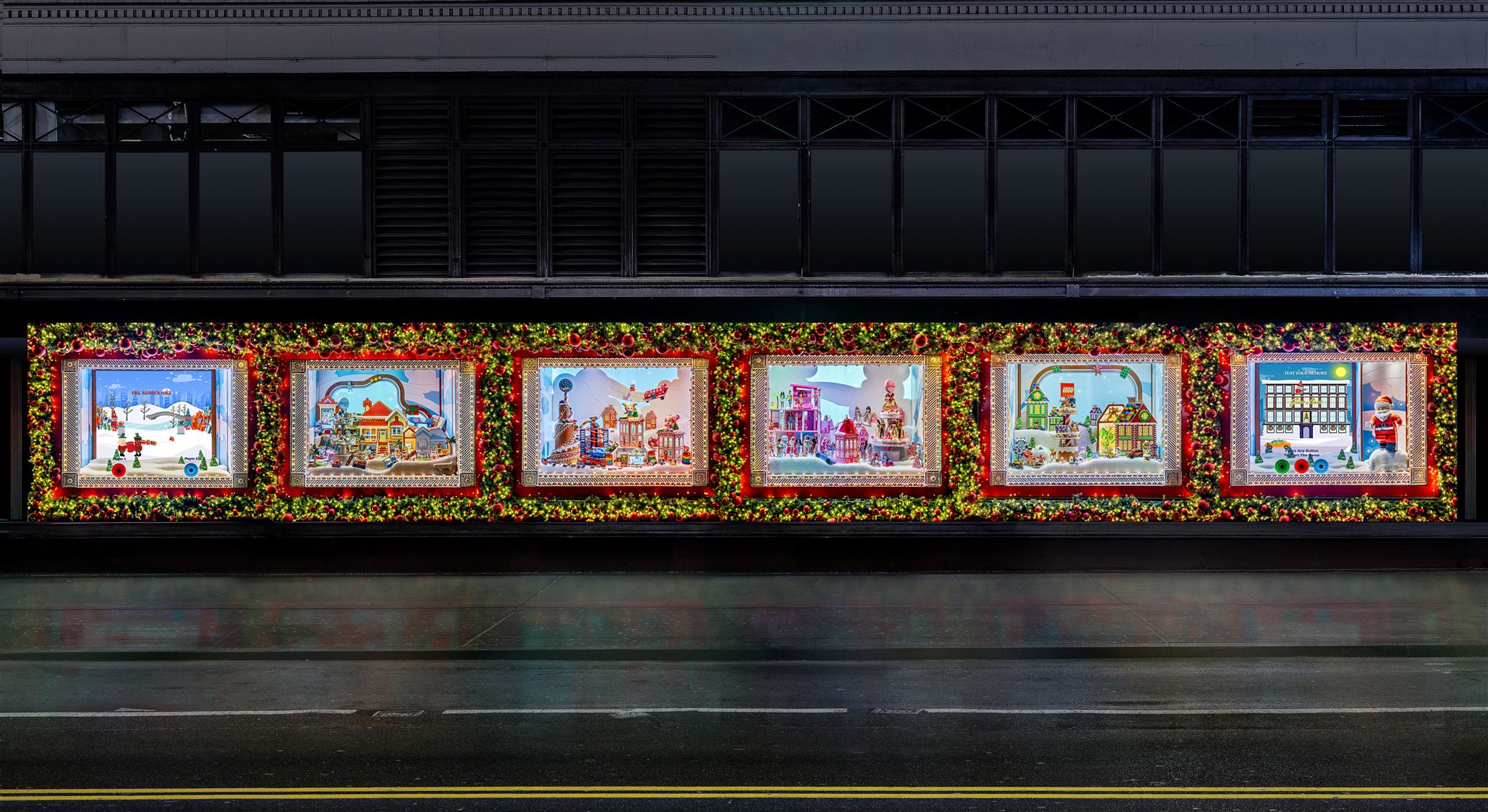 34th Street Toy windows featuring toy brands Bluey, Mattel (Barbie/ Hot Wheels/ Fisher Price), and Lego in a gingerbread wonderland theme. Each window has concepts of the brand but carrying a cohesive gingerbread style theme through out the windows. Each window has animated Gingerbread houses that turn or open to reveal a toy, a conveyer belt of toys hidden in the sky backdrop, with two flanking interactive game windows with classic Macy's characters.