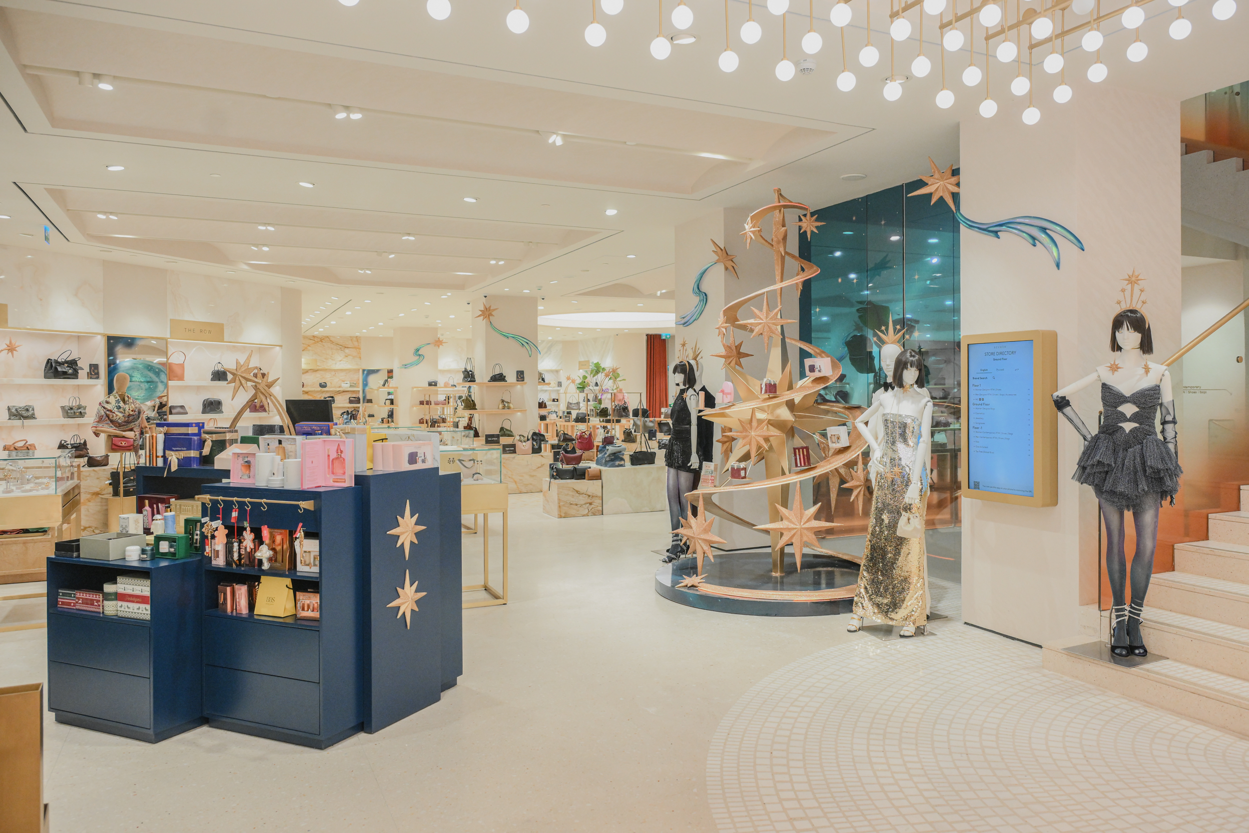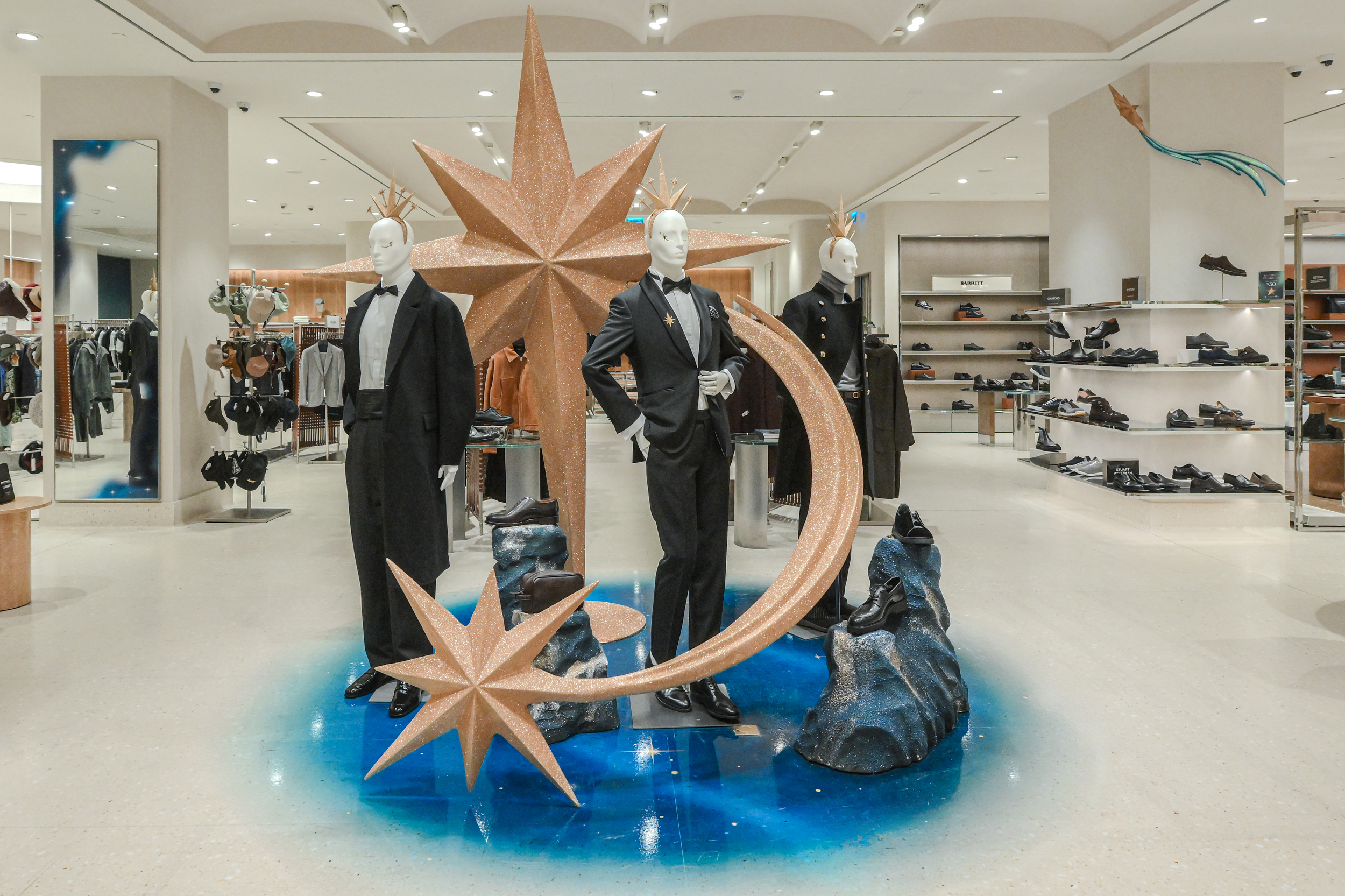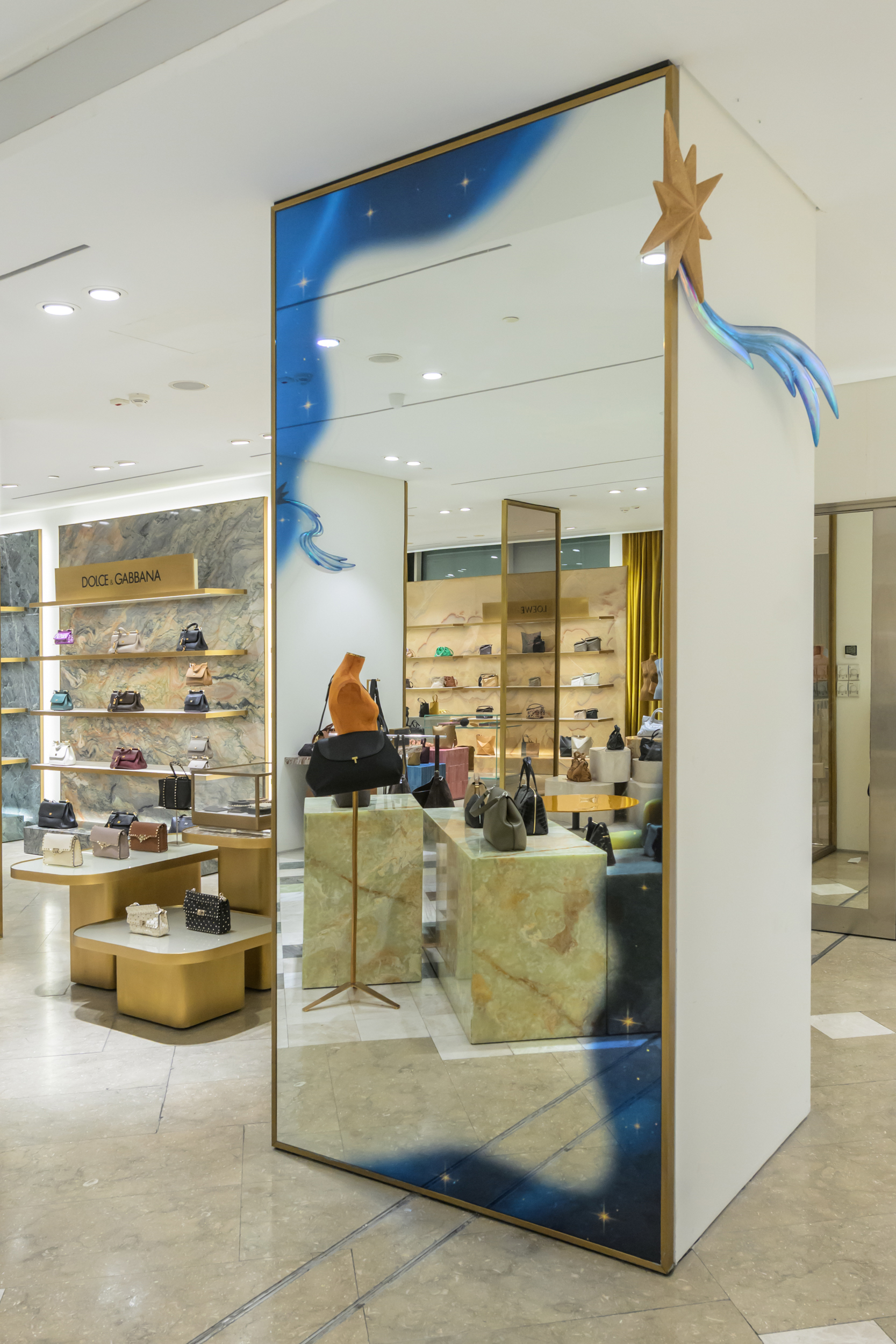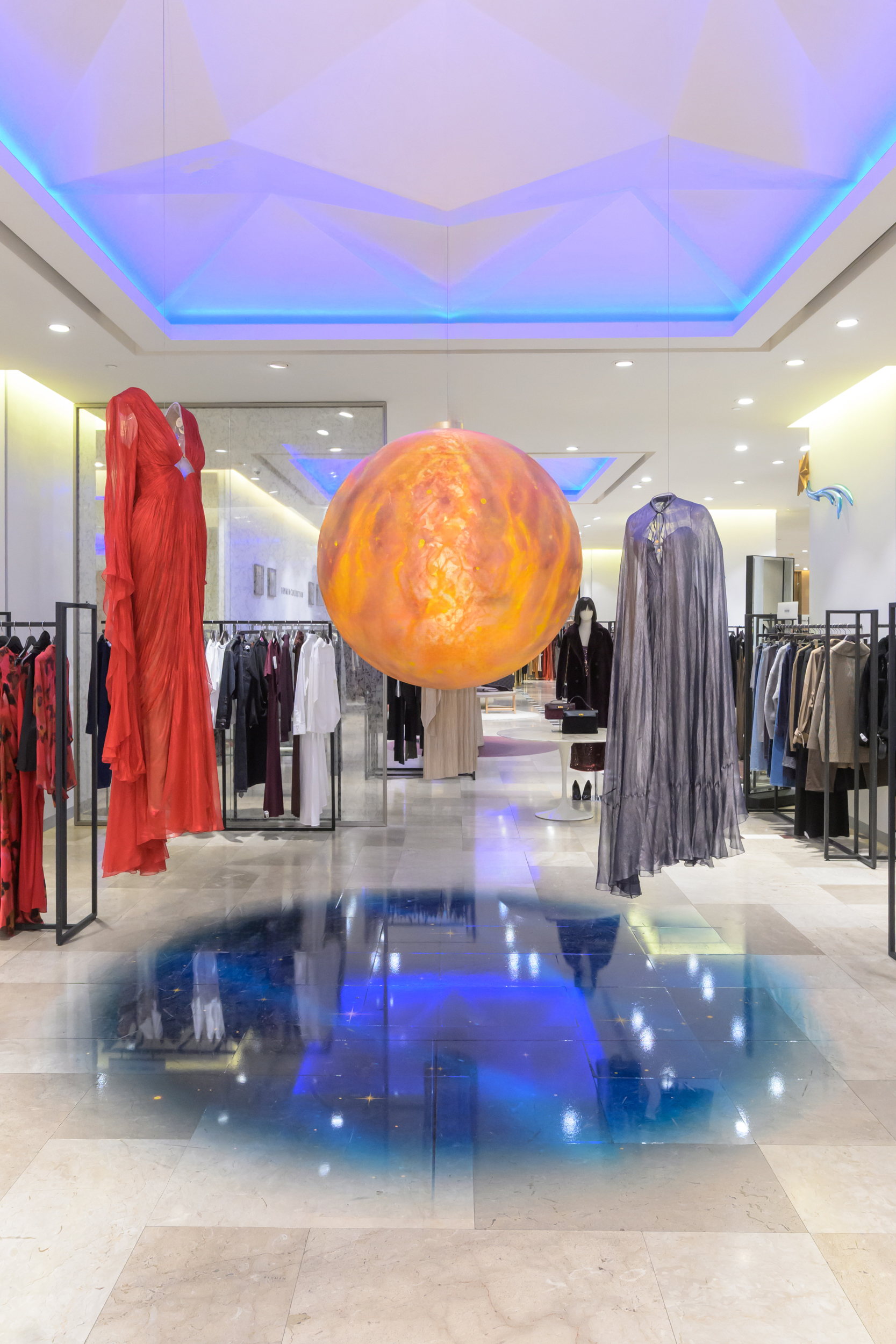 Inside, the narrative continues with refined layouts where deep blues, shimmering finishes, and handcrafted details blend to form an atmosphere that feels both futuristic and warm. Every mannequin takes its place as part of this universe, contributing to a seamless, glowing story.
