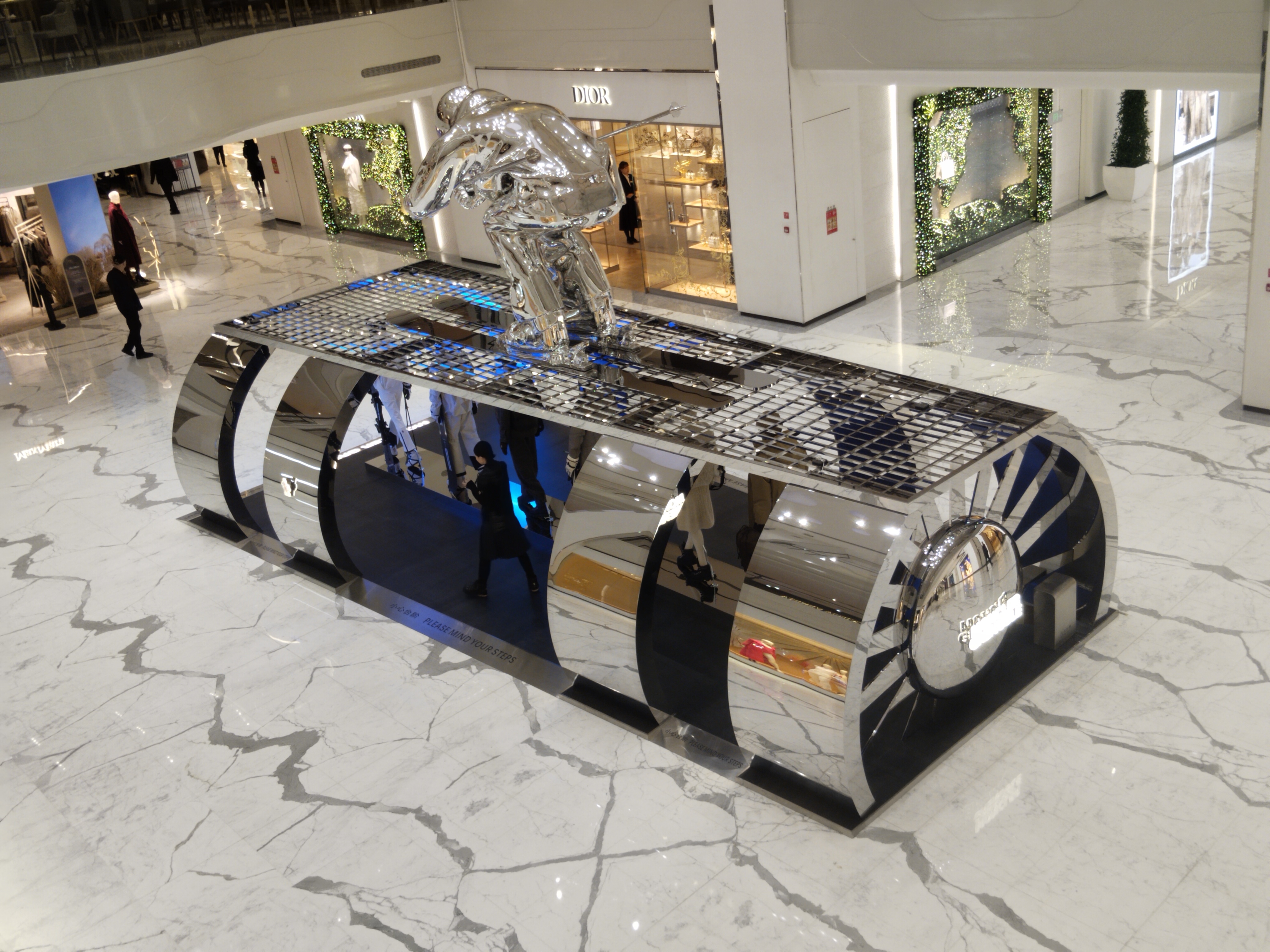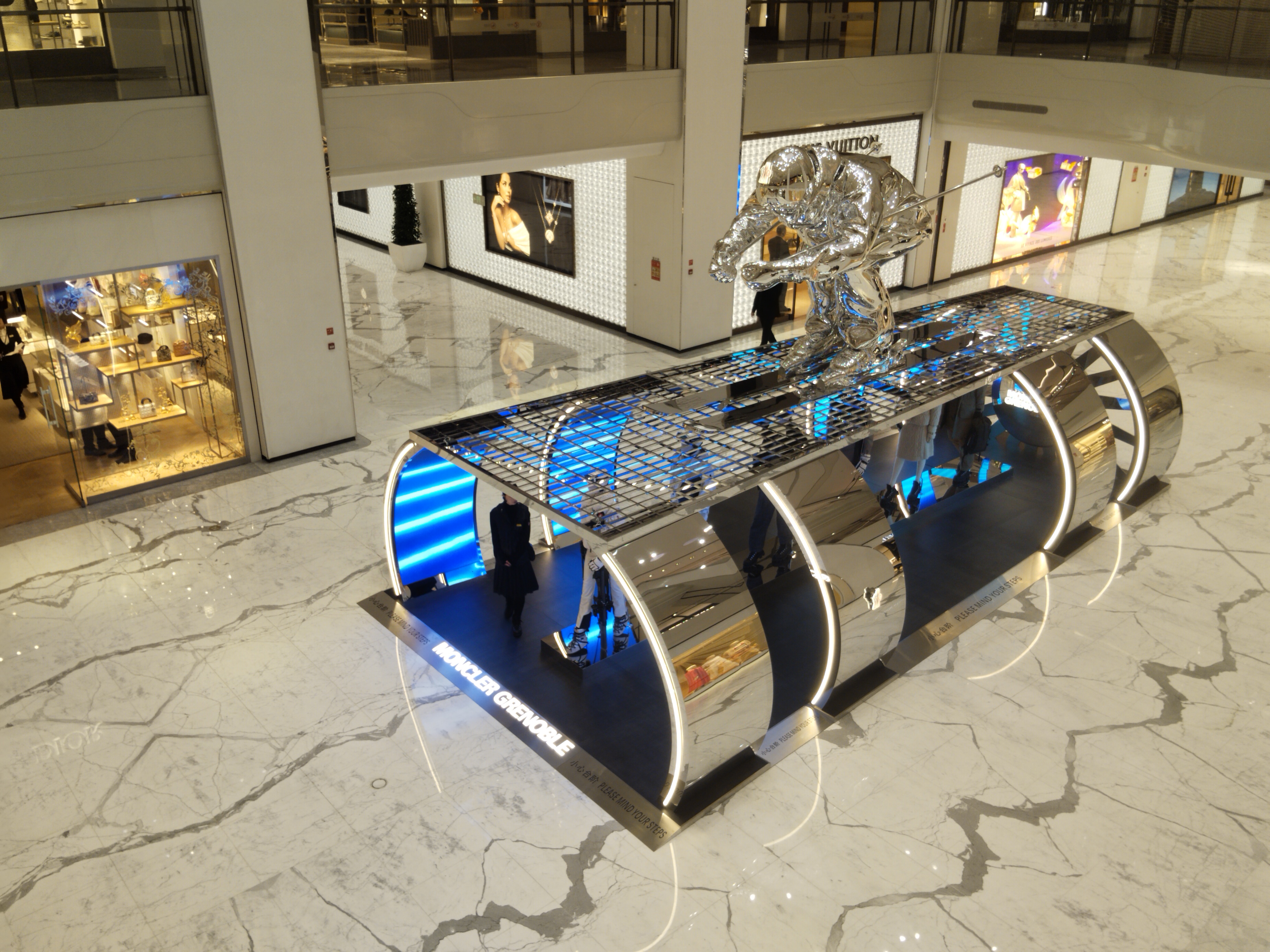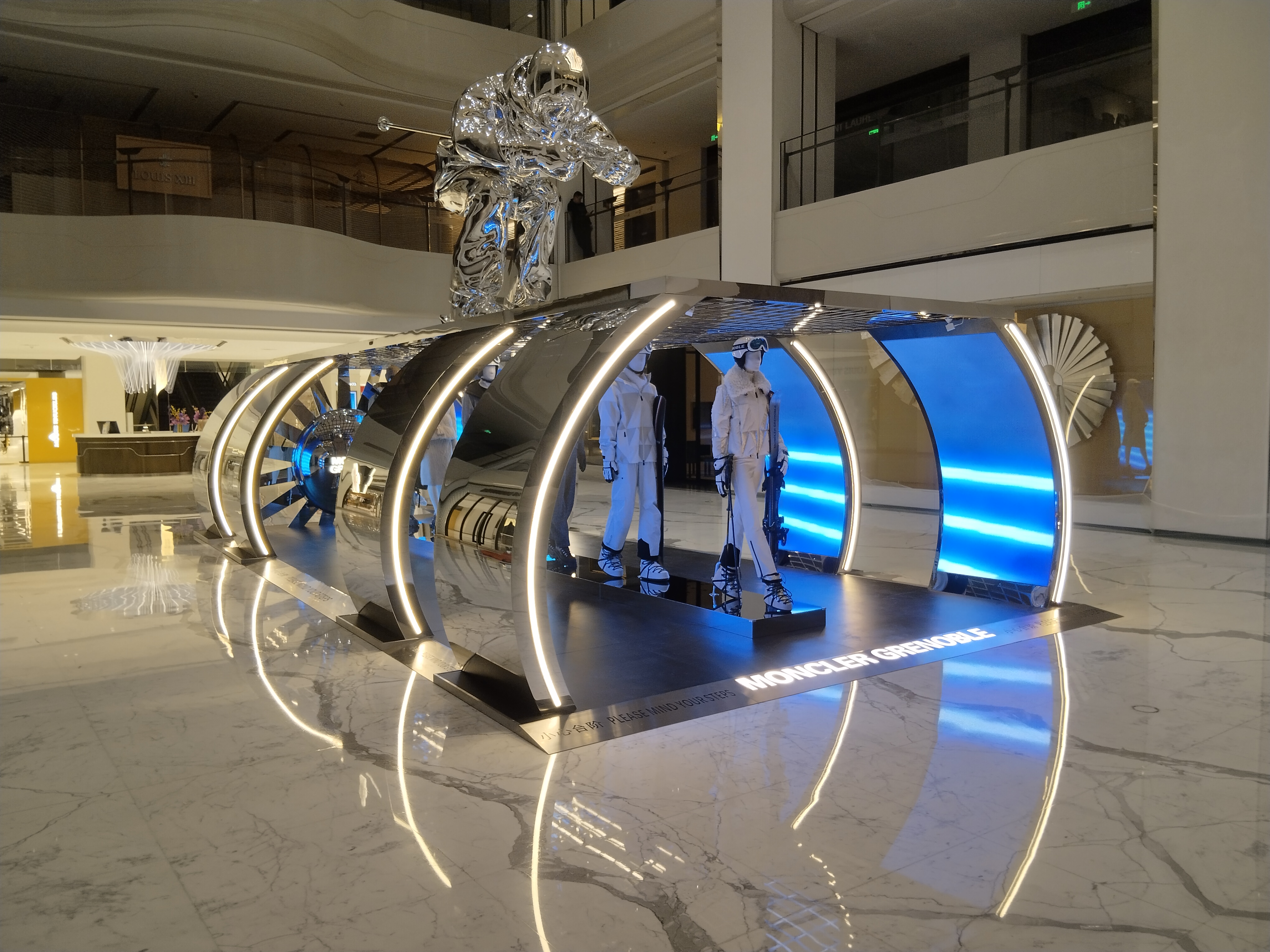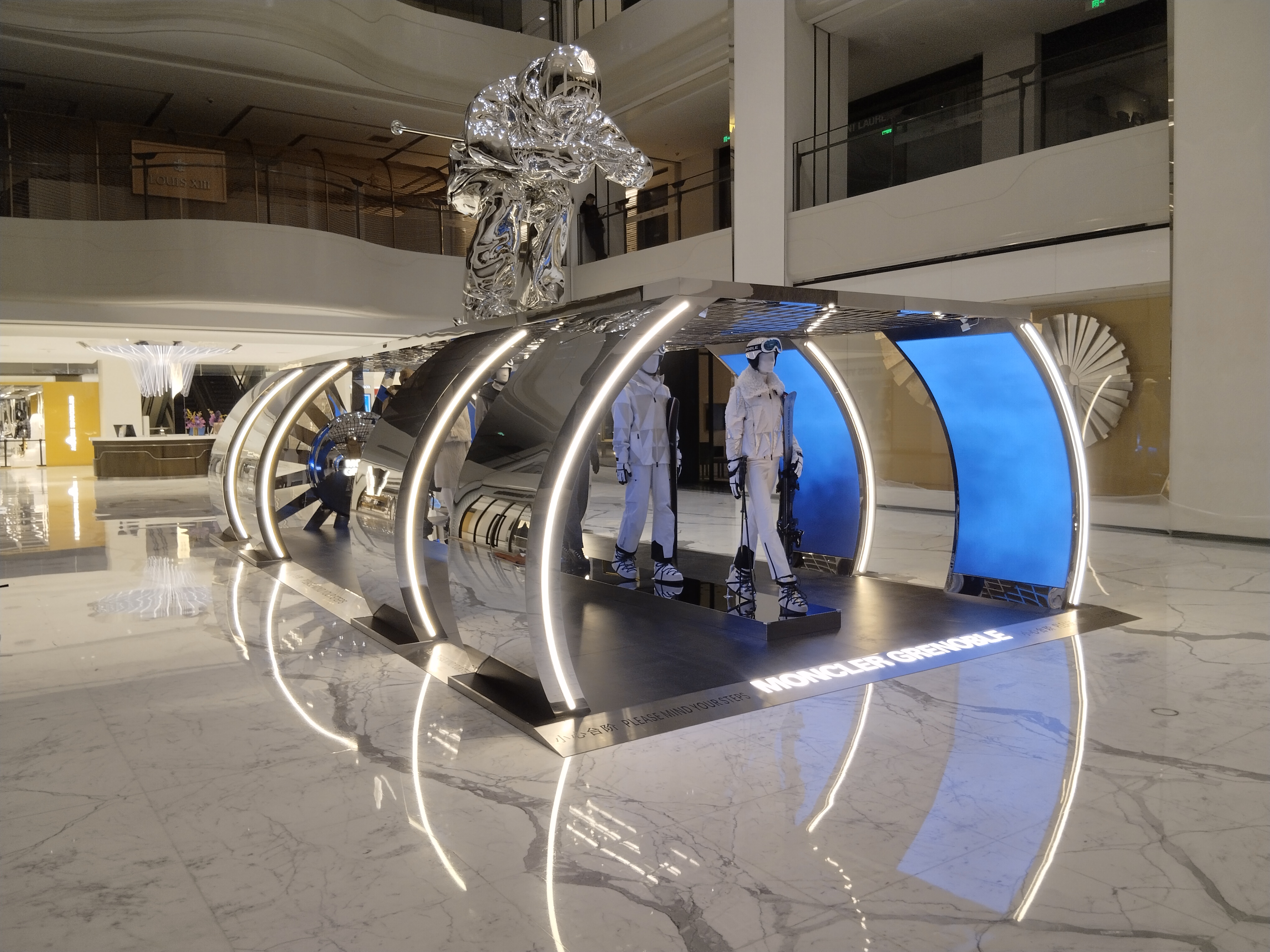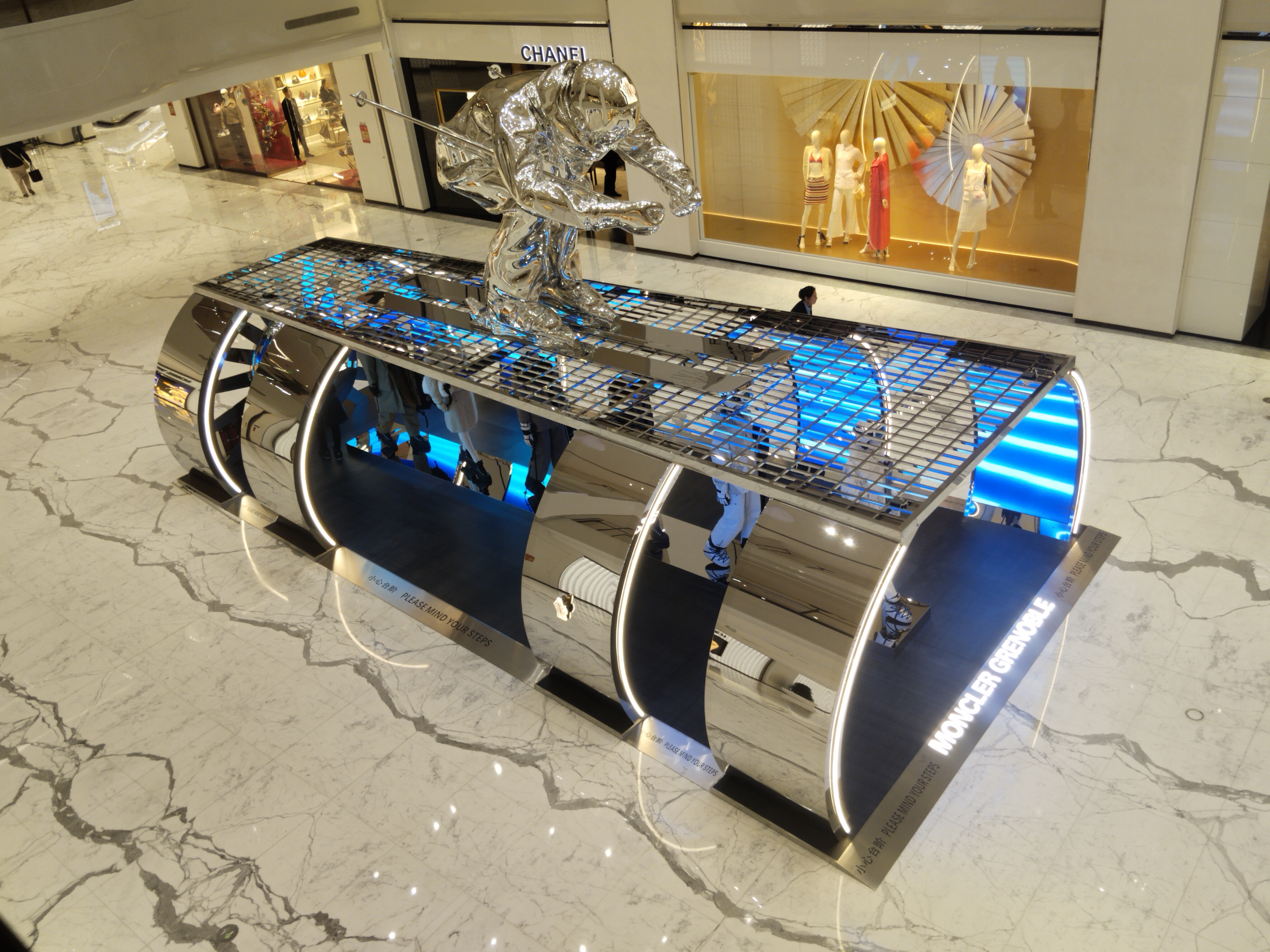 The Moncler Grenoble pop-up transforms the space into a winter wonderland, reflecting the brand's alpine heritage while embracing the vibrant, cosmopolitan energy of Beijing SKP. The design features sleek, minimalist aesthetics, creating a seamless fusion of high-tech performance and sophisticated fashion. The space is a reflection of the outdoor ski experience while offering an immersive experience into Moncler's world of luxury sportswear.