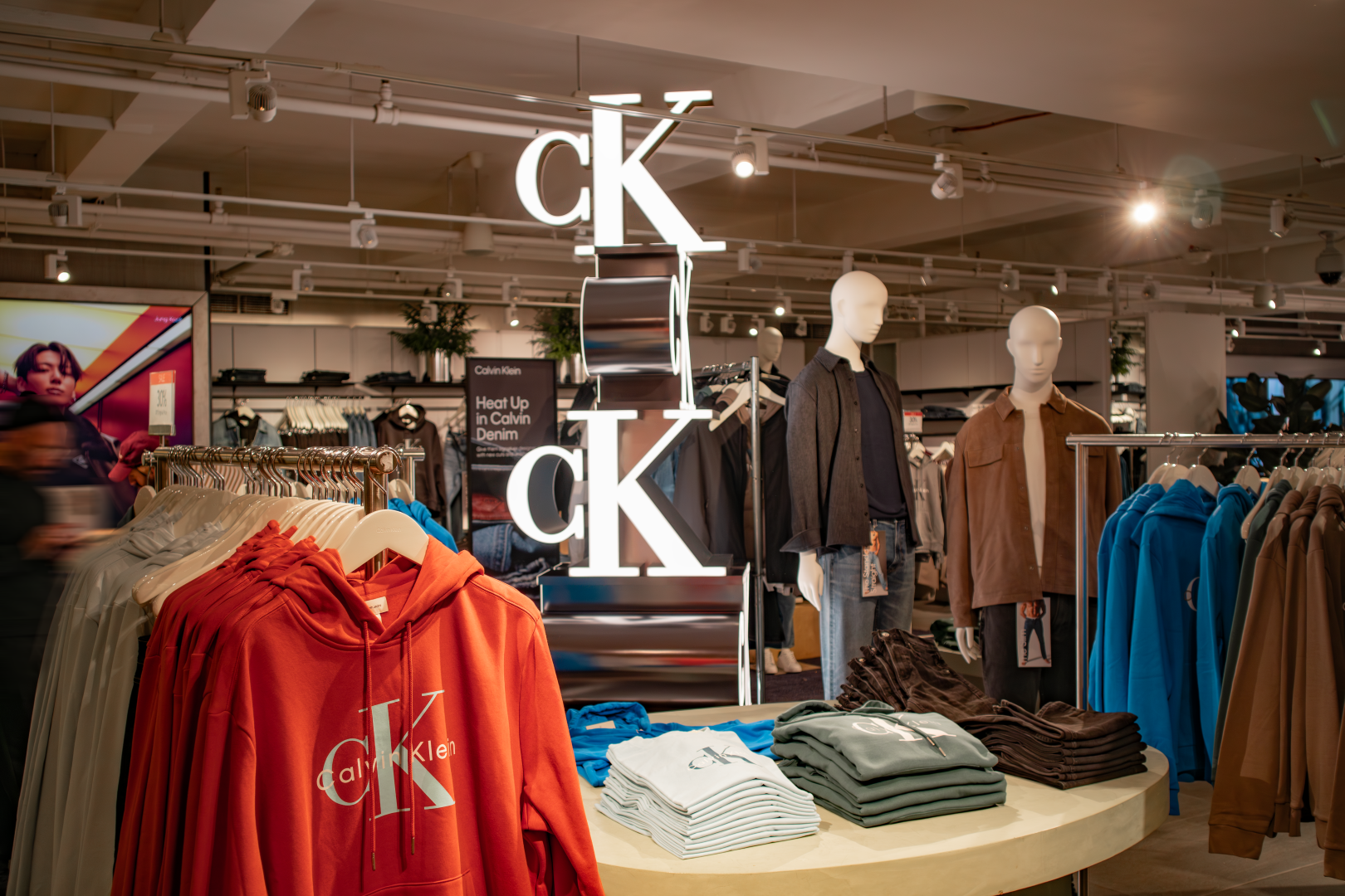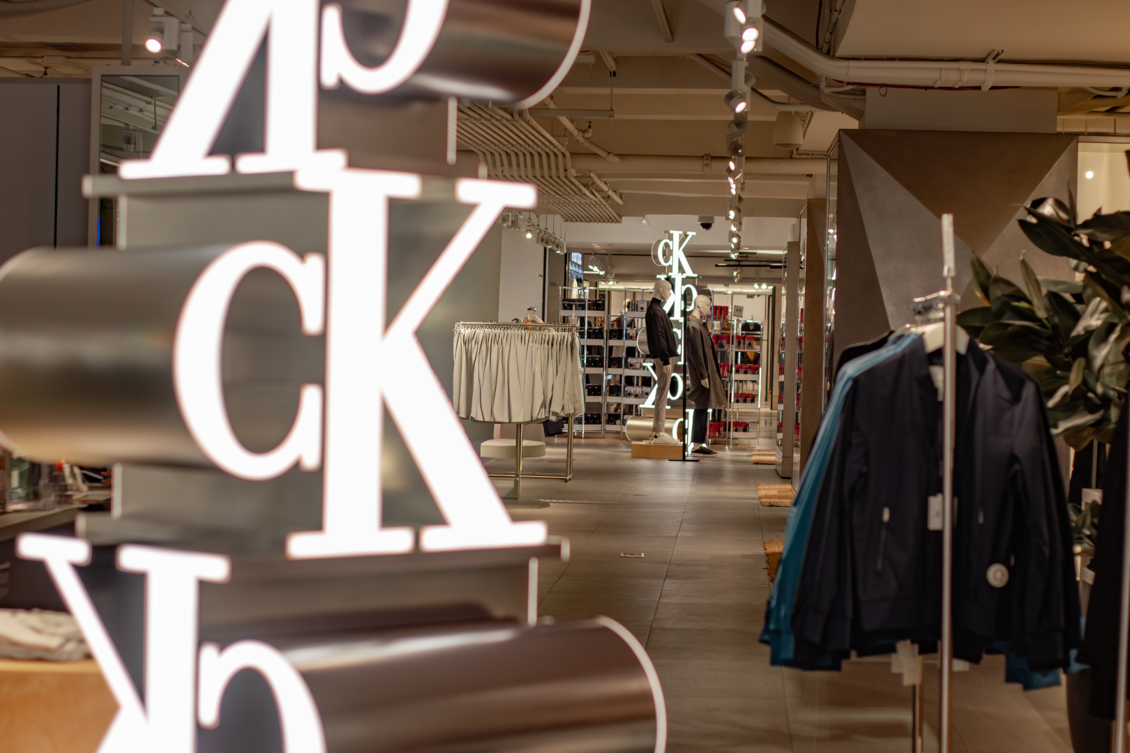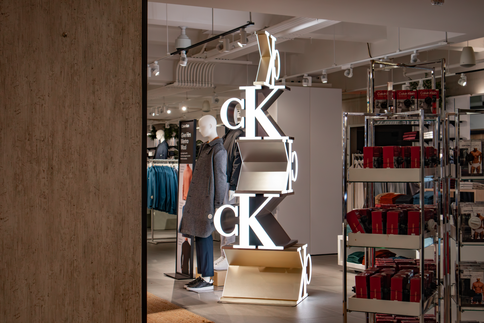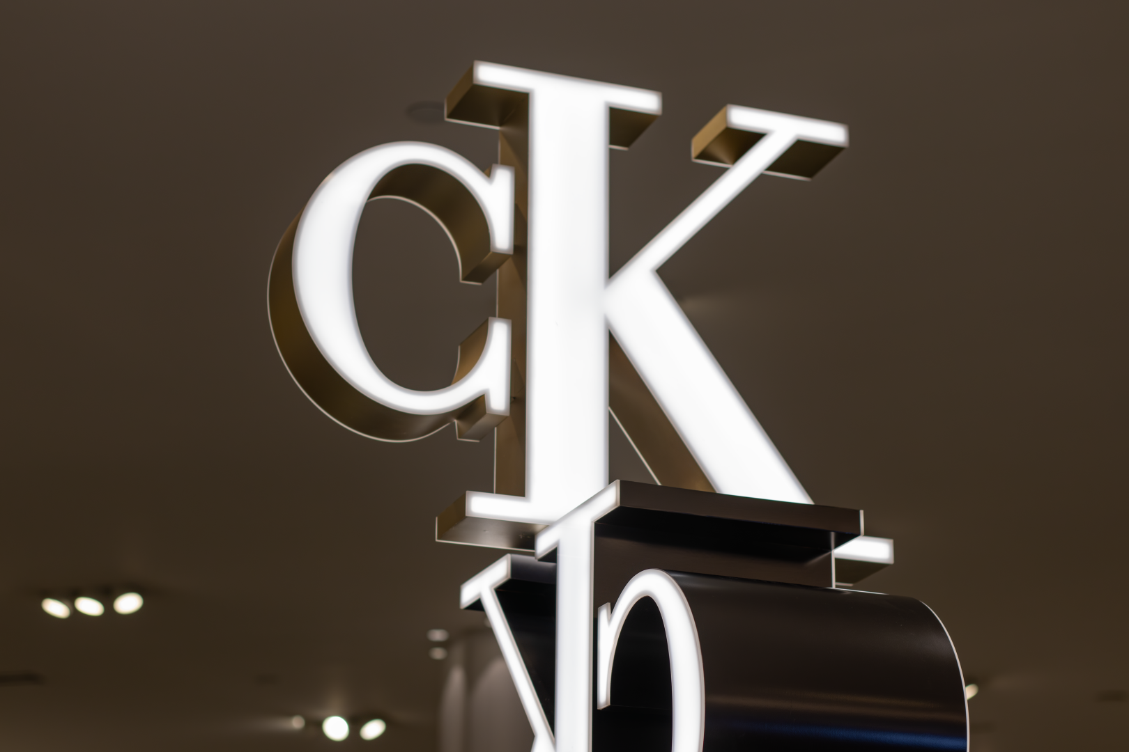 This in-store installation was designed and fabricated as a vertical brand anchor, combining dimensional CK monograms with precision fabrication and integrated lighting to command attention from every angle.