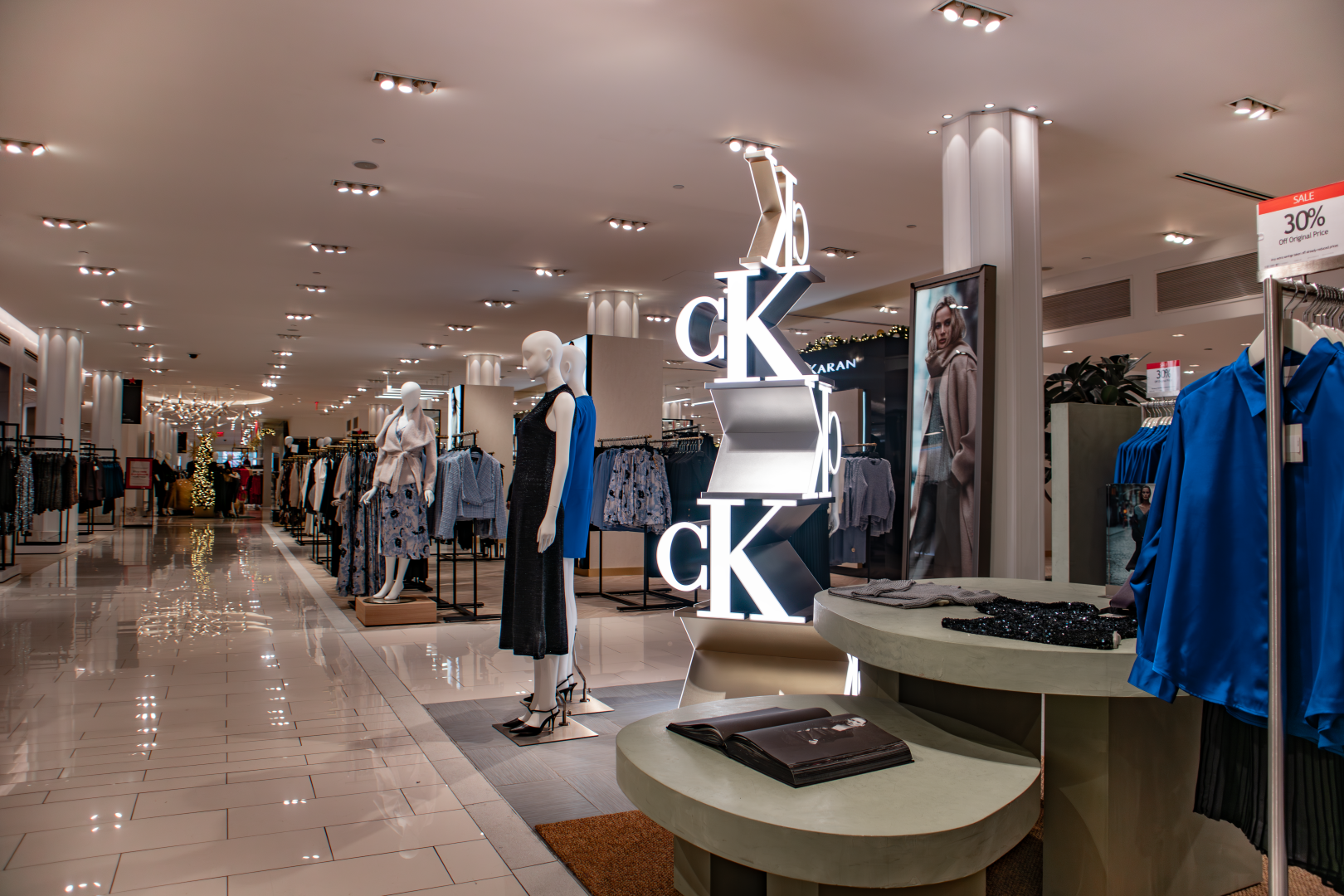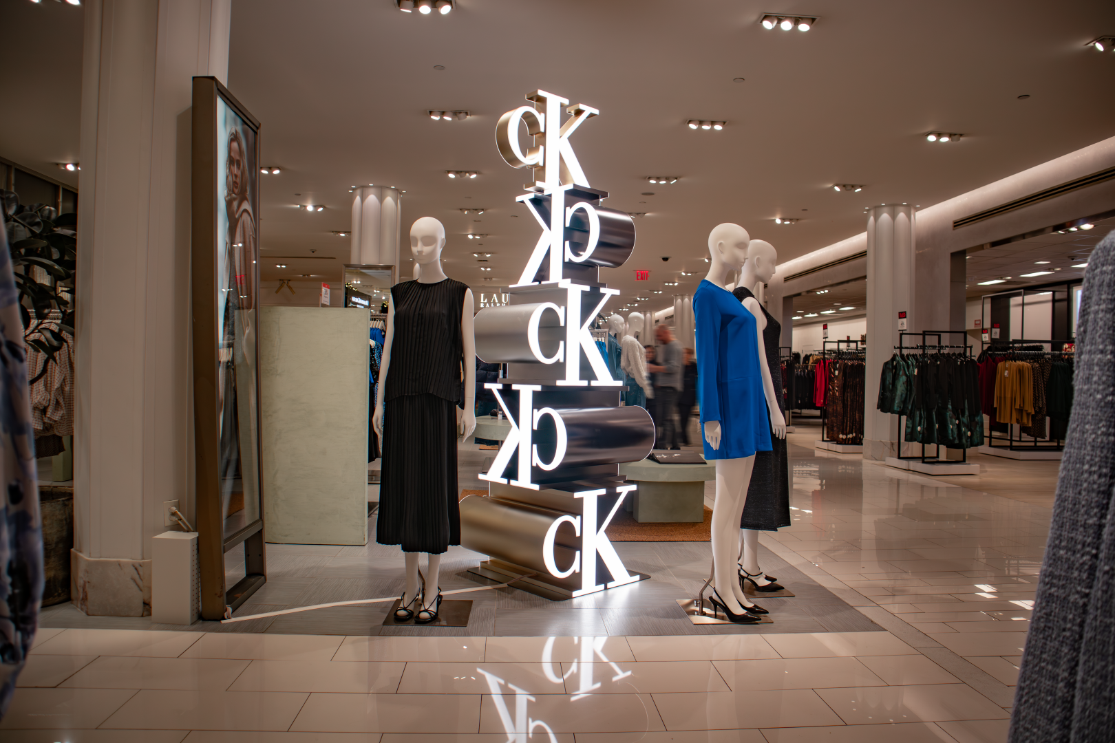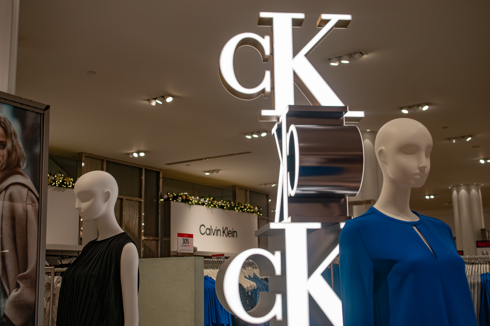 This in-store installation was designed and fabricated as a vertical brand anchor, combining dimensional CK monograms with precision fabrication and integrated lighting to command attention from every angle.