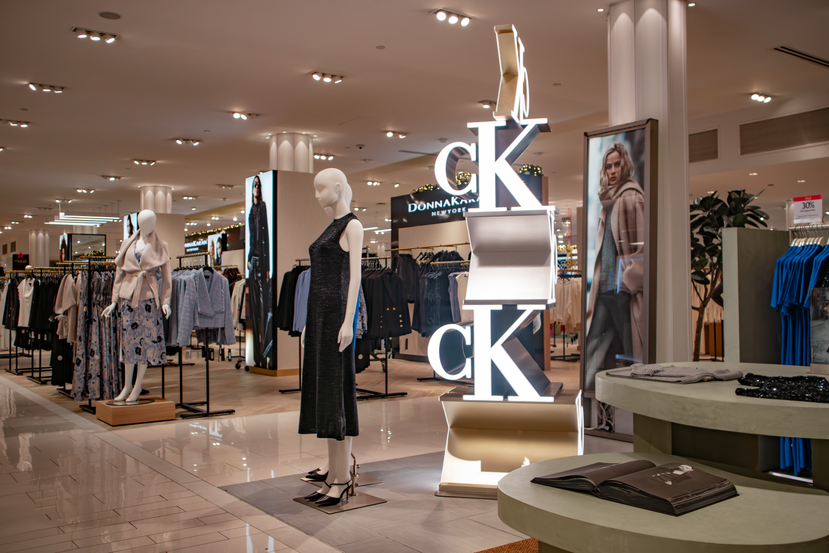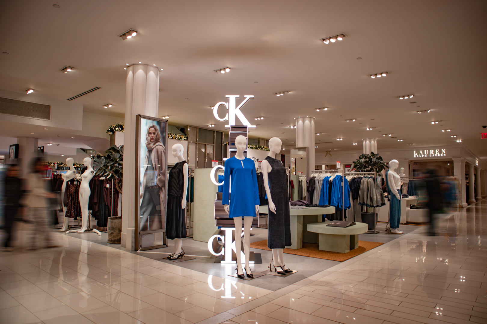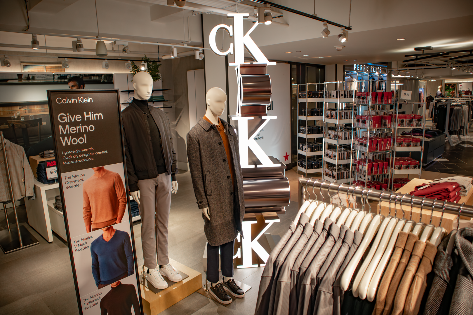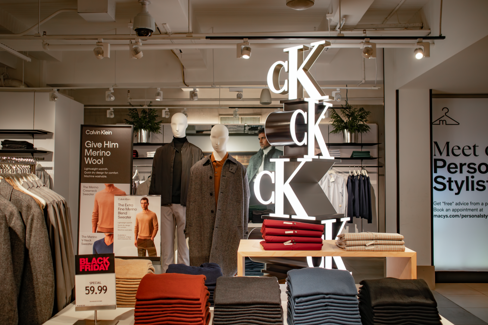 This in-store installation was designed and fabricated as a vertical brand anchor, combining dimensional CK monograms with precision fabrication and integrated lighting to command attention from every angle.