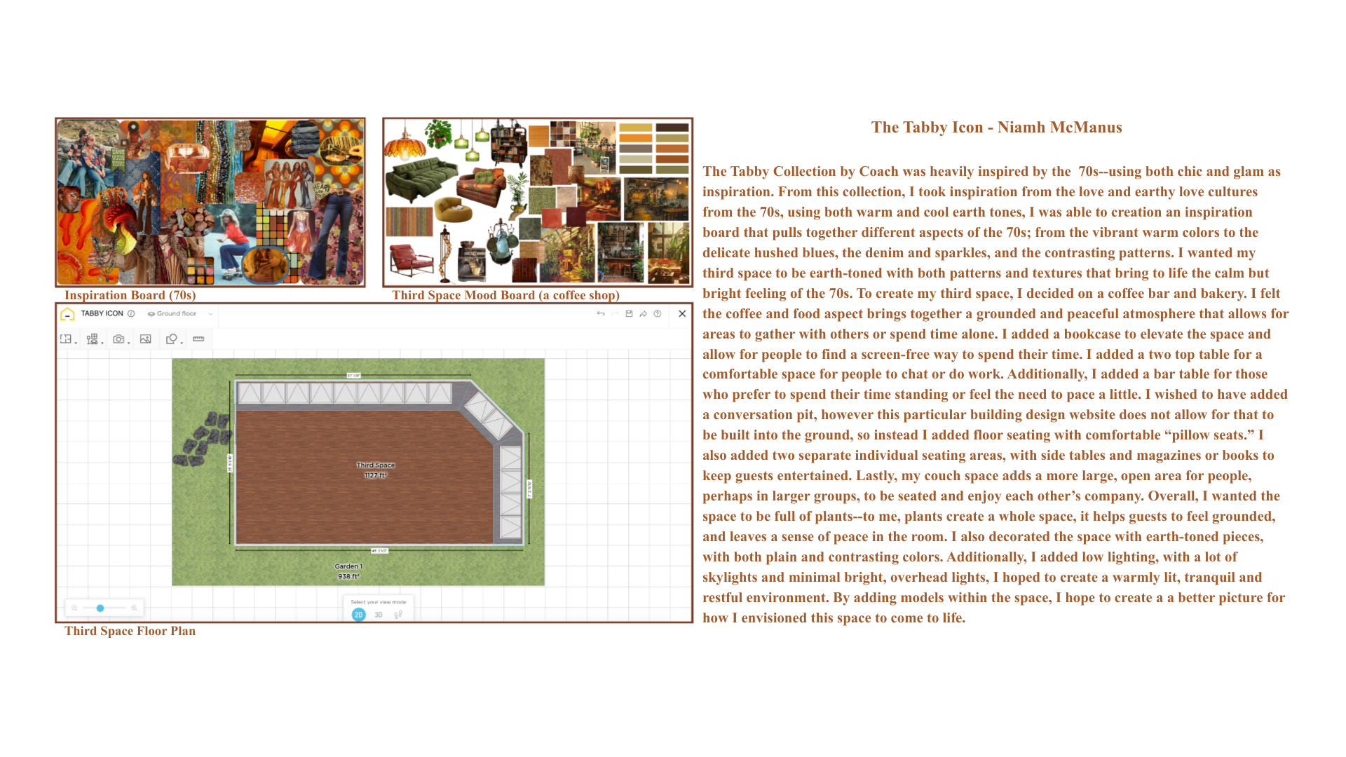 I am creating a third-space by taking inspiration from the Tabby Coach Collection. Based on and inspired by the 70s, the Tabby Collection has inspired me to take the love and earth culture and fashion from the 70s and transform it into a 3D space