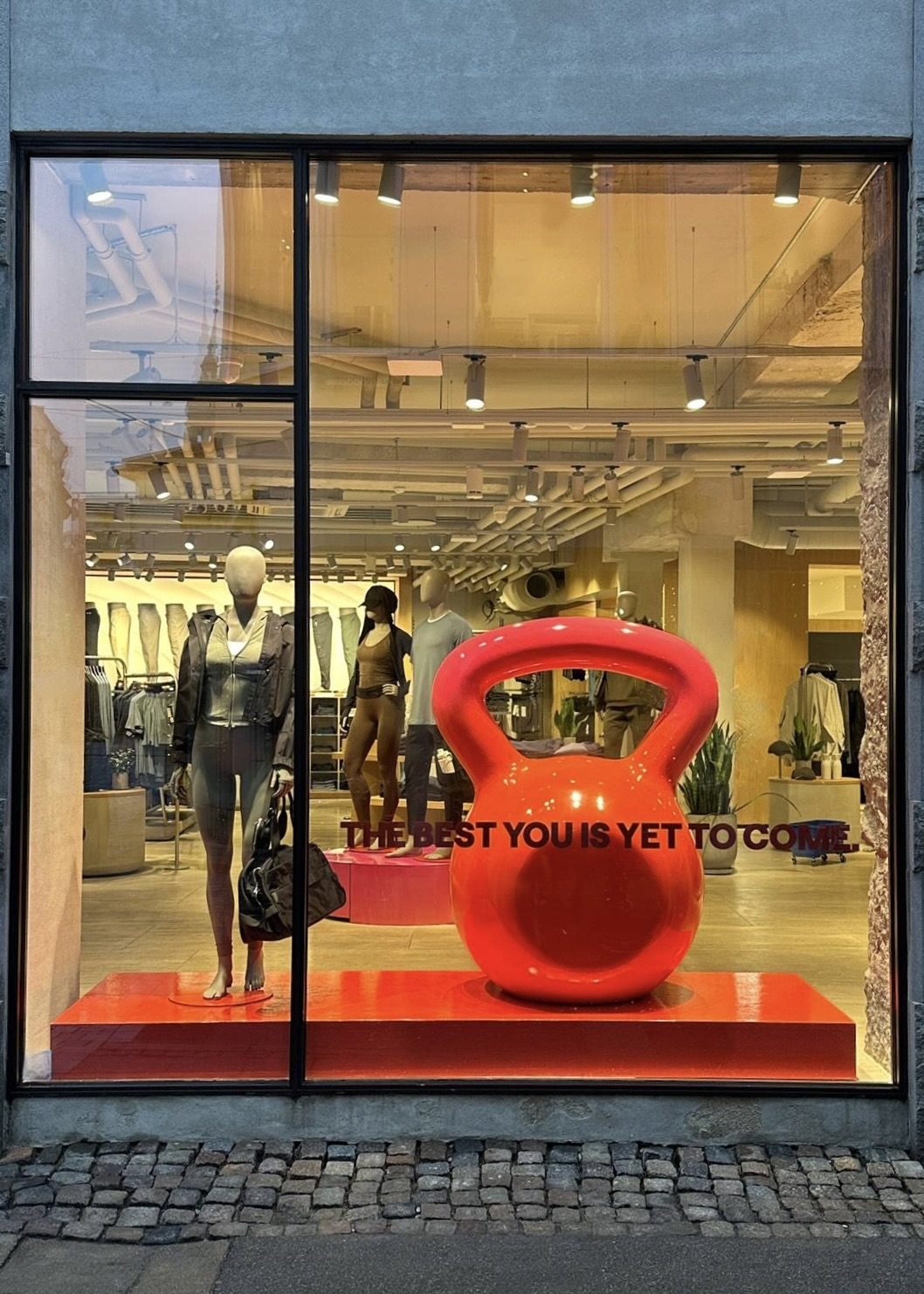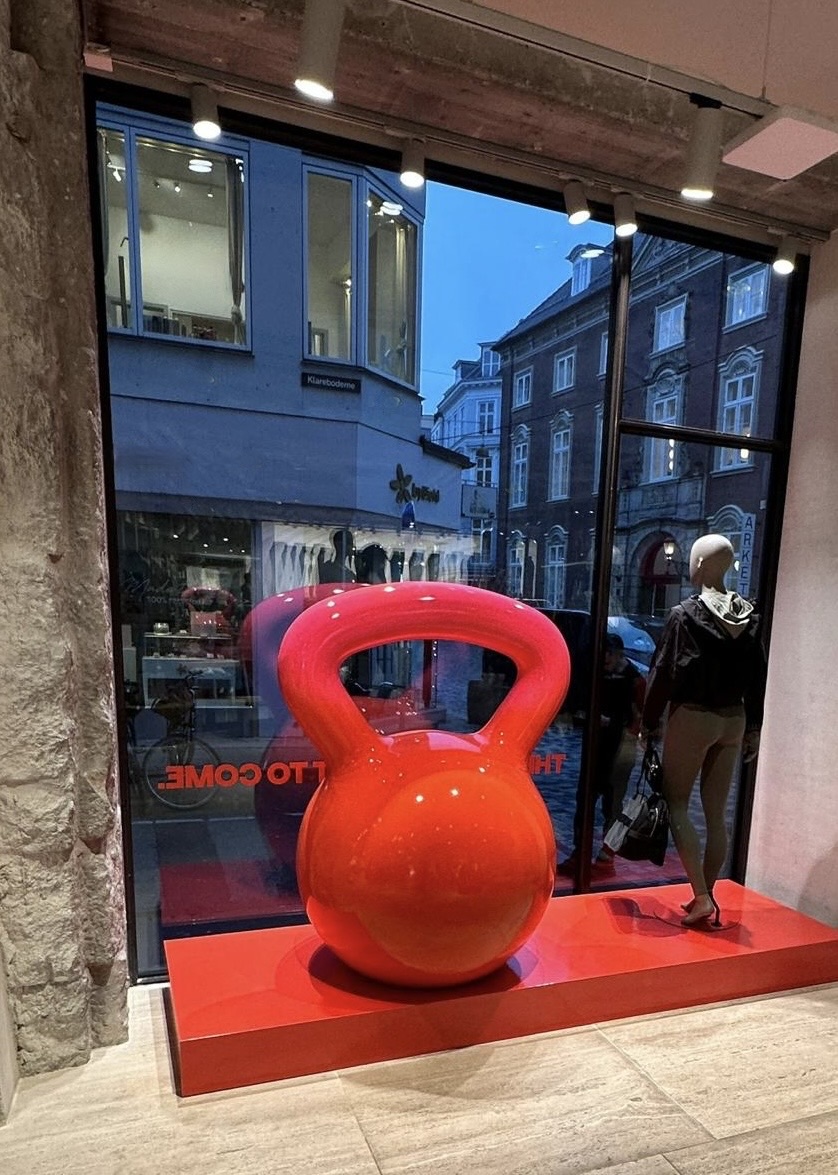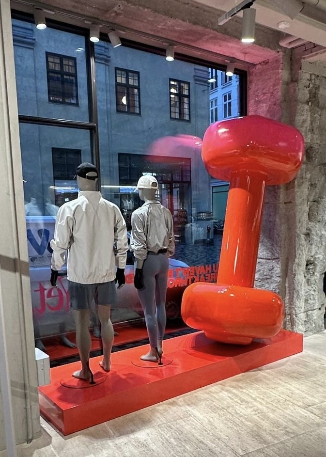 of red and pink is a dialogue between strength and softness. Oversized fitness elements—like dumbbells and Kettlebells—are supersized within the windows.
