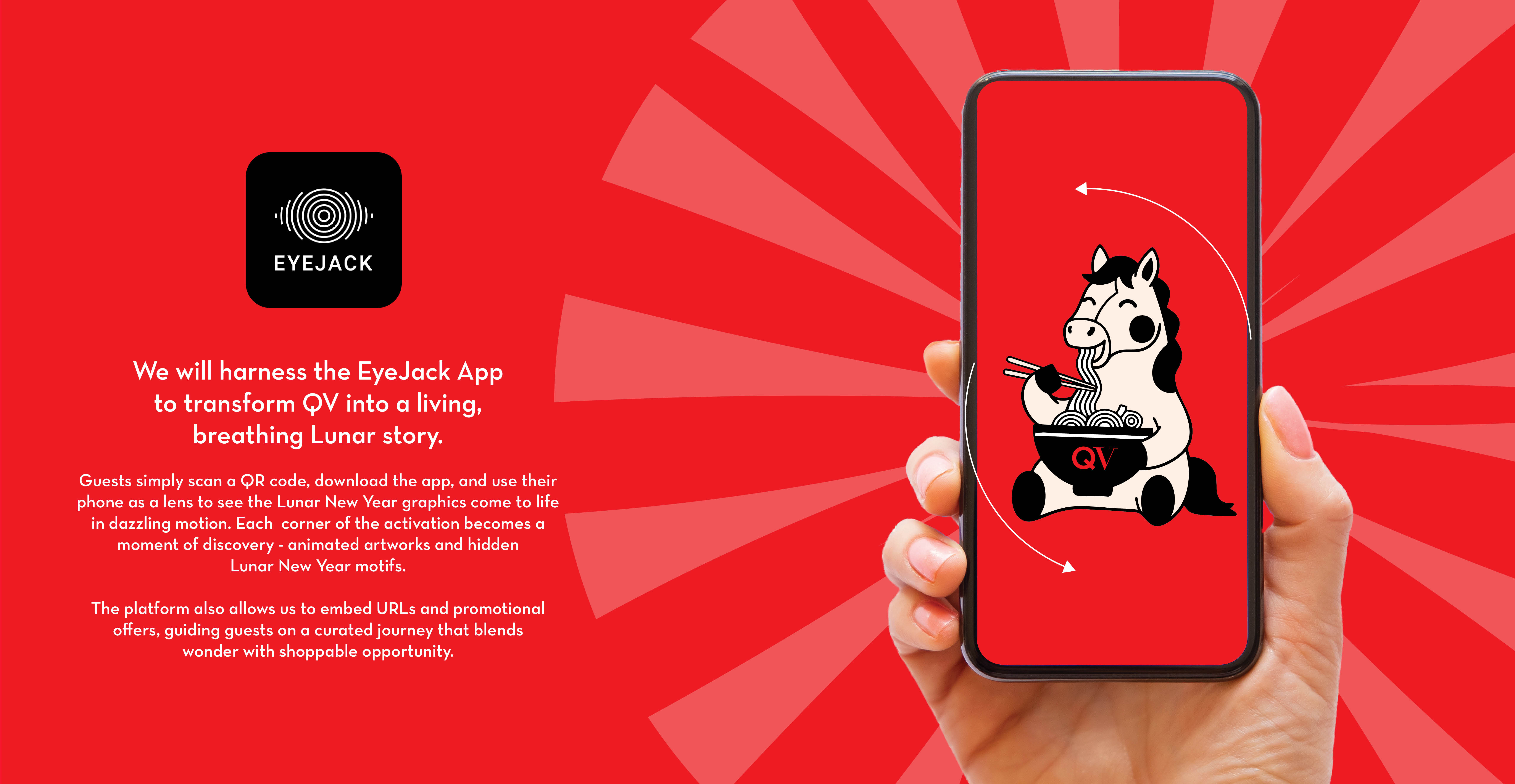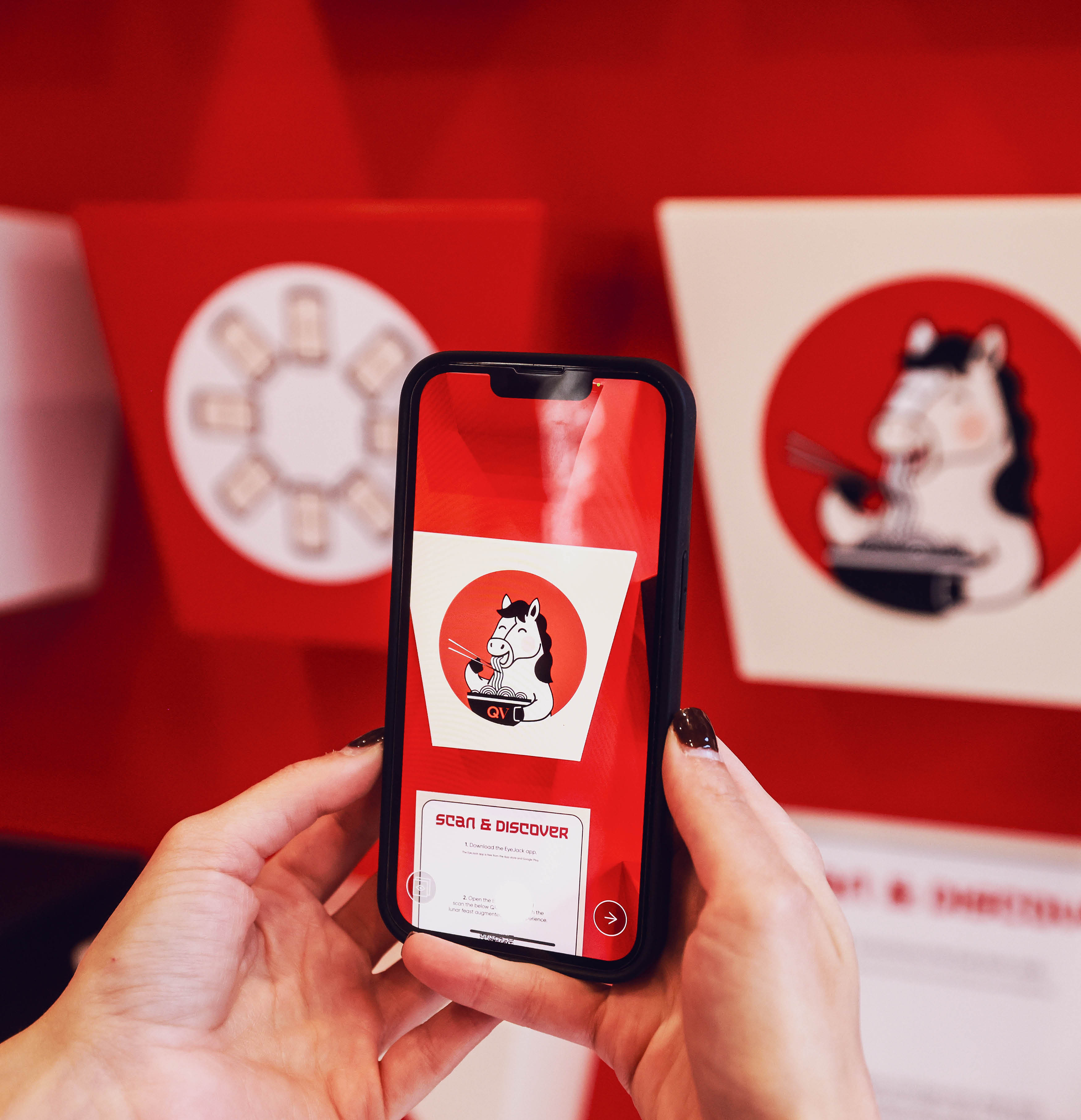 From concept to reality, we designed a playful, immersive noodle bar experience featuring giant takeaway boxes, oversized chopsticks, and AR magic via the EyeJack app. Symbolic dishes like prosperity fish, lucky oranges, and long-life noodles come to life right before your eyes!See More