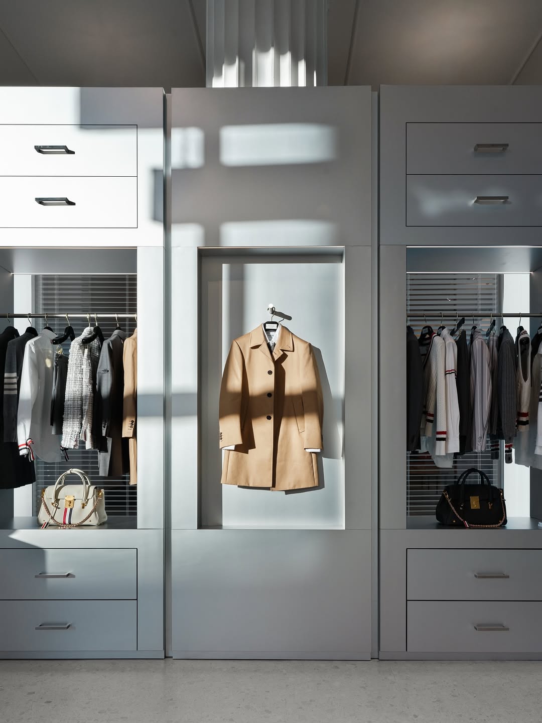 For the launch, The Corner Shop has been reimagined as an immersive “office fantasia.” The installation plays on Browne’s signature corporate aesthetic, with the space framed by crisp white blinds and steel office elements that evoke a surreal midcentury American bank—an environment familiar across the brand’s own retail network. At the entrance, an oversized water cooler anchors the narrative, a playful nod to office culture and the phrase “meeting at the water cooler.”