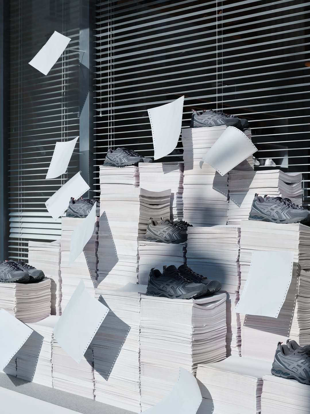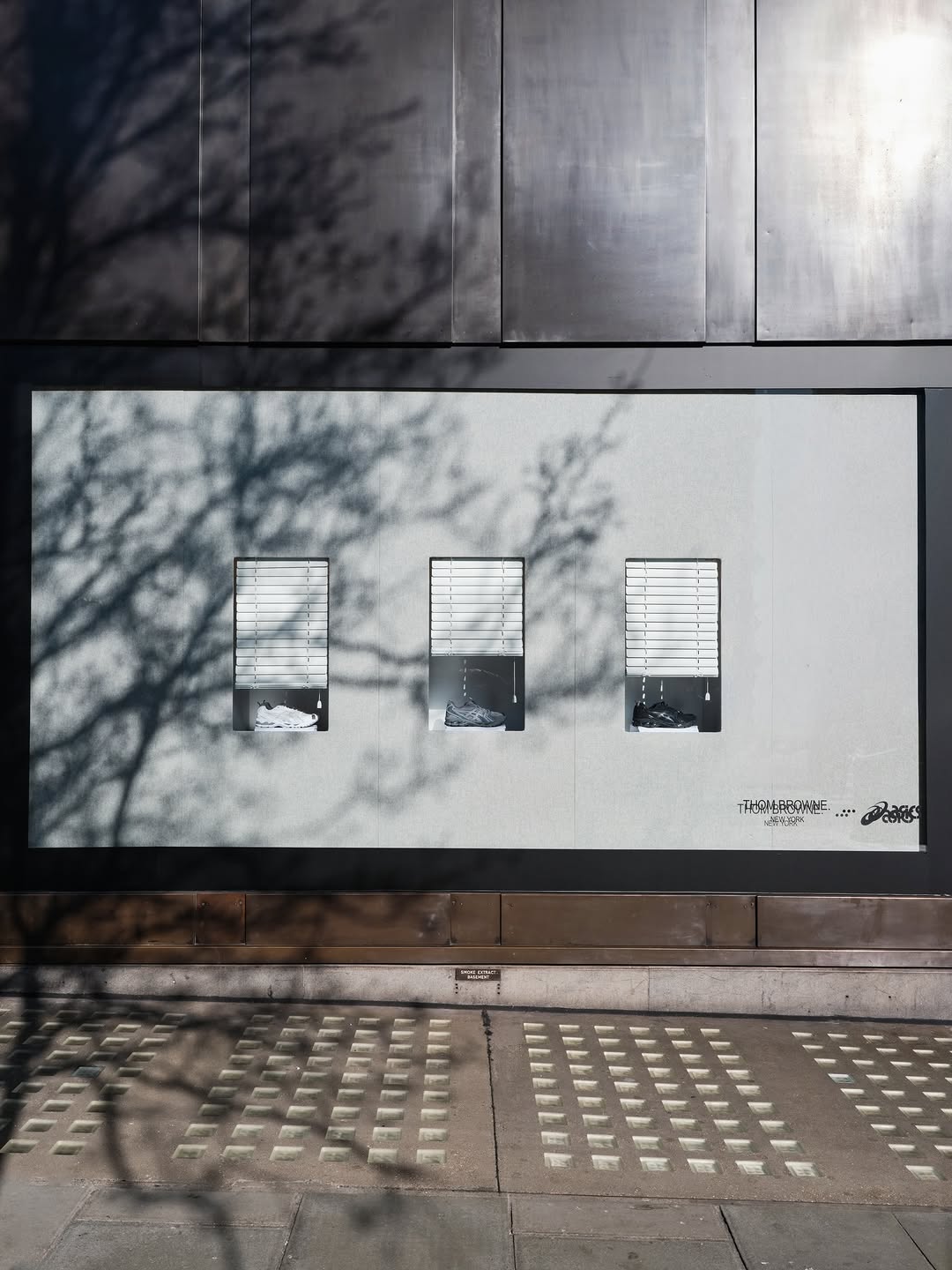 Along the Oxford Street windows, the ASICS Gel-Kayano 14 is displayed atop sculptural paper installations inspired by Browne’s iconic four-bar motif, turning the storefront into a graphic stage for the sneaker’s debut.